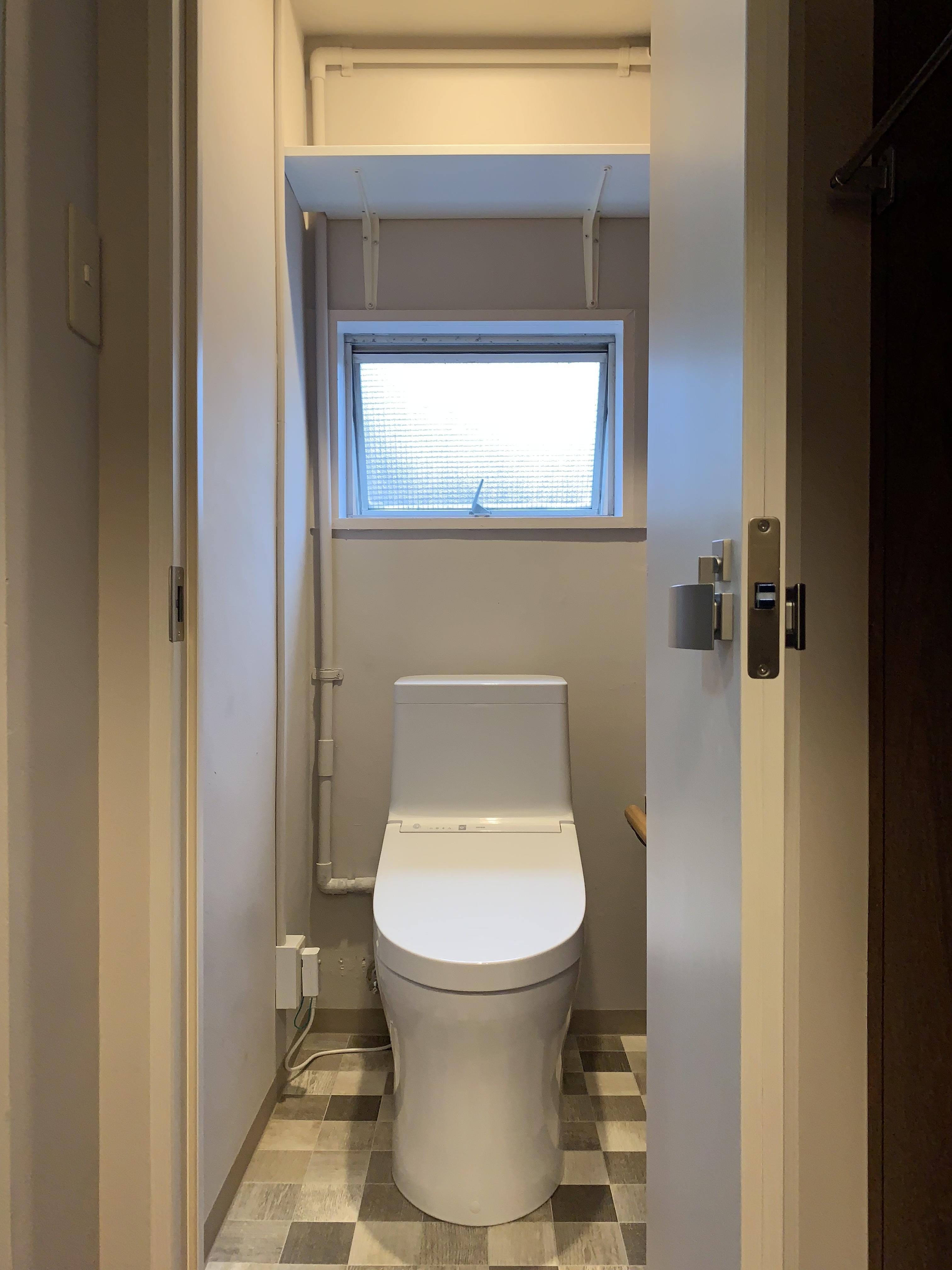 ドアを開けると、一段下がった薄暗く奥行の狭いトイレでしたが、白色の新しい扉を手前に設置する事で広くし、また床を上げフラットに。タイルの床材は、明るく軽やかな石目調のクッションフロアに変更しました。また、照明は消し忘れ防止に、人感センサー付きをご提案。清潔感のあるバリアフリートイレに生まれ変わりました。