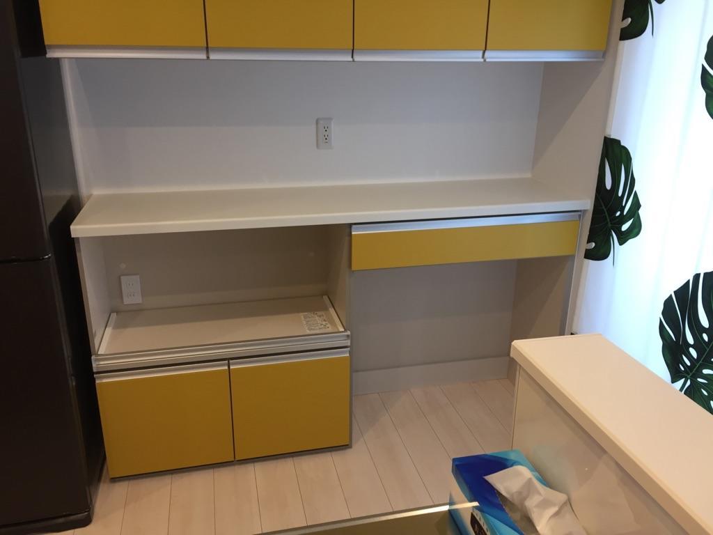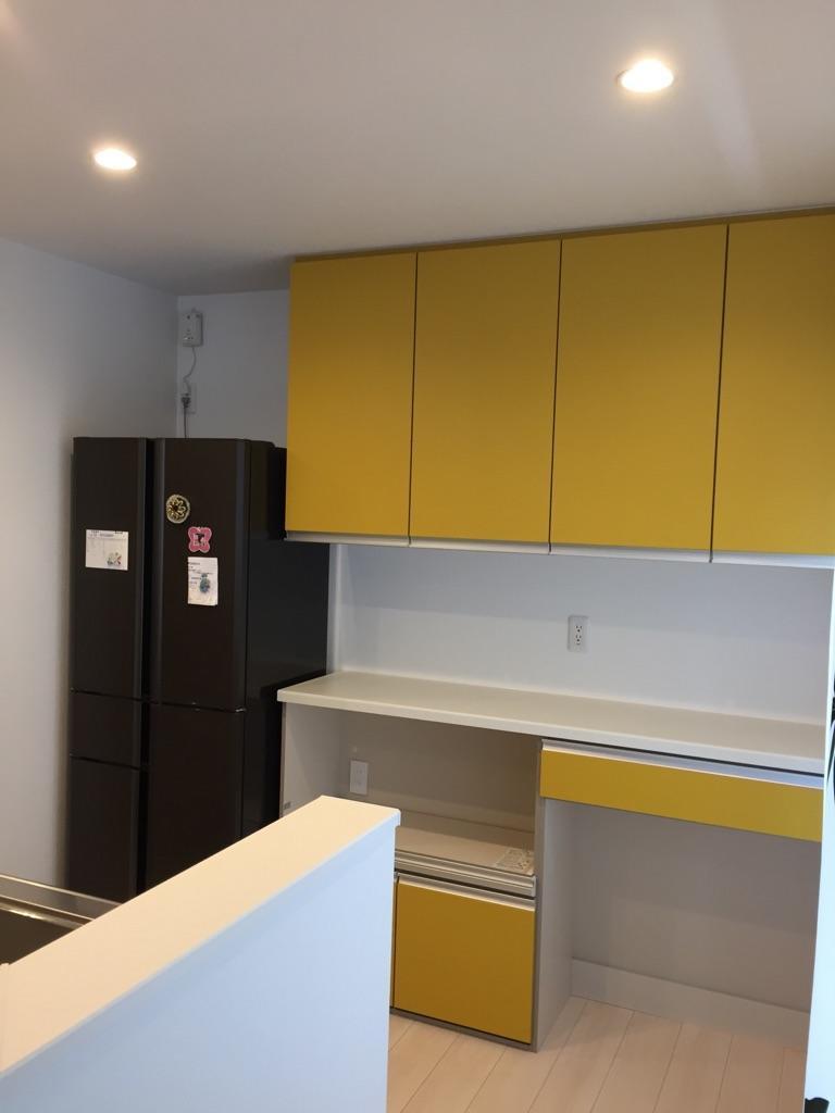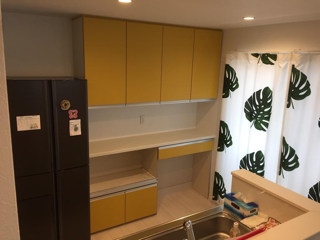 分譲住宅をご購入・お住まいになってしばらく・・・キッチンの後ろにあるスペースに家具屋さんで買った食器棚を置いていたが、使い勝手が良くなく、上部も有効活用できていなかったこと、さらに地震による転倒が心配だったために、LIXILの食器棚をつけることを決意。上下の収納の間を空けることで、たくさんお持ちの家電が全て置けるように。下の収納は炊飯器を置けるスペースとゴミ箱を置けるスペースを確保。S様にとってのキッチンが使いやすくなり、お部屋のアクセントとなる黄色とすることで見た目も気持ちも明るくなりました。
