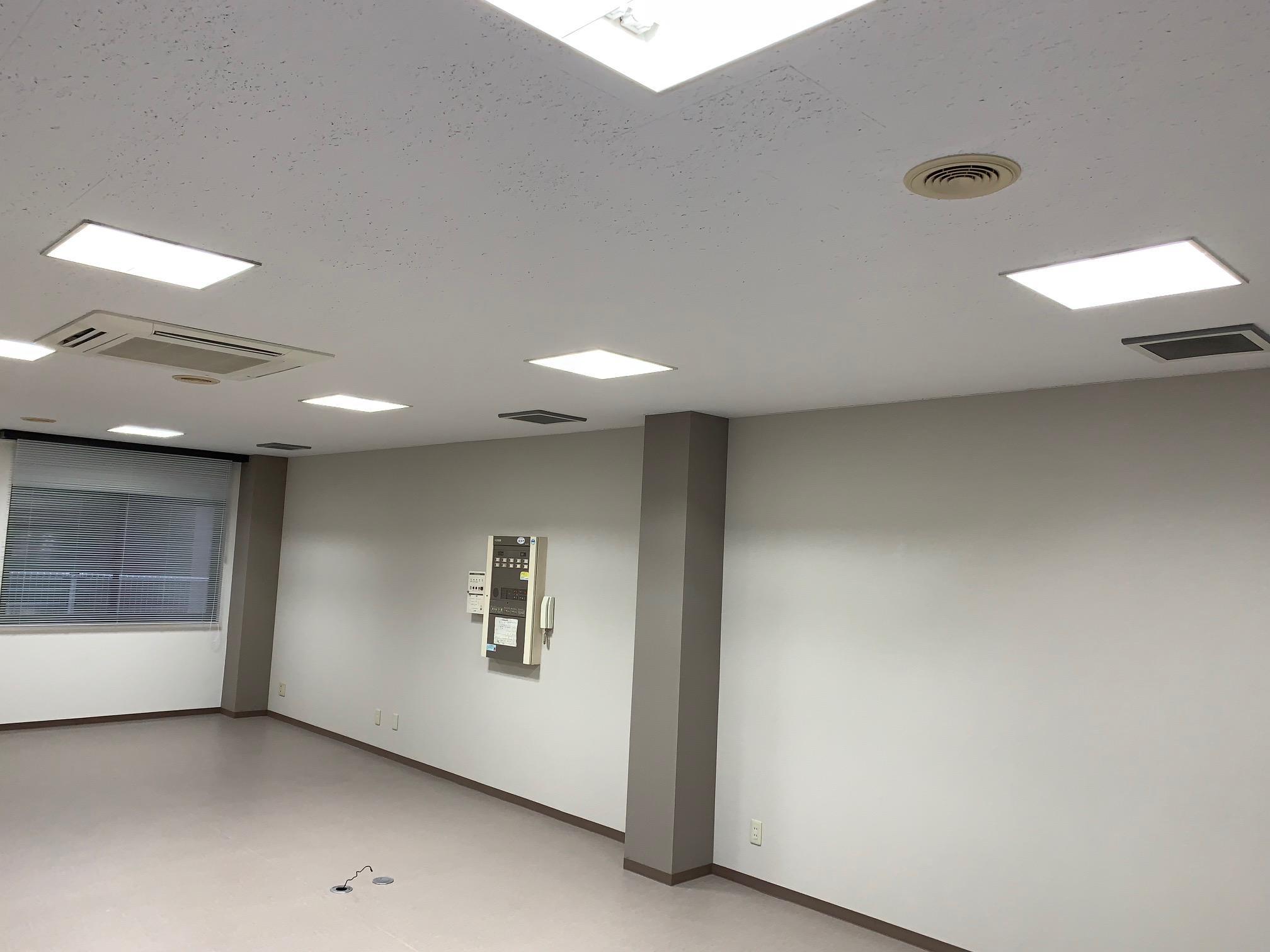 テナントチェンジを機に、内装リフォームのご依頼を頂きました。予算を抑える為、天井は塗装・・・、床は既存の上から新たにお掃除が楽なシートを貼りました。壁面にある3本の柱は優しい淡いブランクロス。巾木は濃いめのブランで空間を引きしまています。