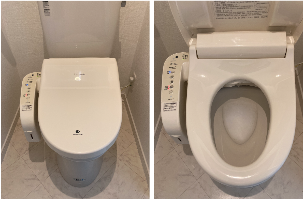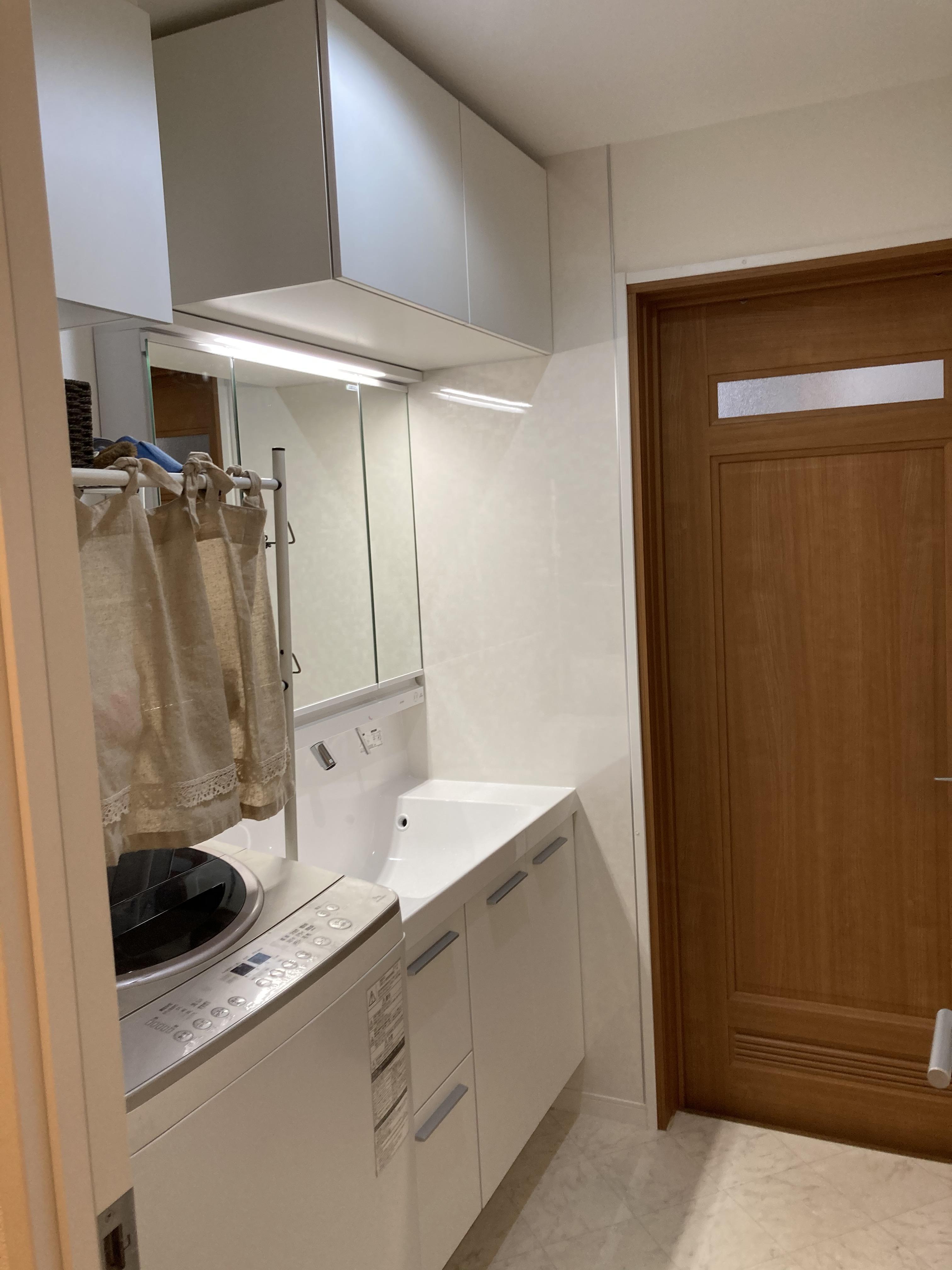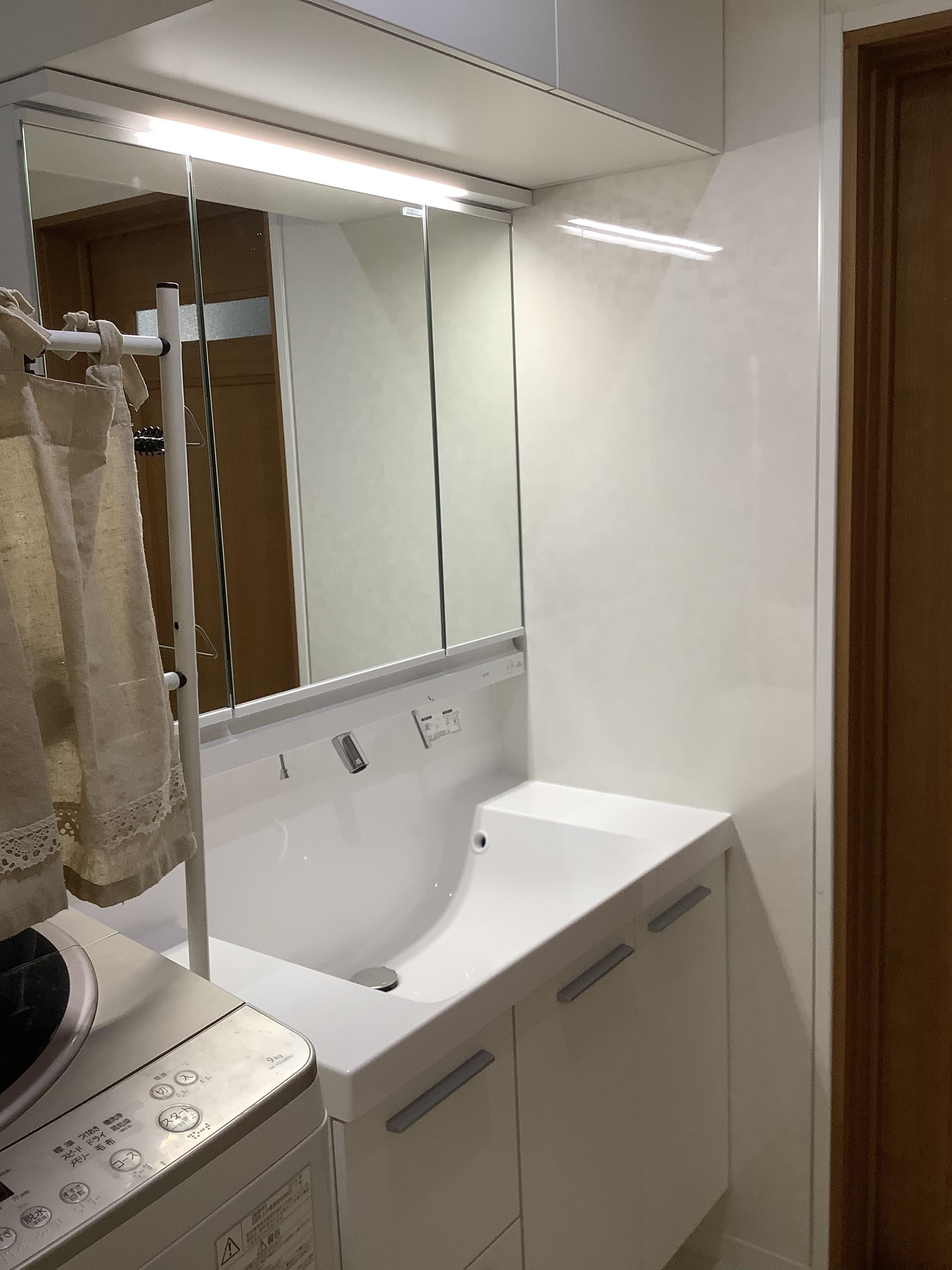 SOHOとしてご自宅&オフィスを兼ねているお客様。来客が多く洗面所を通過しトイレがあるため、生活感を隠したいとのご要望でした。洗面化粧台のミラー裏にむき出しのままだった小物をすべて収納し、洗面器から壁水栓一体型のタイプは水栓廻りに水がたまらずお掃除がとても楽に。また、側面がクロス仕上げの壁には、キッチンパネルを貼り水が跳ねても拭くだけOKになりました。トイレはリフォーム済みですが、来客時に男性が使用された後に感じる飛び跳ねとアンモニア臭を解消できる相談を受けましたので、泡コートできるウォシュレットに交換いたしました。