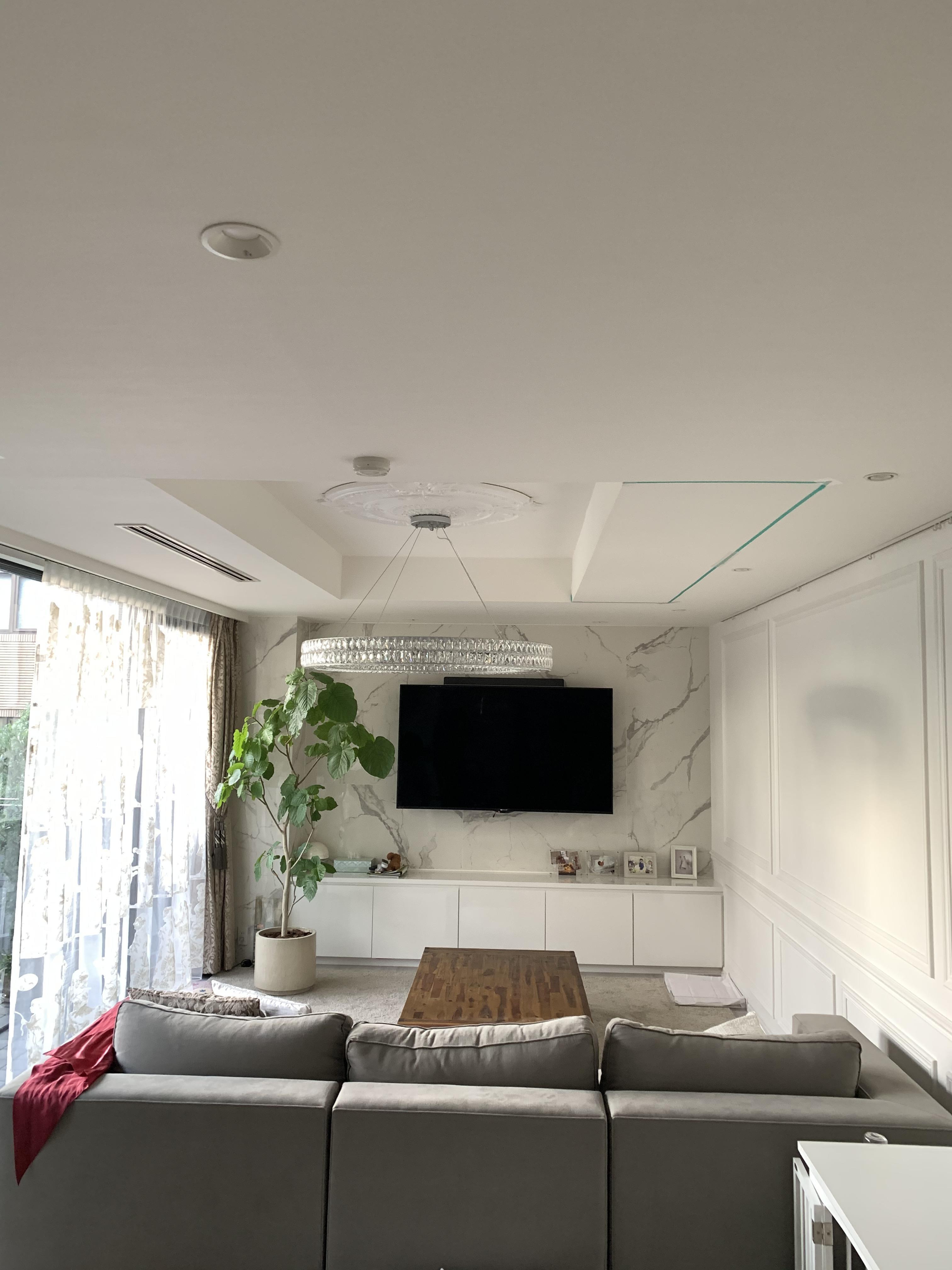 リビング側は、壁掛けTVの中心に照明器具が来るように。
