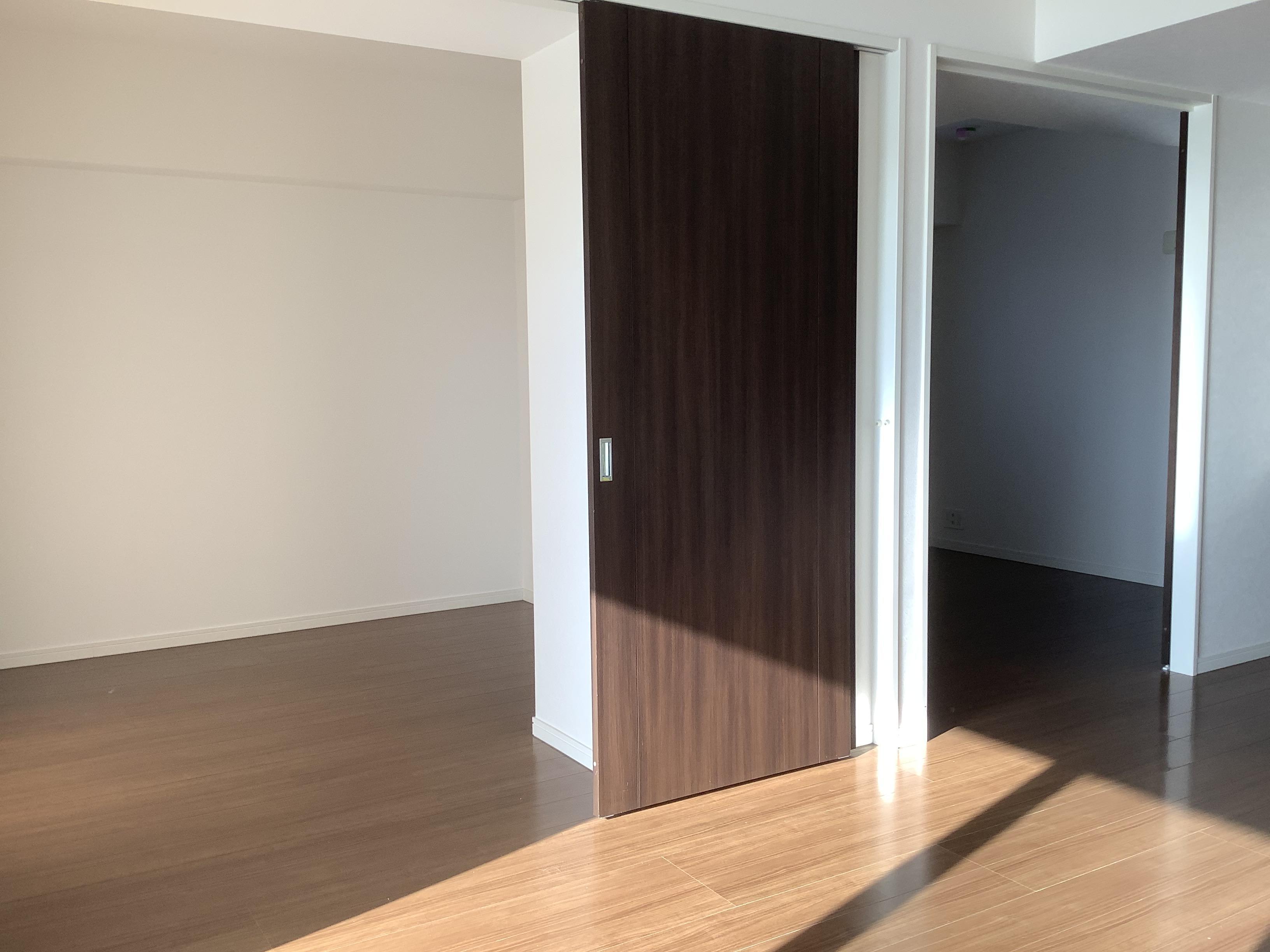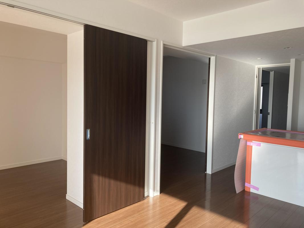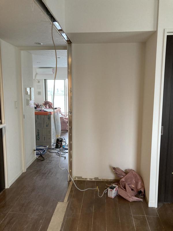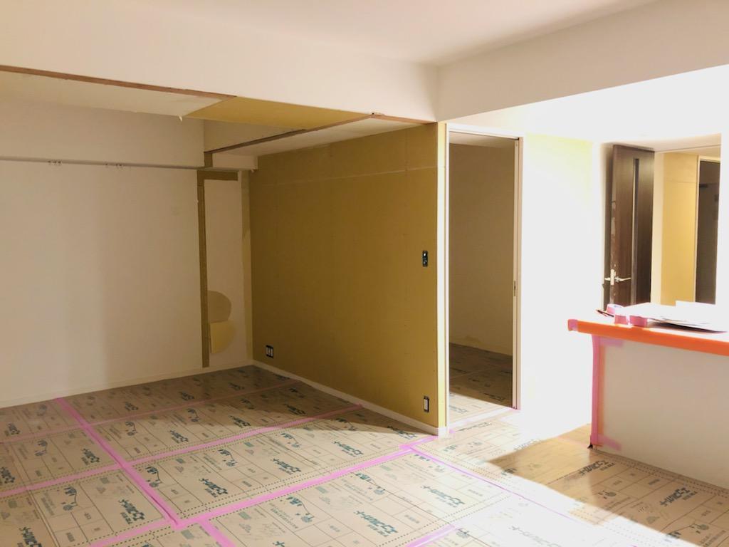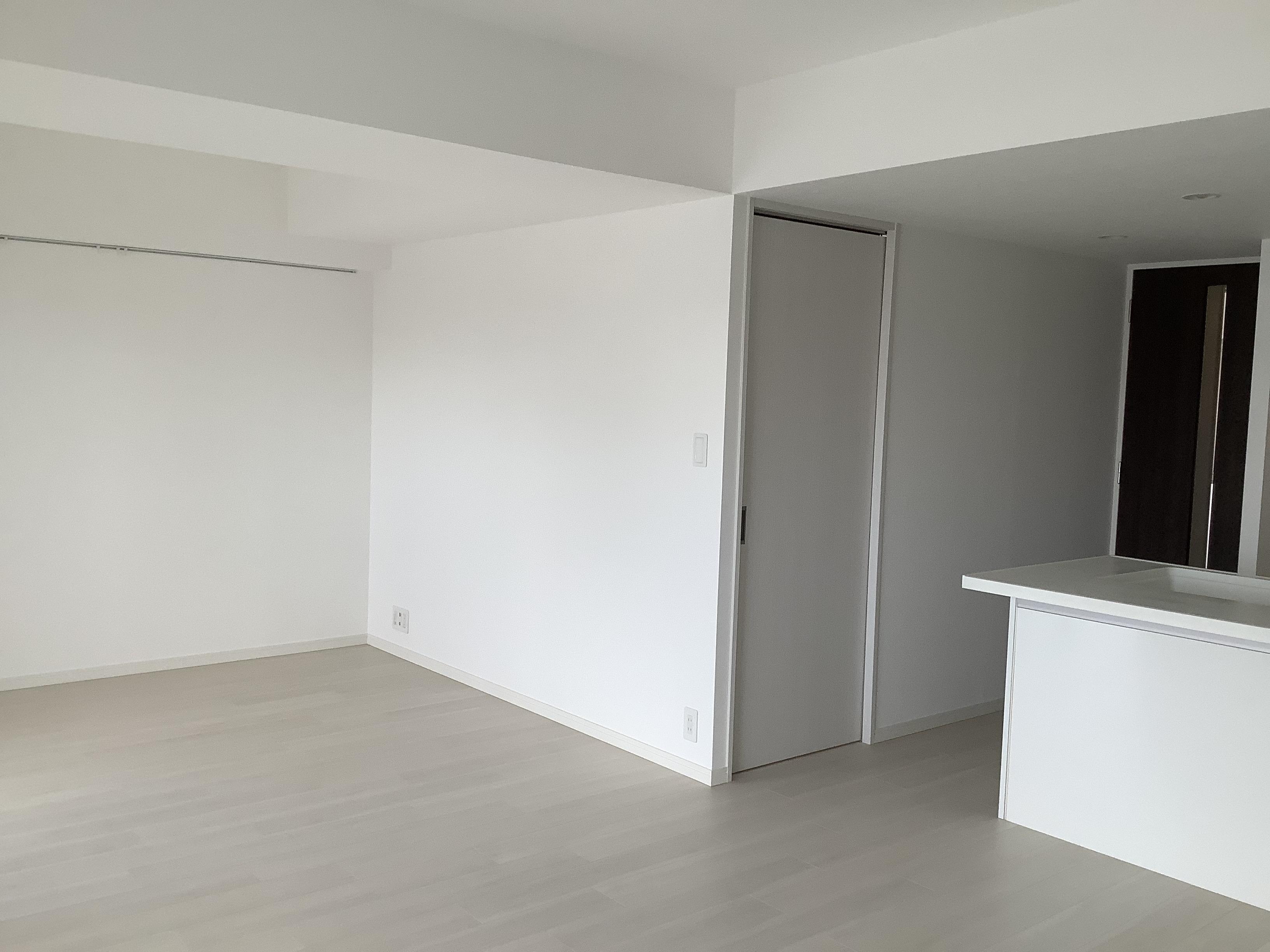 お引越しされる前に、気になる間取りをライフスタイルに合わせて予算内で変更されたいとのご要望でした。既存の床の上にフローリングを上張りし、リビングを少しでも開放的に広くするため、梁の下位置まで間仕切り壁を移設し、隣の洋室を狭めて4帖ほどのワークスペースとして活用できるようにしました。扉色も木目のホワイトになり、ベースとなる床・壁が明るくなることで圧迫感が解消されたと思います。
