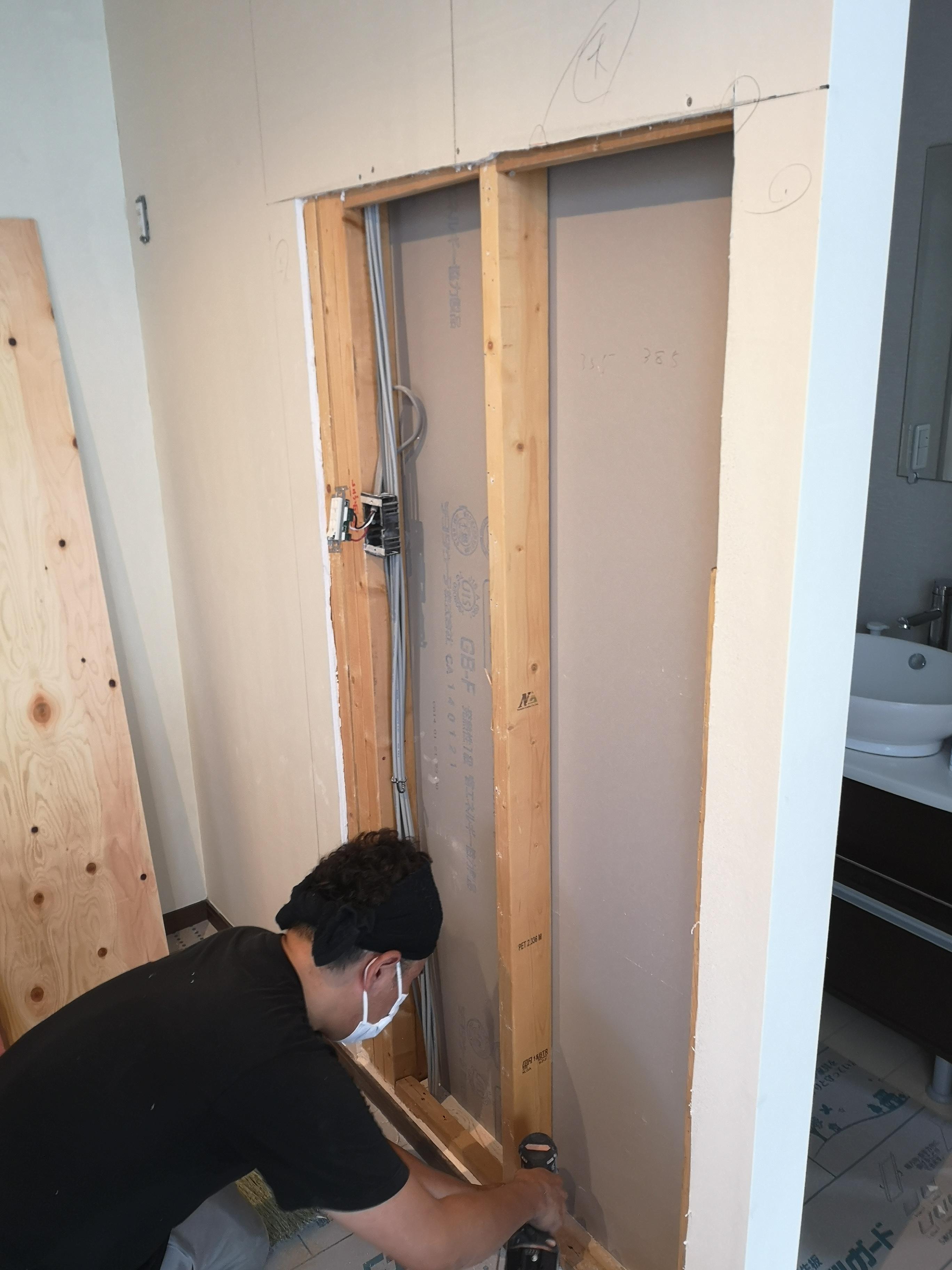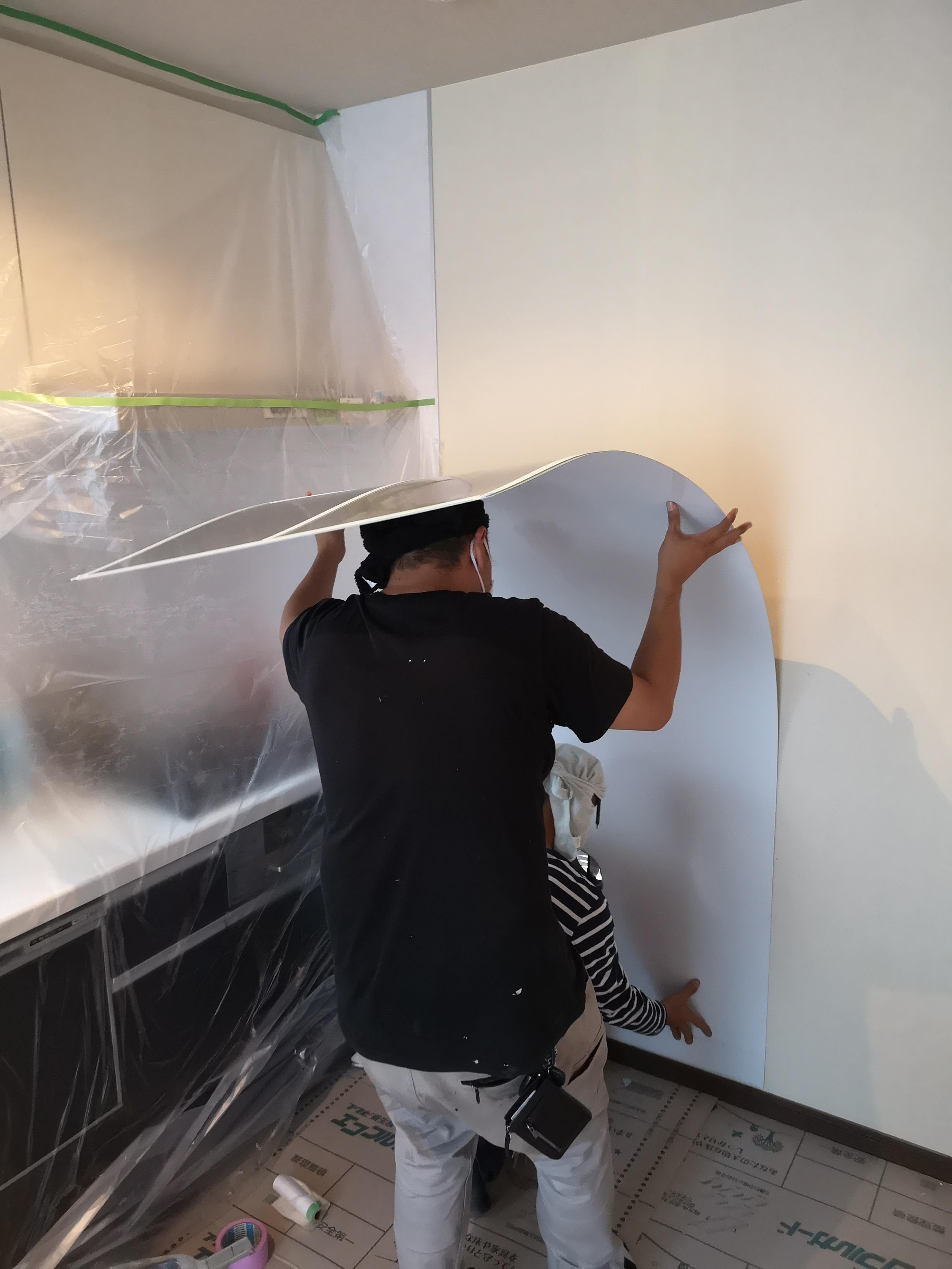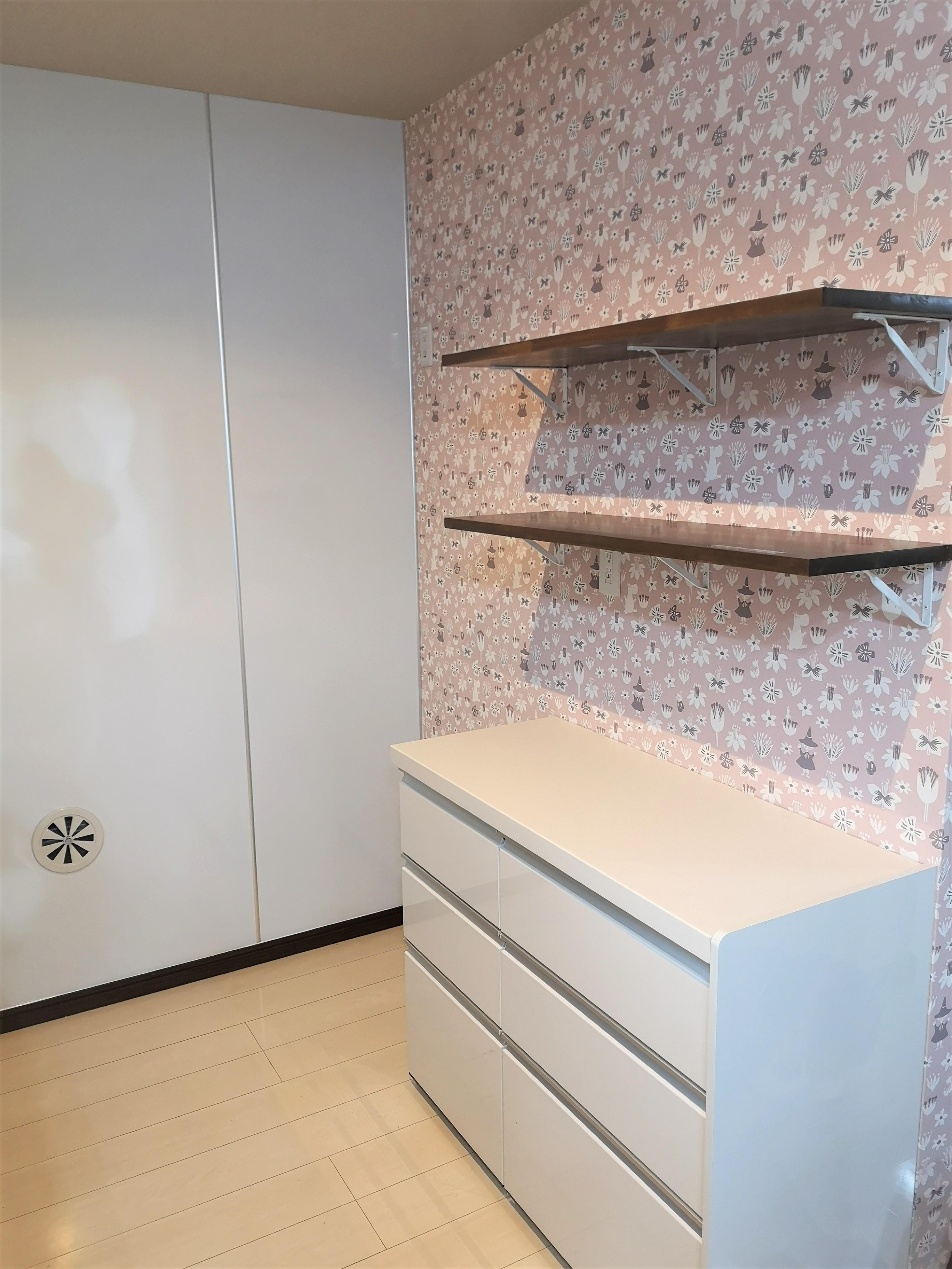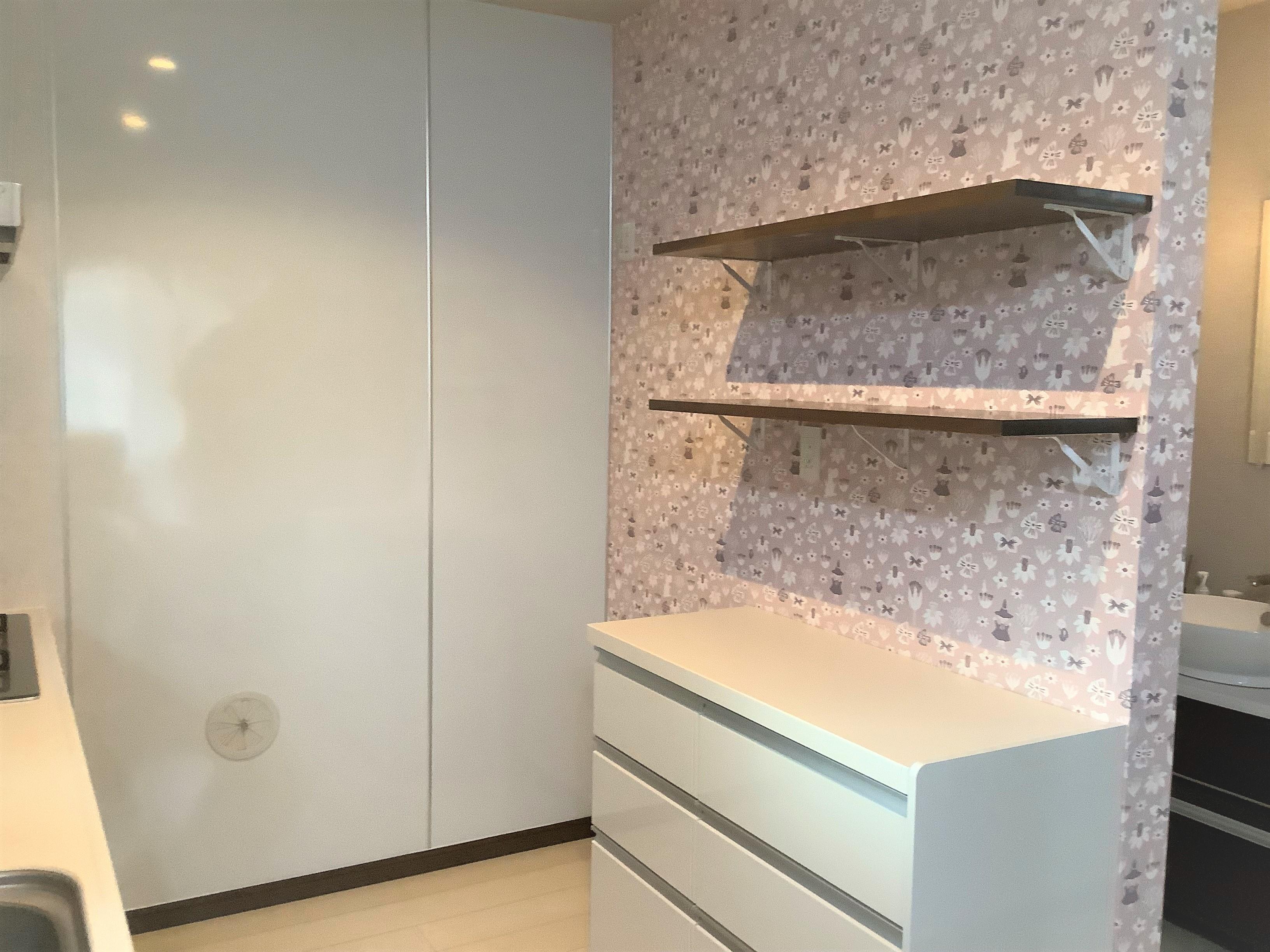 カップボードをすっきりさせ奥様のお気に入りスペースに。 毎日立つキッチンだからこそ、カラーやデザインをこだわってテンションの上がる空間にするため打合せを重ねました。 棚のお色を、既存の巾木や廻り縁のダークブラウン色を採用することで、明るく甘さのある空間にメリハリがつき統一感が出たと思います。