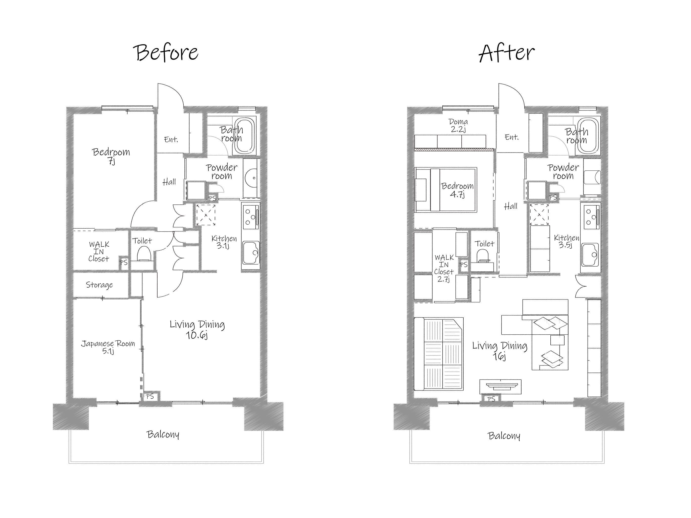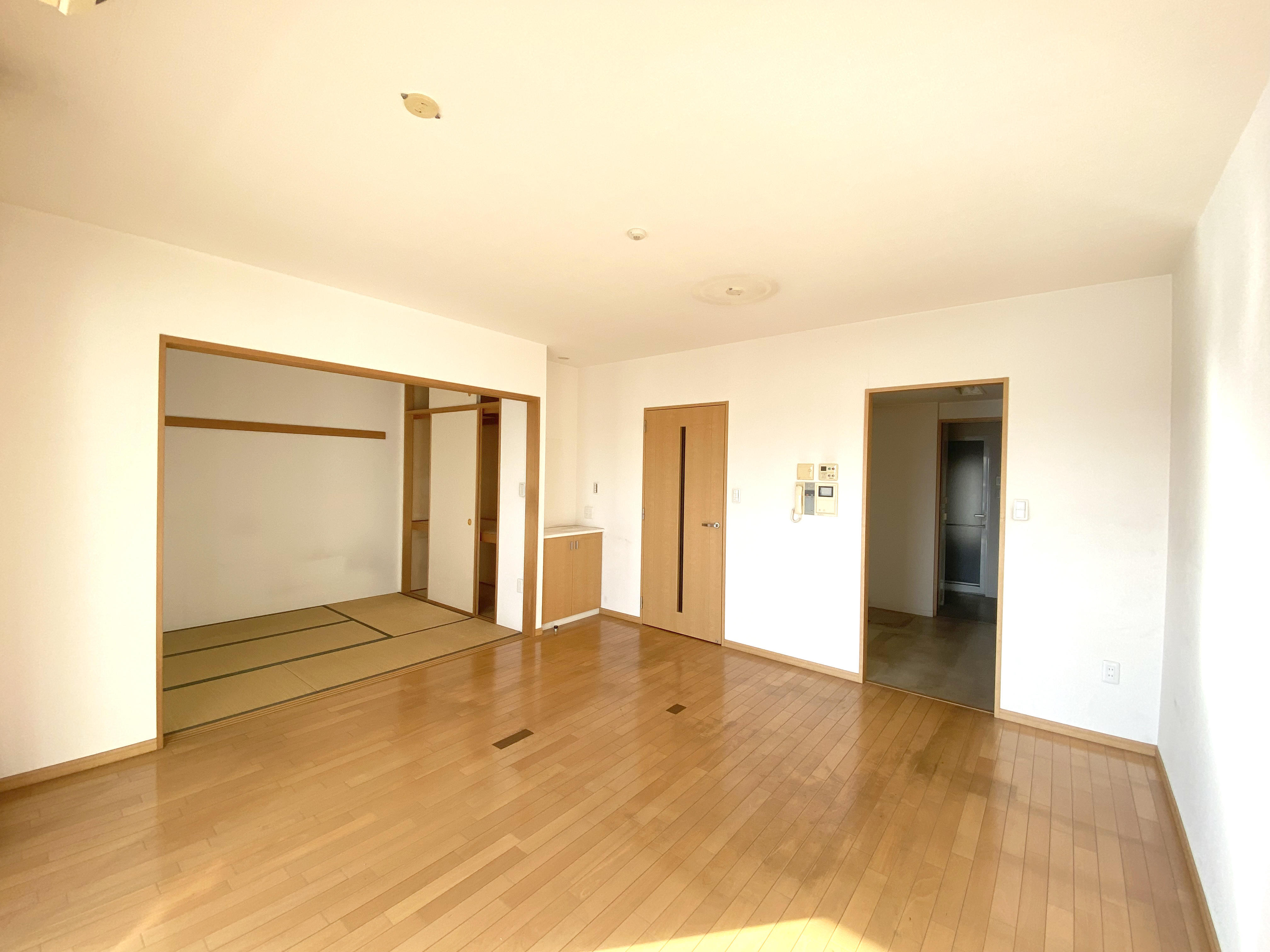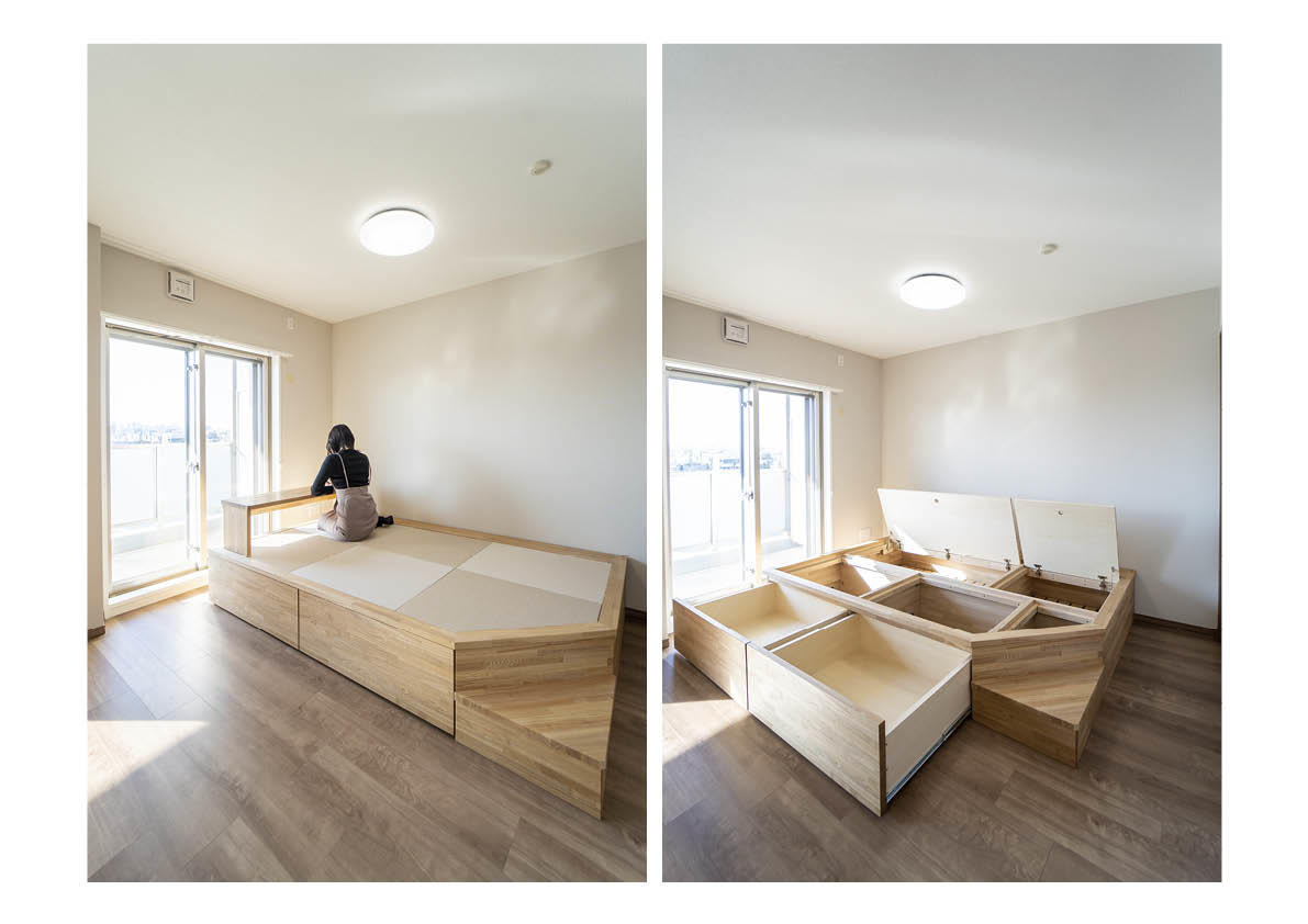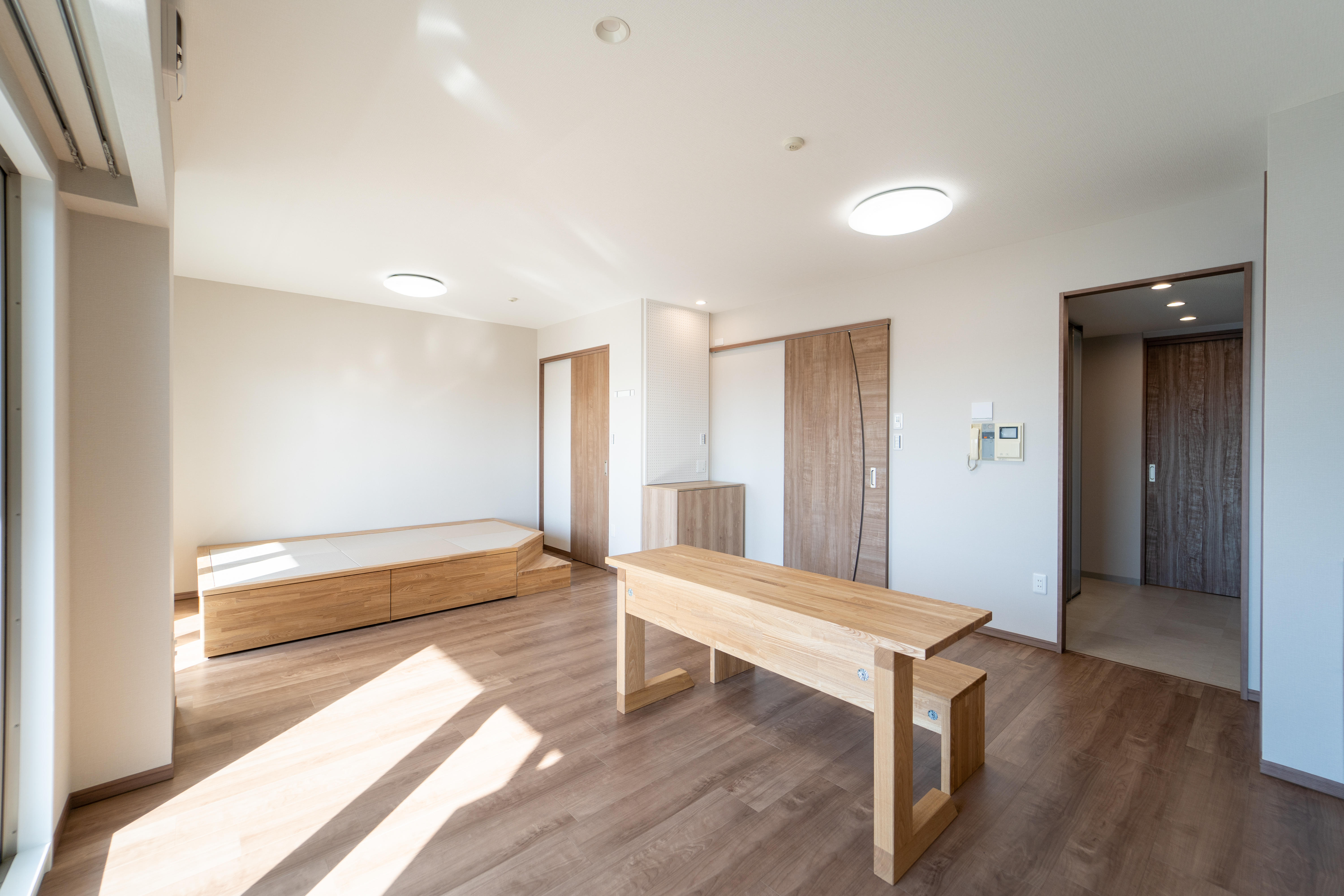 和室を撤去し16帖のリビングダイニングにしました。リビングダイニングの一部を小上がり畳にする事で高さ分の収納を確保し、機能性と多目的なスペースへ。夏には畳に腰を下ろした視線から花火を堪能できるそうです。元々断熱性の高い建物のため、冷暖房不要なN様邸。ドアは全て引き戸に変更して、部屋中の扉を開けて開放的かつ通気性の良いお家になりました。