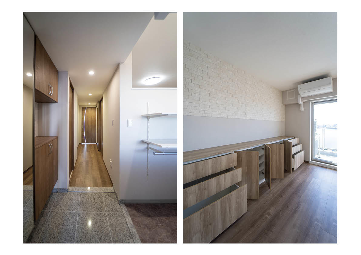 先述の小上がり畳や、キッチンクローゼット、ニッチなどで全体的に収納力のアップを計り、エントランスに土間収納を設けたのでこちらも大きく収納力のアップにつながっています。システム収納・キッチンクローゼット・洗面台はLIXILのハイスペックな設備で統一しております。