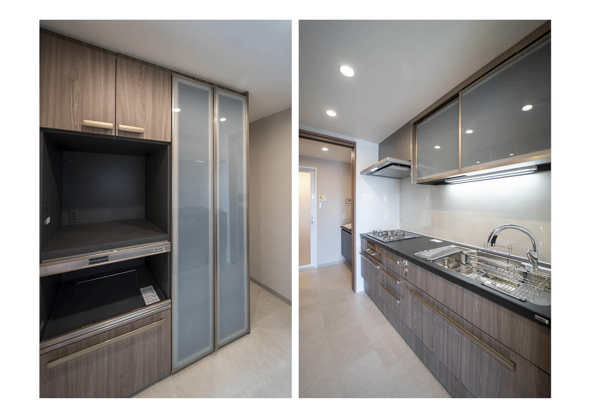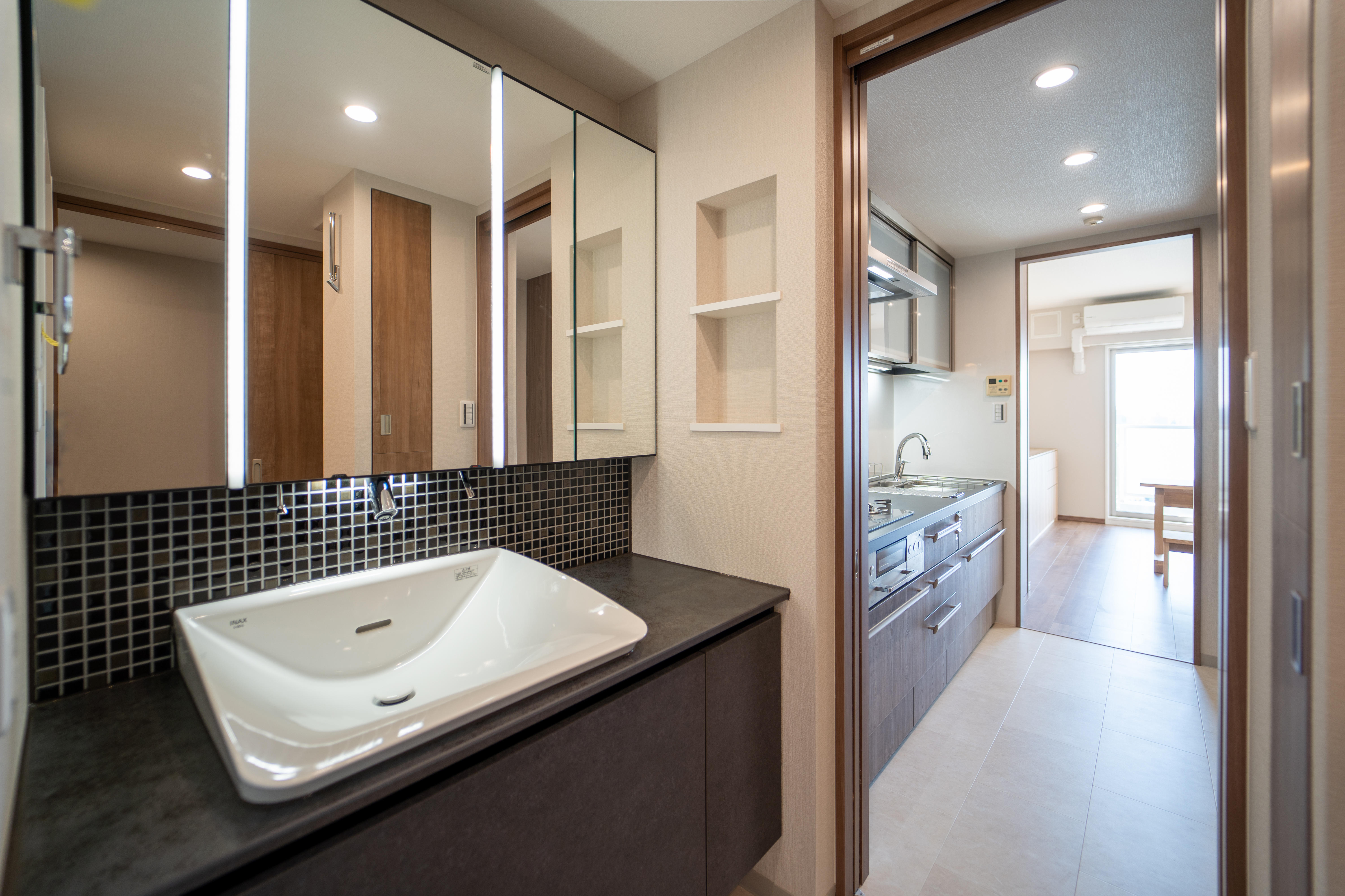 マンションリフォームのため、水廻りの移設や商材に制限もあり、打合せを重ねてご希望に近づけるよう進めて参りました。お客様のアイデアが満載なご自宅です。廊下から見える扉のデザインを変え遊び心エッセンスを。また、小上がり畳とダイニングテーブルは市販品ではなくご要望のサイズとデザインを設計し造作しました。長年使用する住宅設備には機能性とデザイン性を備えたLIXILのハイグレード商品を採用しました。ショールームへお客様と来館しセラミックカウンターの使用感や高さ・動作確認・デザイン色を確認し選んでおります。室内とは違う高級感のあるダークトーンなキッチンと洗面台が際立っております。