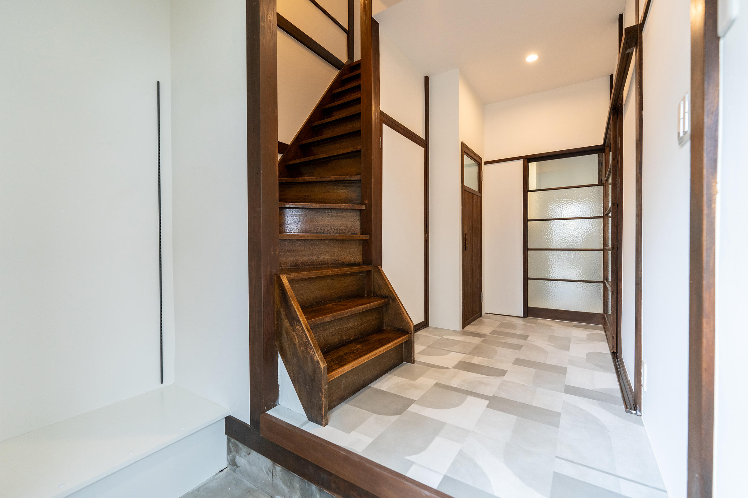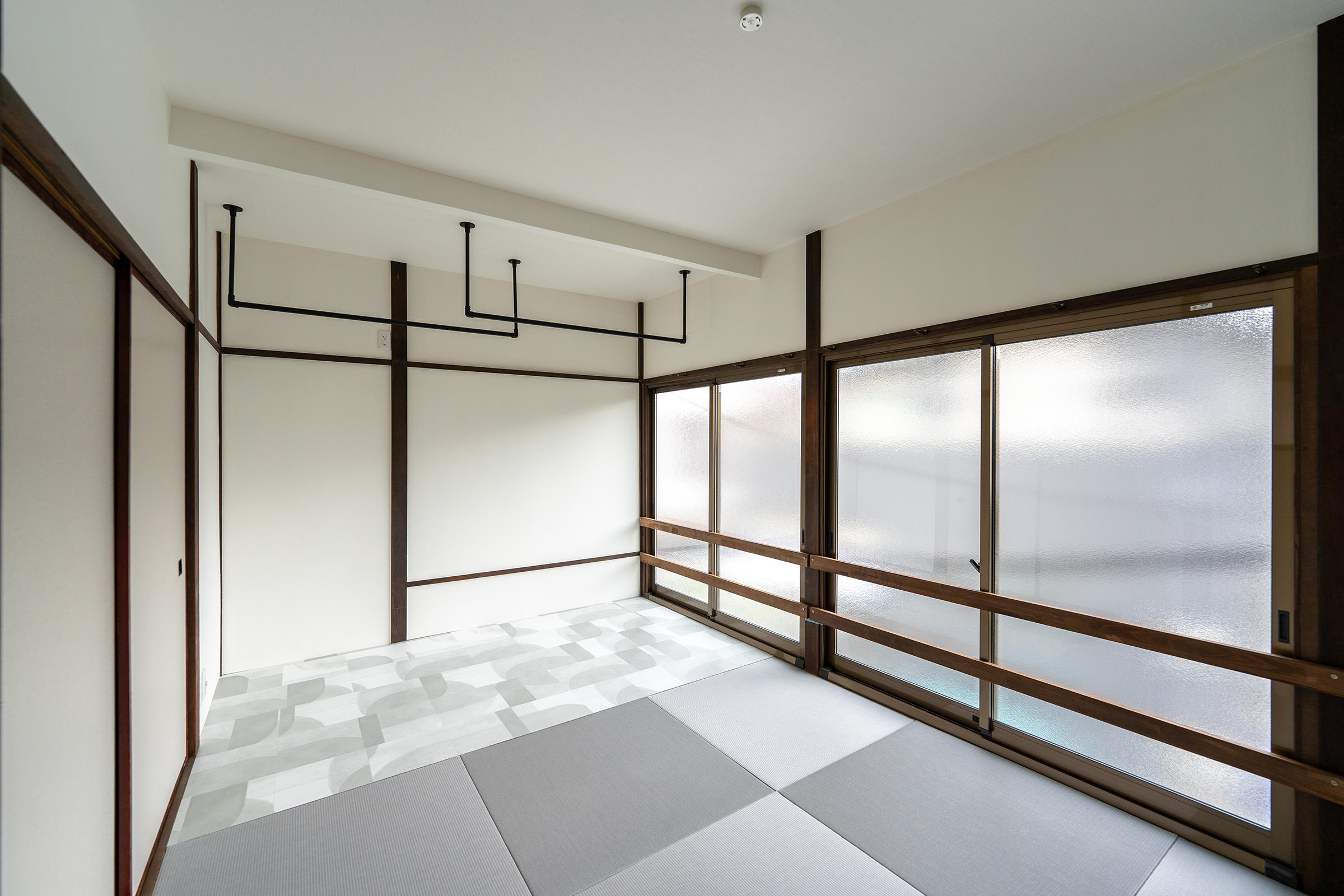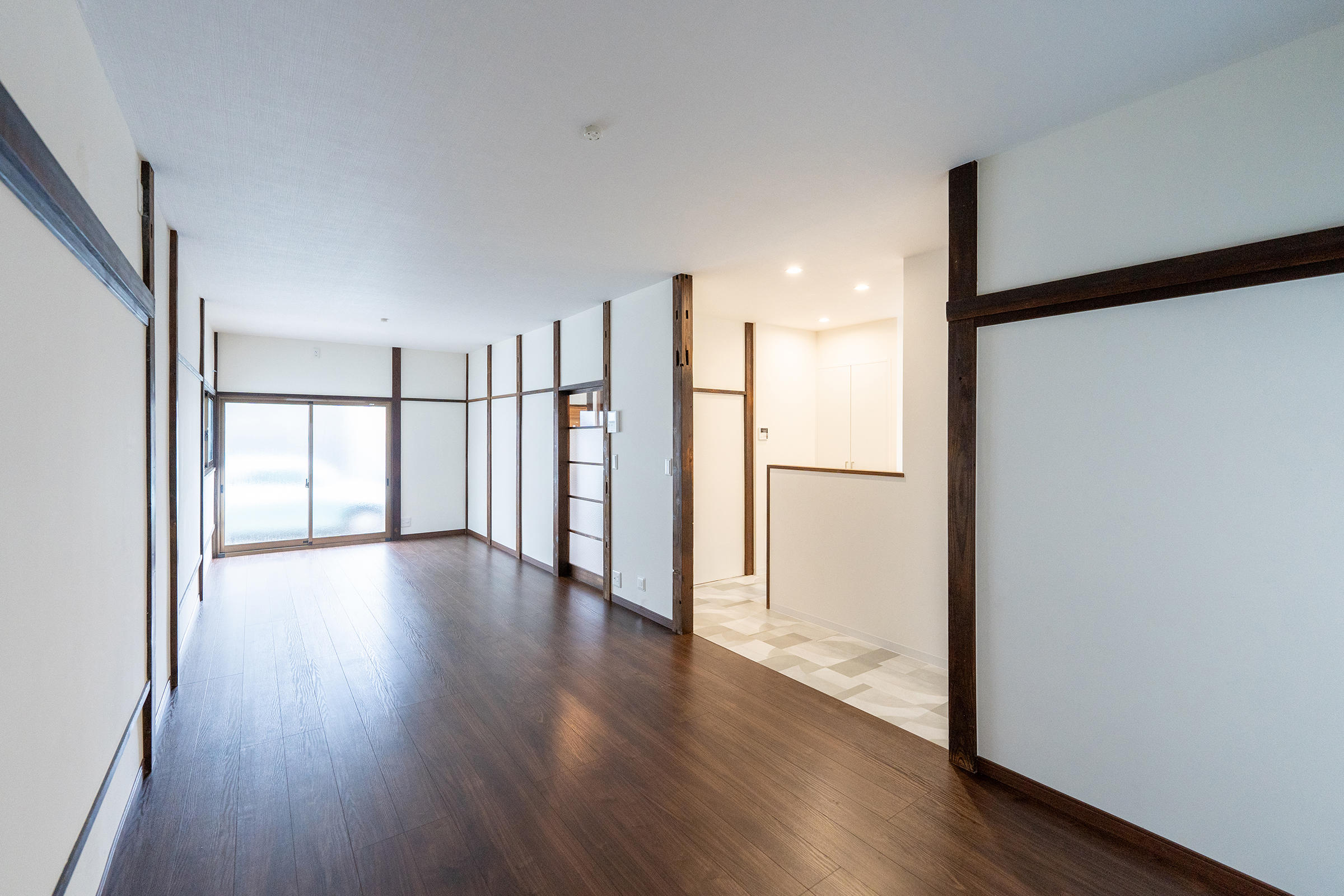 今回で3回目のご依頼を頂いた、東向島にある築70年の戸建リフォームです。ファミリー向けの賃貸として、収益に繋がる様プランニングさせて頂きました。1Fは広いダイニング・6帖の和室が2室・バランス釜のお風呂。2Fは、4.5帖/6帖/7.5帖の和室が3室。窓が多かったですが、近隣の家に光が遮られており、また塗り壁も経年劣化により汚れが染み込みとても薄暗い環境でした。今回は、予算削減も兼ね、古き良き建具や柱を残すミックス空間でご提案させて頂いたリフォーム実例です。