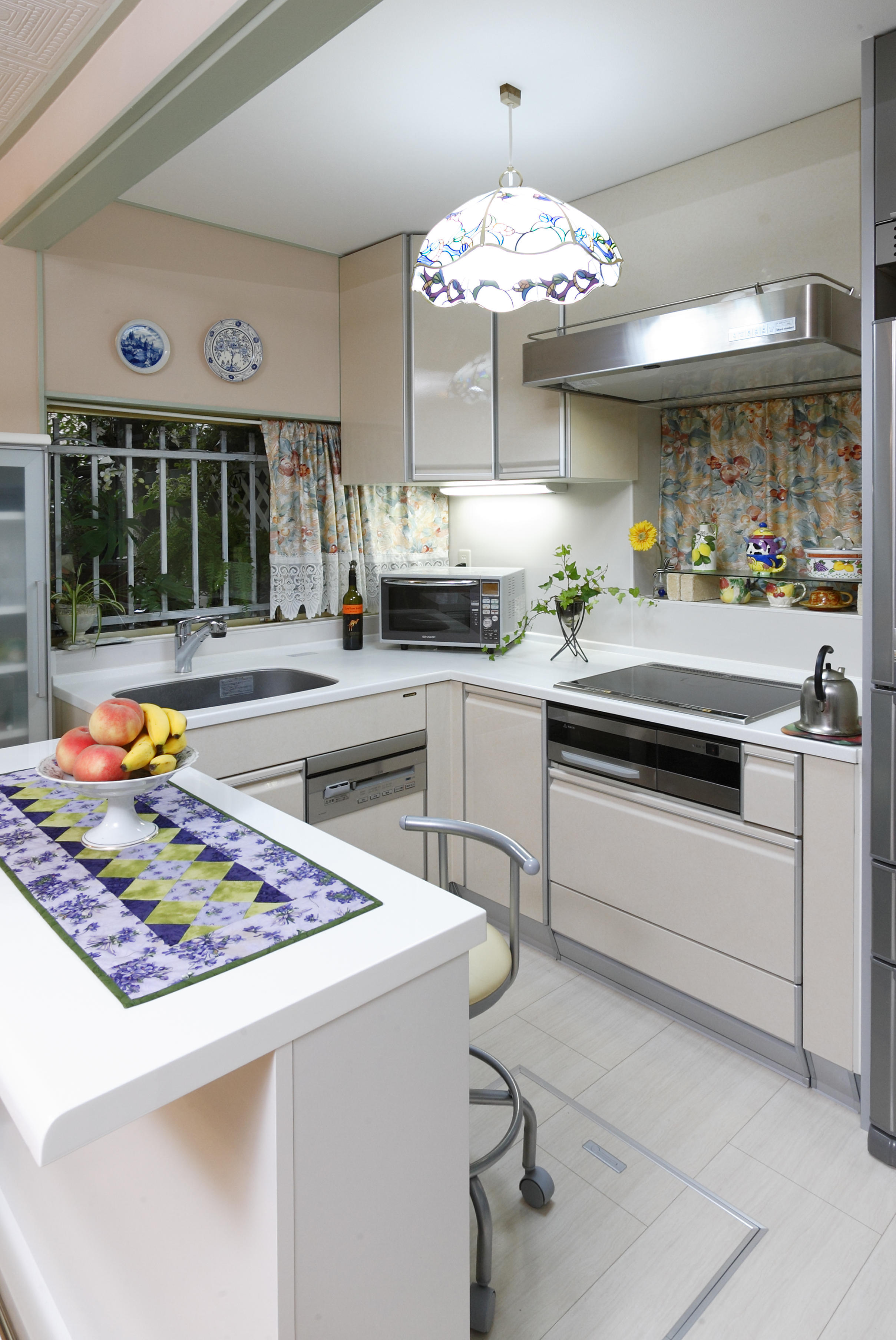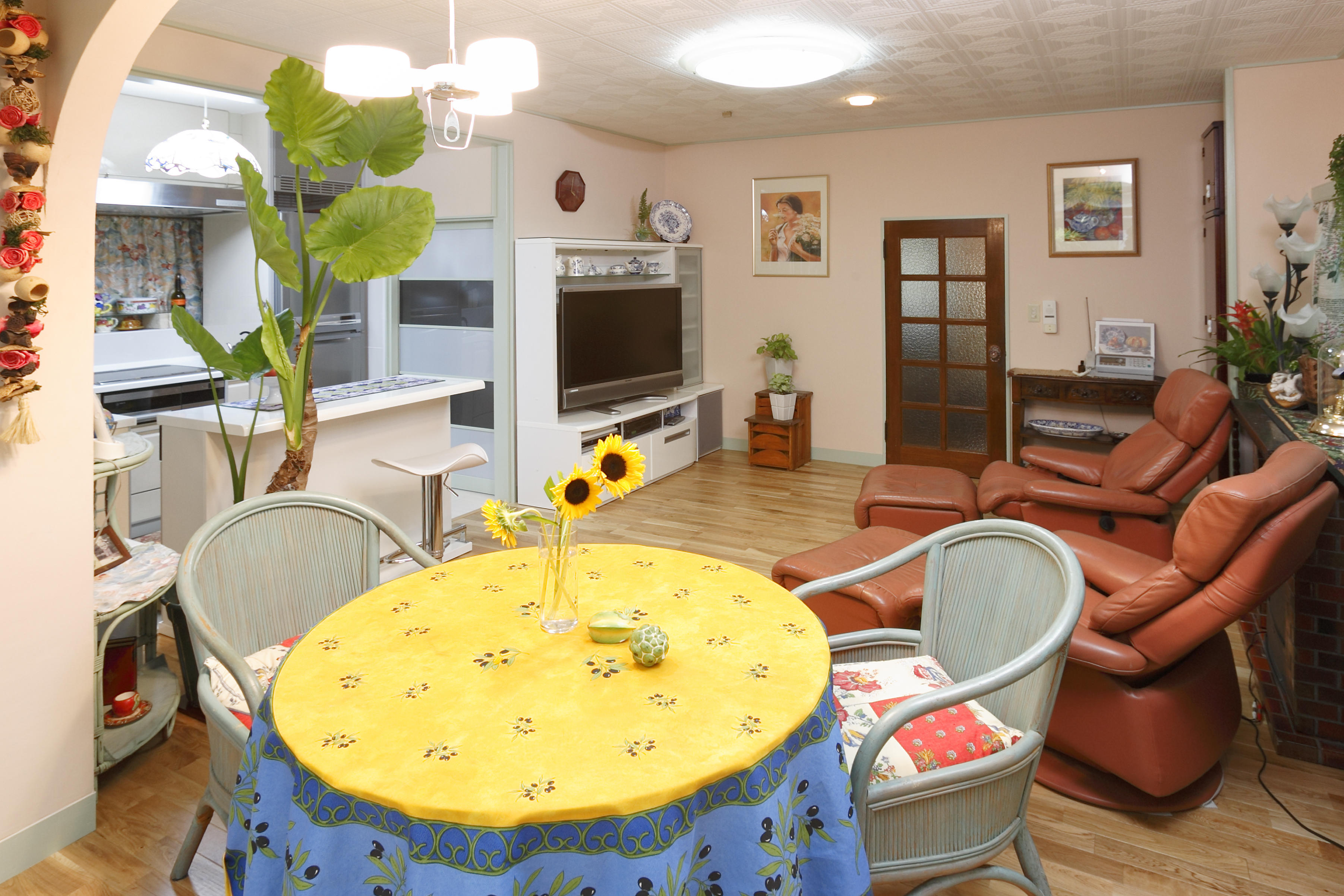 「終(つい)の棲み家」という思いを込めて夢が詰まった自分流の暮らし方を実現。”気軽に楽しく快適に暮らしたいというコンセプトのもと、一部を増築、リビング、キッチン、外装、さらにはギャラリーコーナー、庭園造りとリフォーム箇所は多岐にわたりました。リビングにはサンルームを開口して、広々とした南欧風に。L型の対面式キッチンを中心に明るく開放感溢れるスペースに生まれ変わりました。アーチ形のゲートが空間にアクセントを与えています。