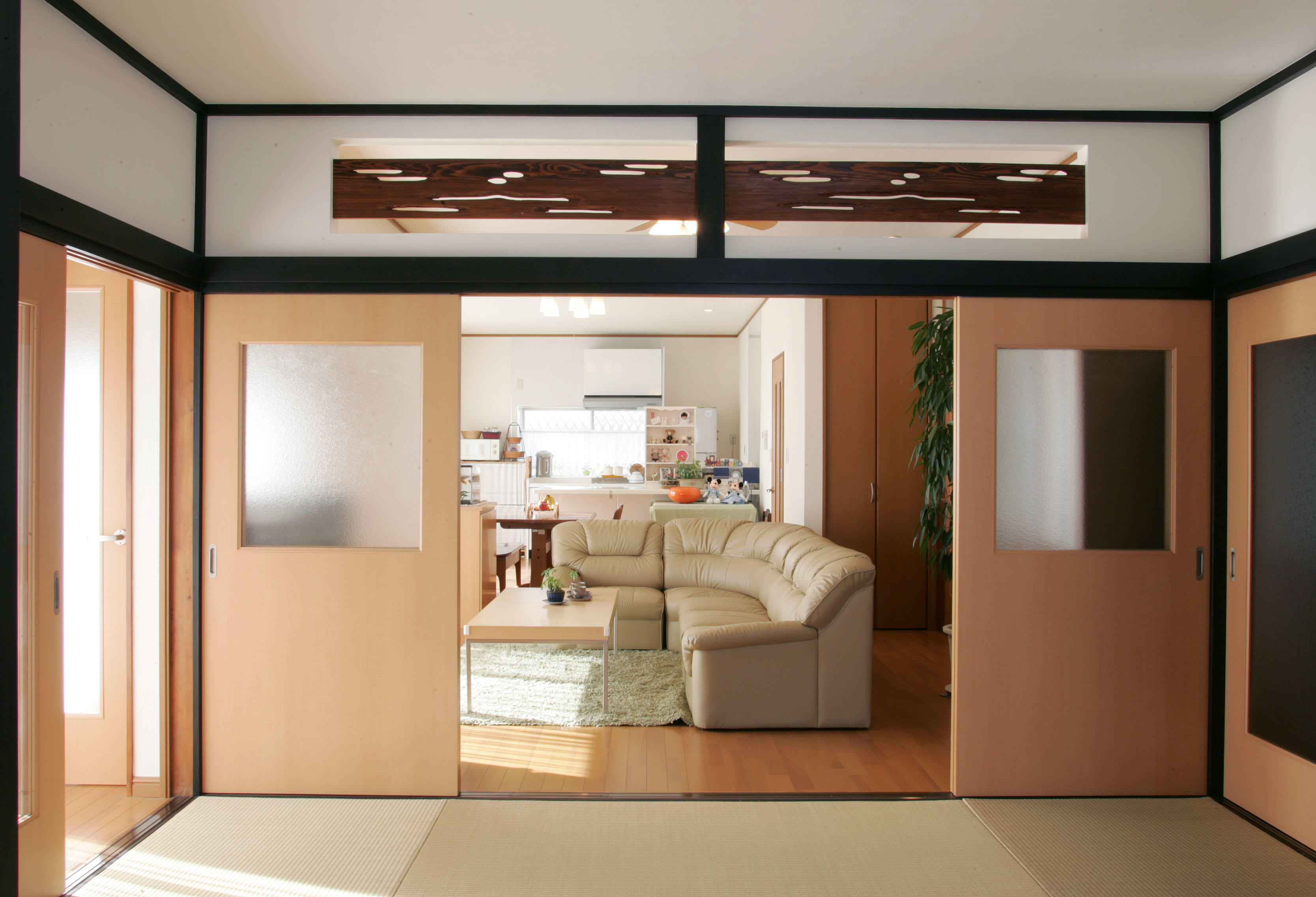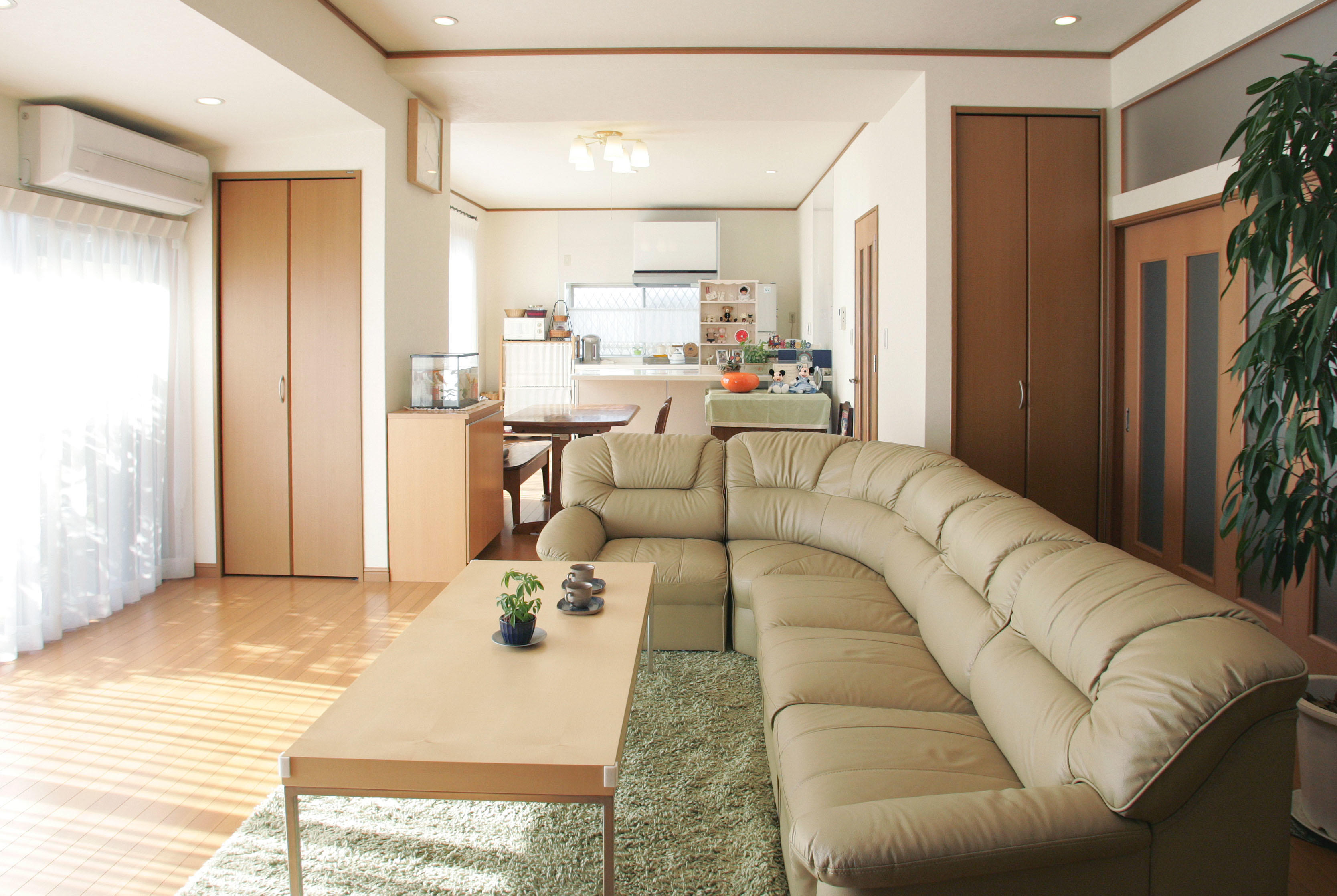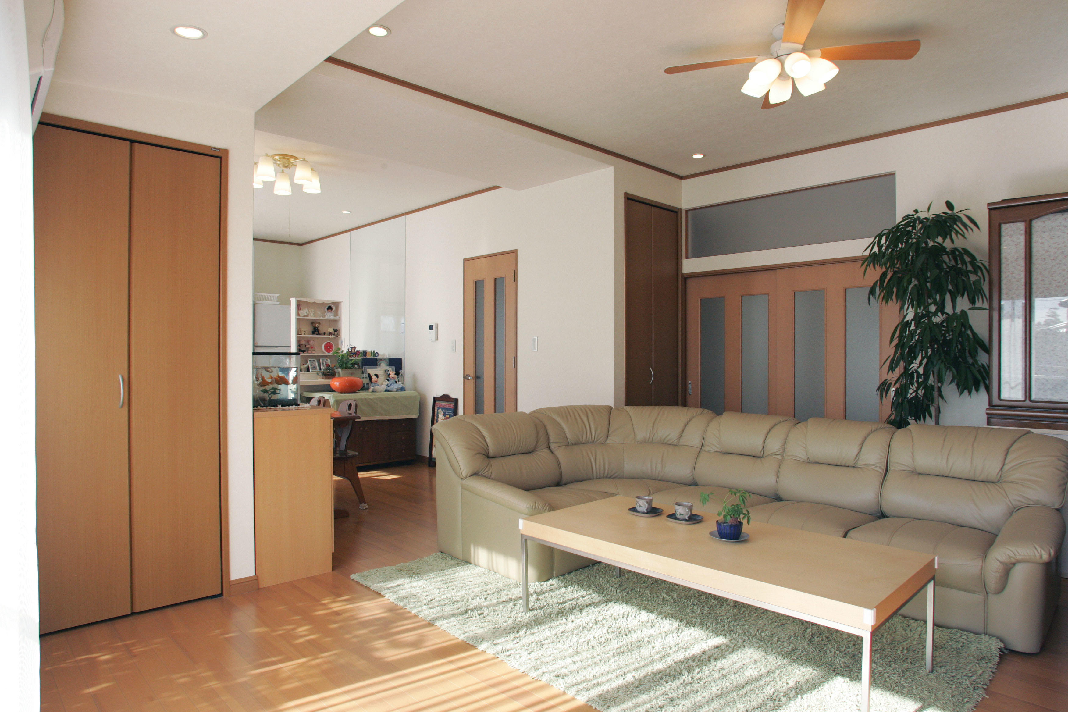 今までは台所は北側、そんな常識がありました。M様のお宅もそのケース。台所は狭く、暗いものでした。まずはキッチンを陽当たりの良い南側に移し、そのキッチンを中心に広々とした、一体感のあるLDを再構成。もうひとつのリフォームポイントは生活動線の無駄をなくし、室内をスムーズに移動できるようにすること。キッチン→LD、そして和室は引き戸を開け放てば、室内がすべてスムーズに回遊できるようになりました。