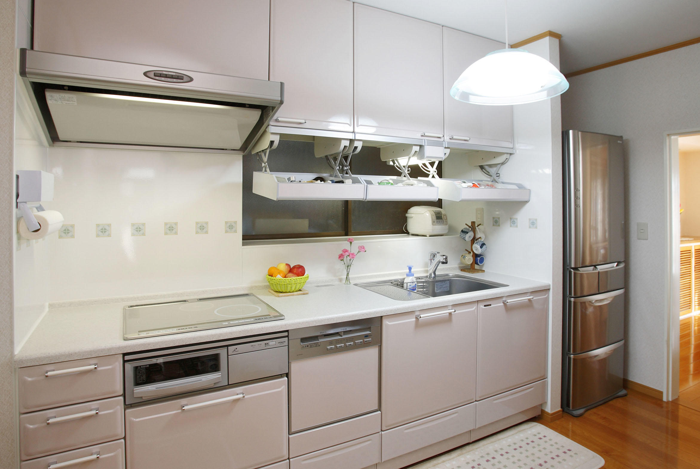 外観については早速、セラミックシリコンの再塗装で強く美しく生まれ変わりました。内部については間取りそのものはほとんど生かし、水廻りをすべて最新の設備にリニューアル。ショールームで一目惚れしたキッチン。IHクッキングヒーターを搭載しています。トイレについては従来脇についていた収納スペースをつぶし、トイレそのものを大きくしました。将来のことも考え、ドアもスウィングドアにして車いすでも利用できるよう配慮しています。