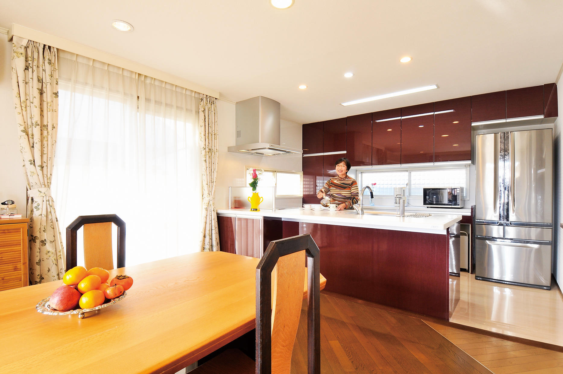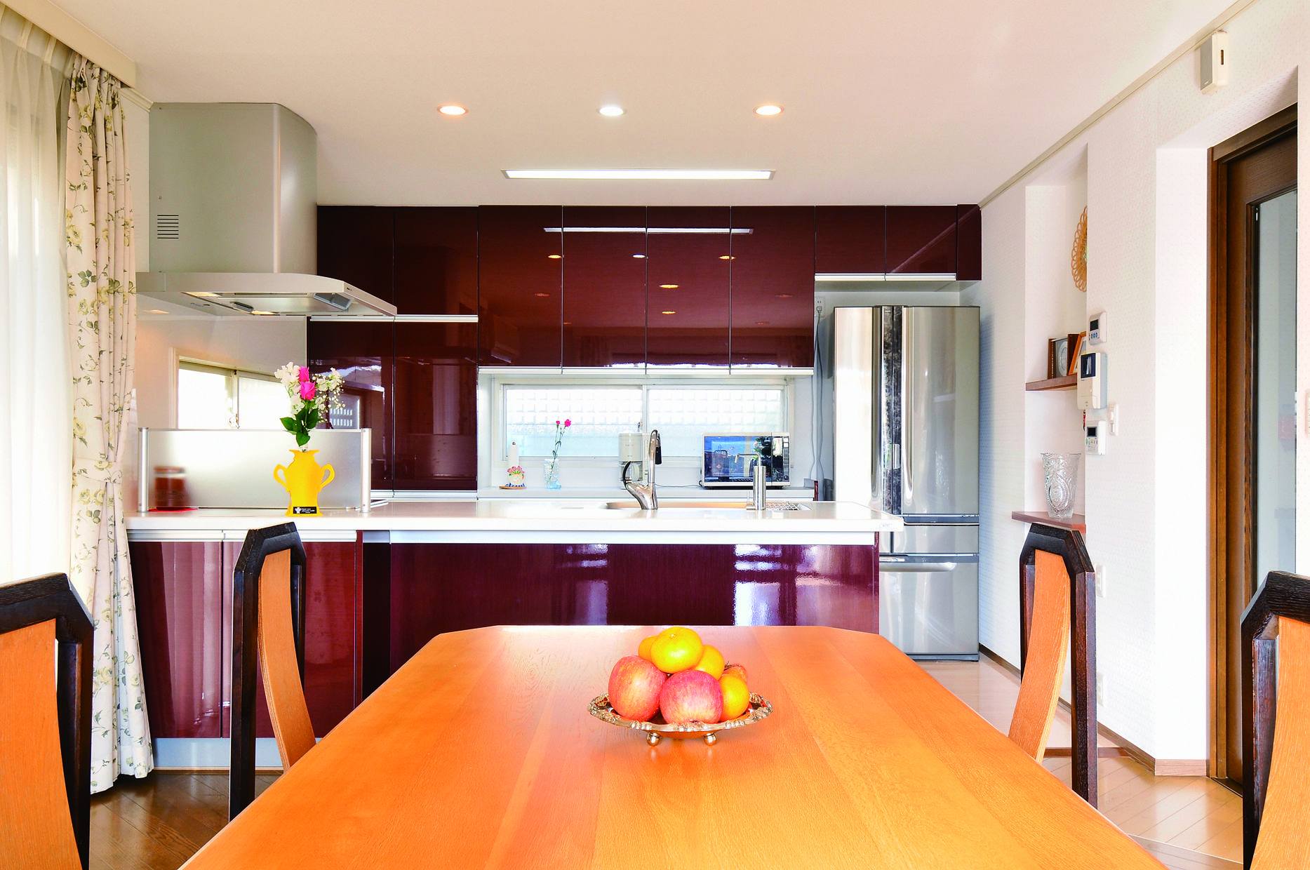 今回施工しなかったリビングと違和感がでないよう、壁紙や巾木などは同じものを使用。また、システムキッチンのワインレッドはご主人の愛車と同じ色。こだわり抜いて選んでます。照明も吊り下げ式からすべて埋込式のライトやダウンライトを使いすっきりとした空間を造りました。