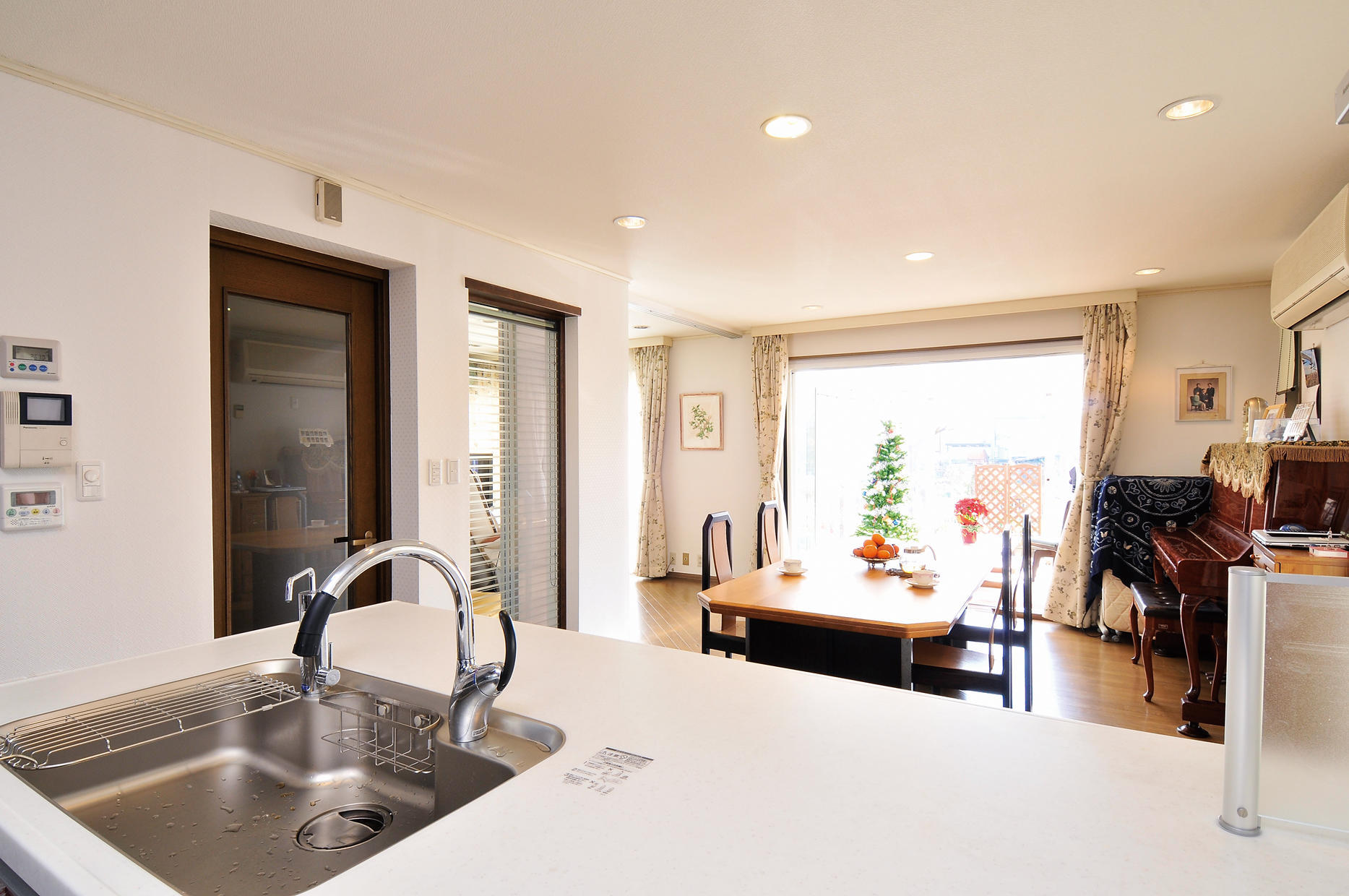 L字型の半独立型キッチンをI字型の対面式に変更。背面にはすぐ手が届く食器棚、正面には配膳に便利なカウンターが設けられた新たなキッチン。