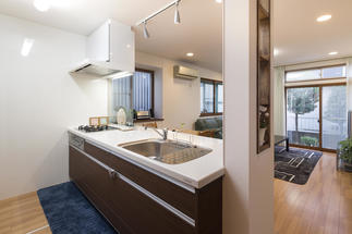 T様が一番に要望されていた明るさを確保するために、建具や床をナチュラルカラーに変更しました。さらにキッチンを玄関ホール側に広げ、L型で壁を向いて調理等をするスタイルからI型のオープンタイプへ。T様は調理関係のお仕事で、普段からキッチンに立つ機会が多く、将来は自宅で料理教室を開きたいとのご要望にも対応できる設計をしました。キッチンを広げたことで、LDKから洗面所への行き来ができるようにして、スムーズな家事動線も実現しています。窓はポイントでインプラスを採用して断熱性を高め、結露を防止しています。