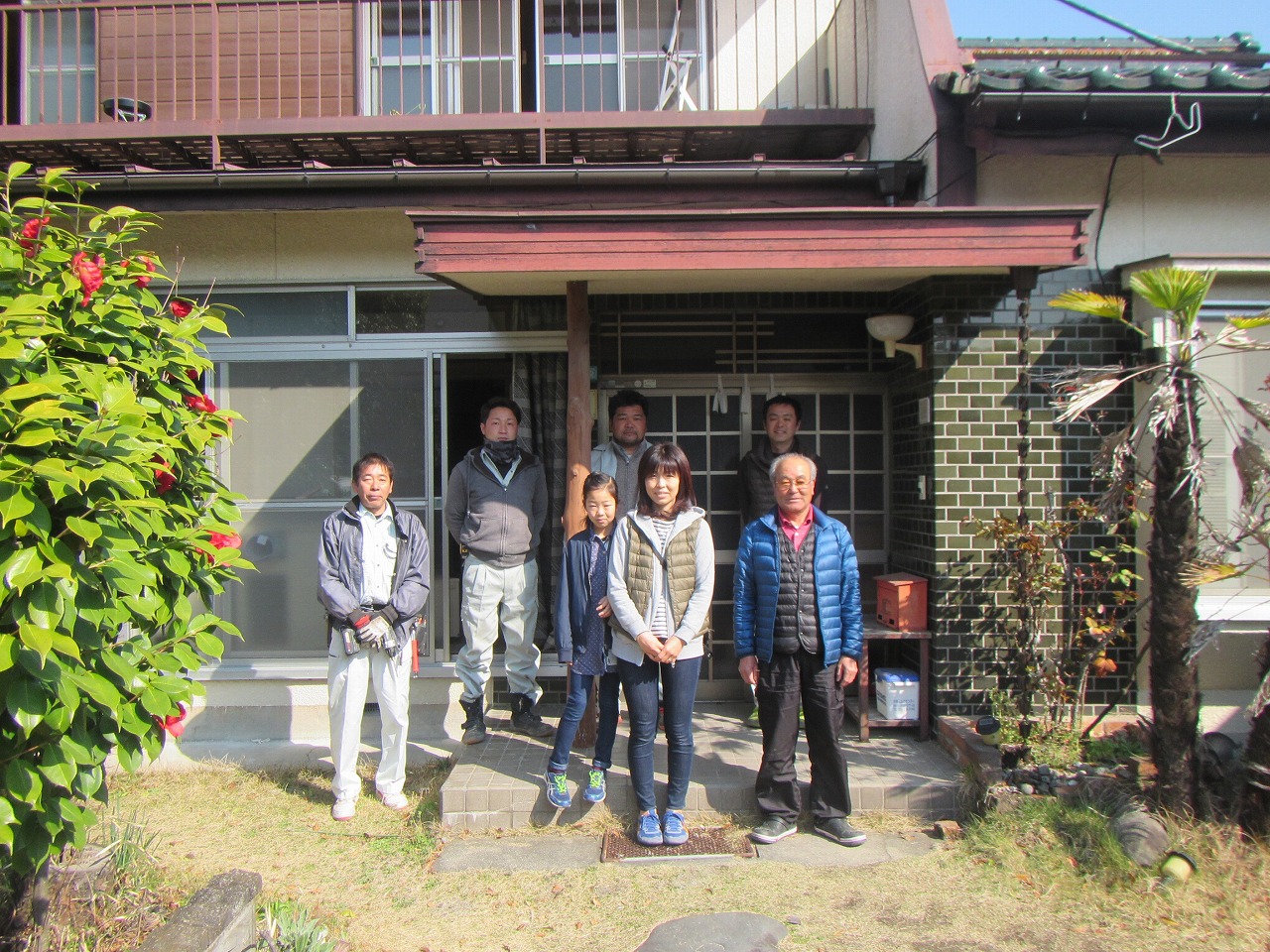 残念ながらご主人様と息子さんは不在でしたが、奥様と娘さんとお父様、大工・業者様との記念写真(左)