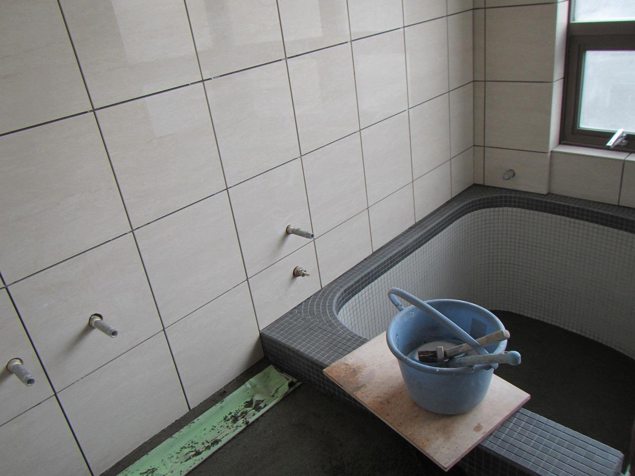 浴室工事はタイル貼りが進んでおります!最近はユニットバスがほとんどになっていますので、タイル貼り仕上げは新鮮で高級感がたっぷりですね(笑)