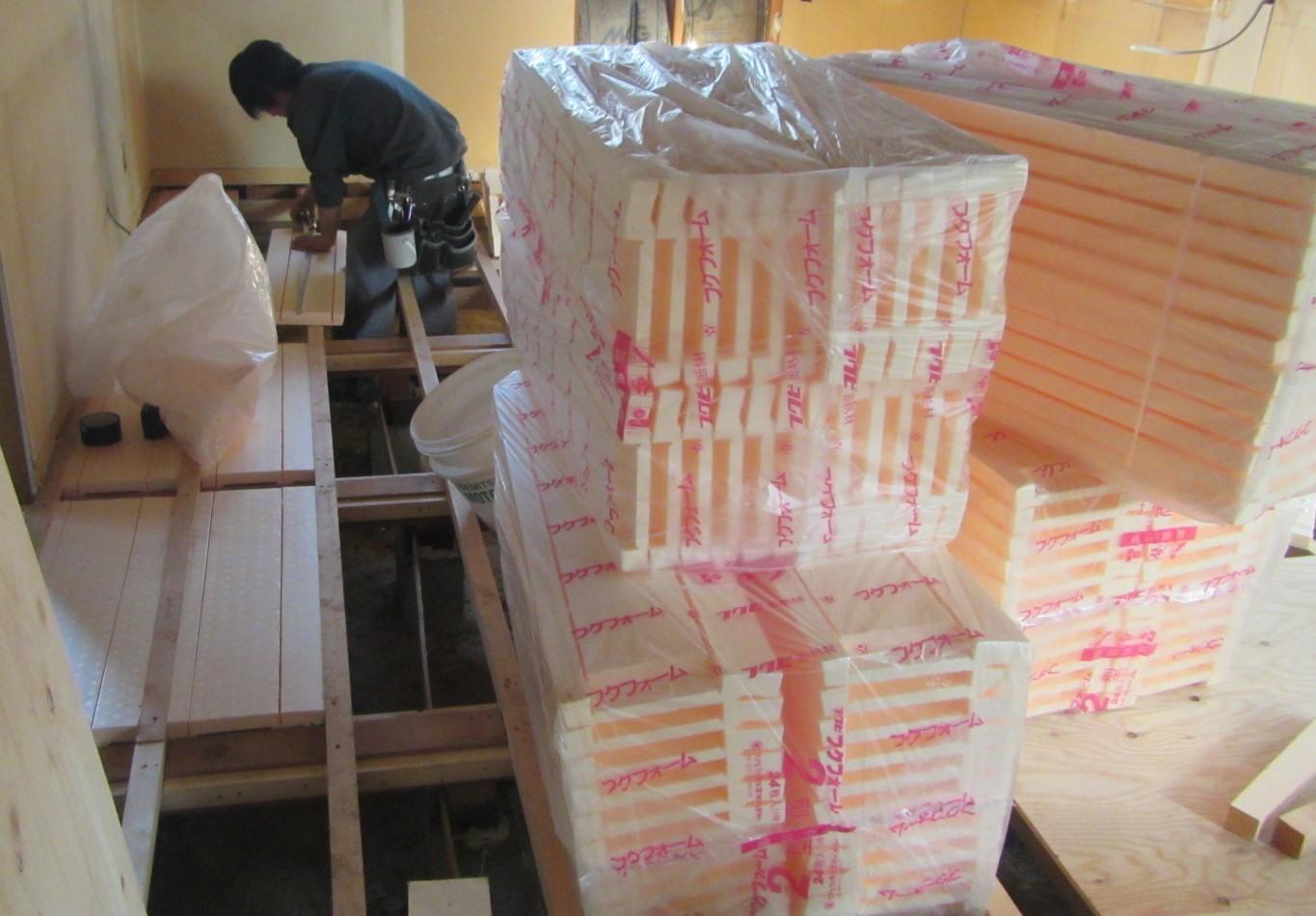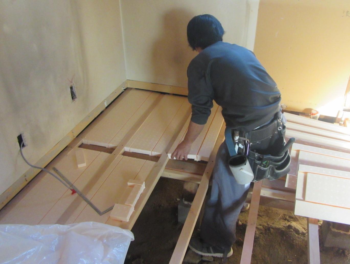 新しく取り付けた根太(ねだ:床板を留める木材)の間にはめていきます。