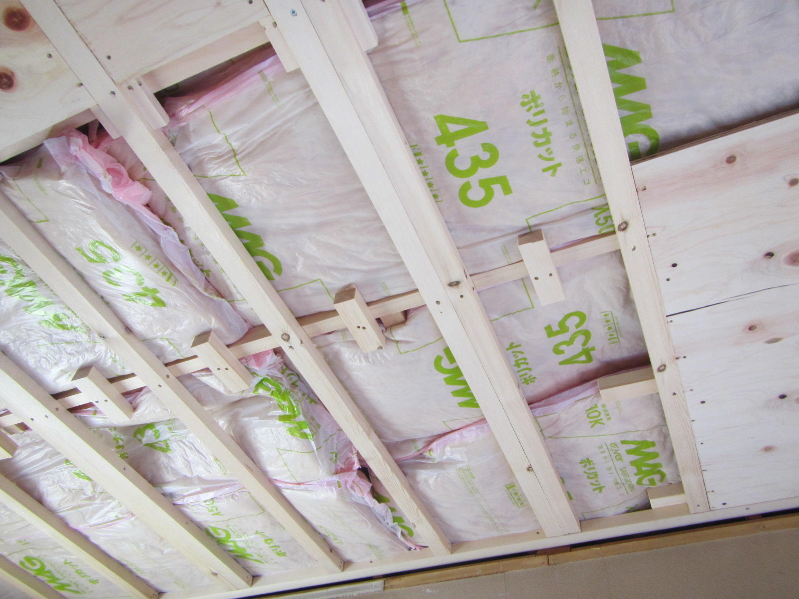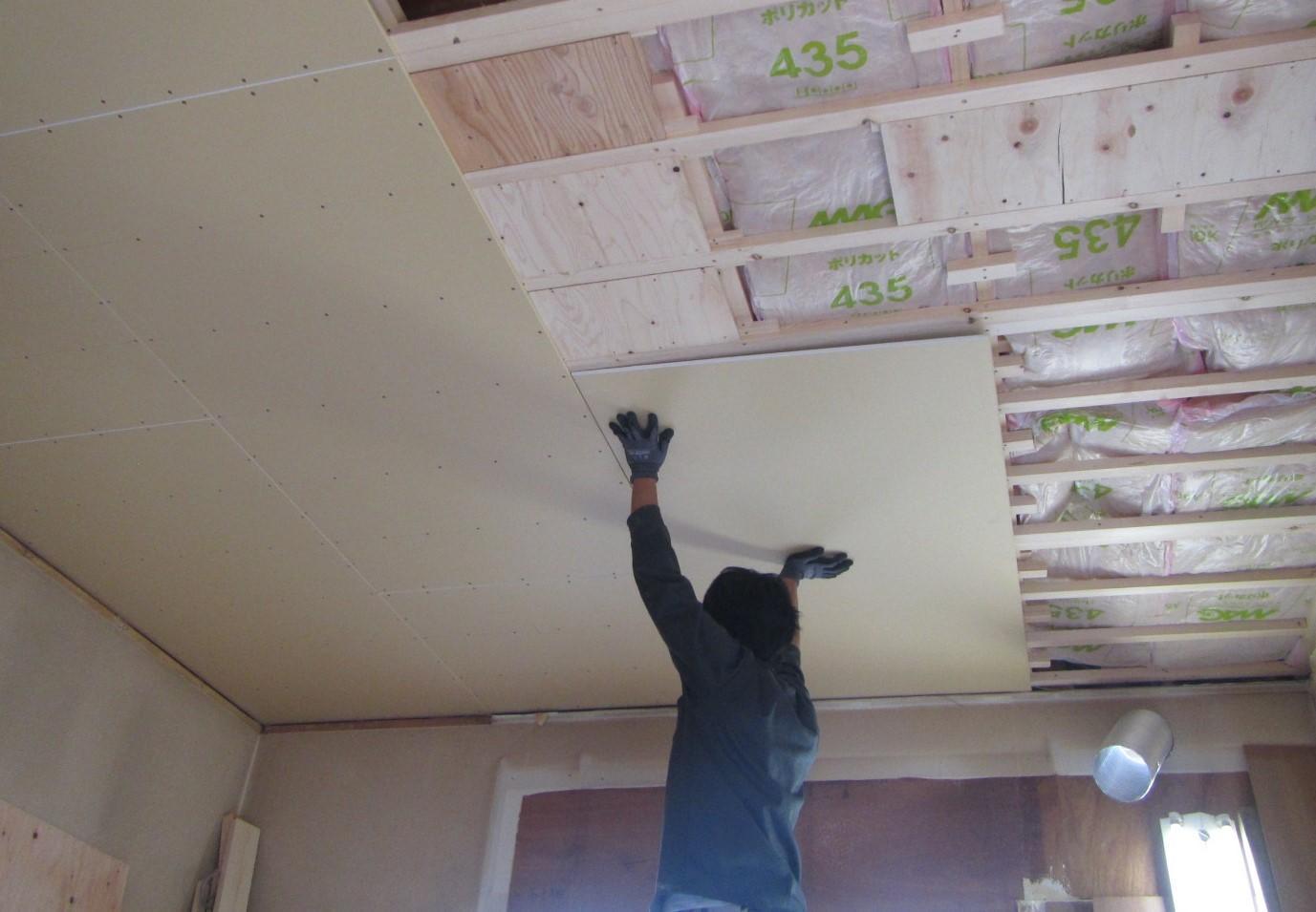 ↑天井にも違うタイプの断熱材を入れ、石膏ボードを貼っていきます。