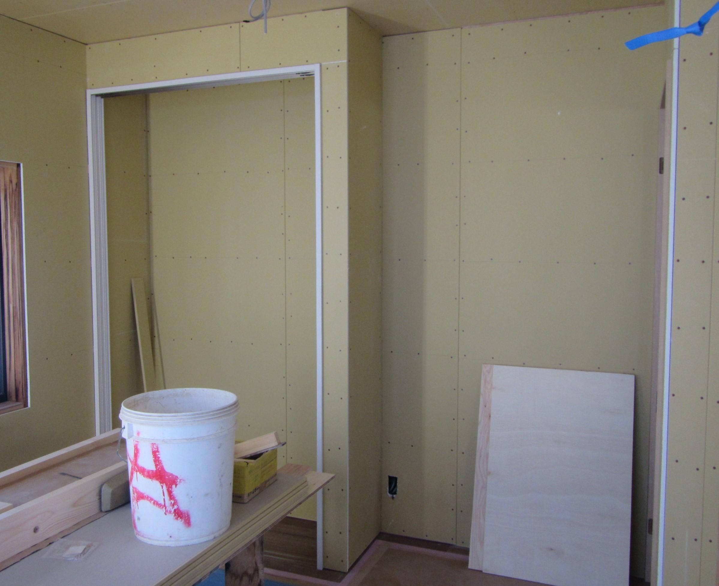 写真右の壁(右側)ですが、クロスを貼る前に石膏ボードを留めているビスの凹みをパテで平にし、クロスがきれいに貼れるように処理した跡があります。