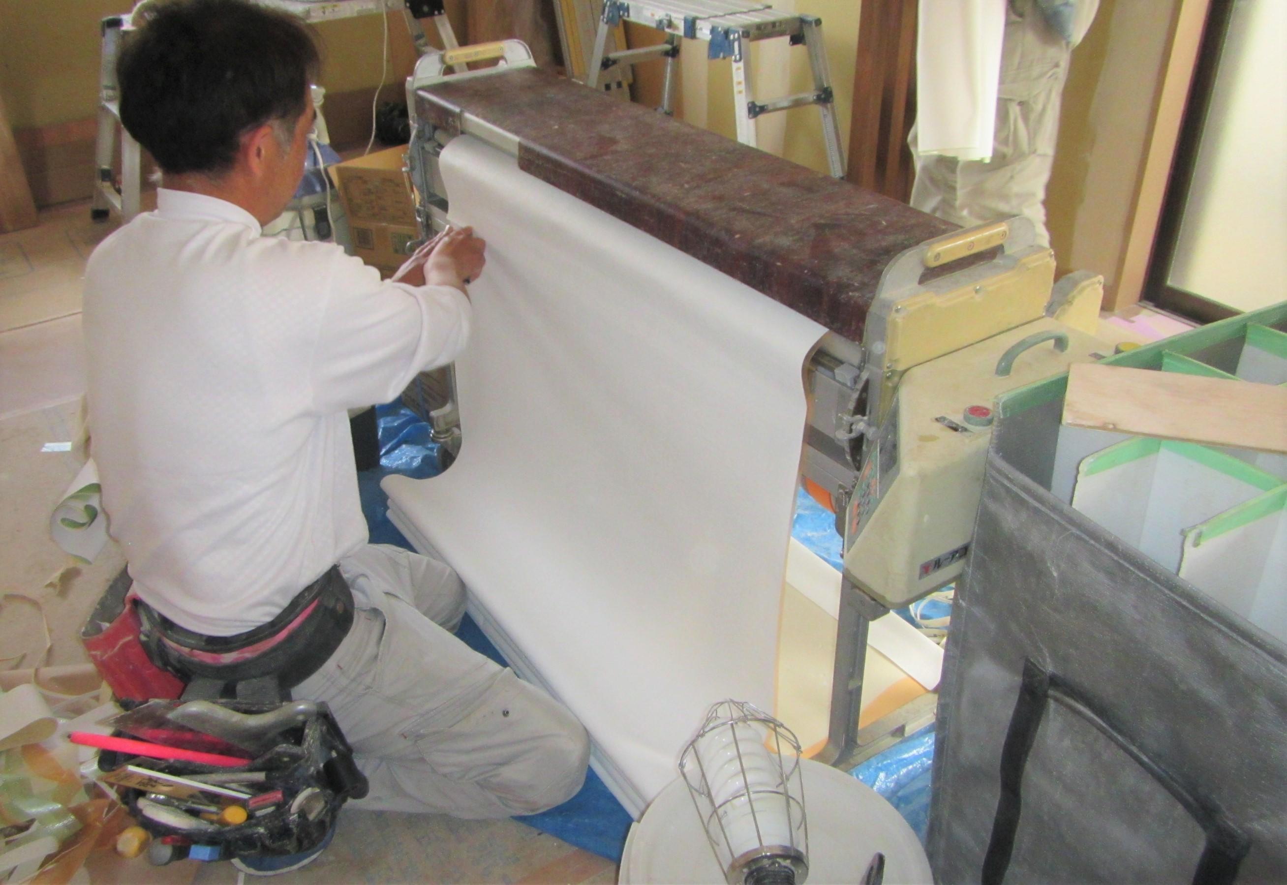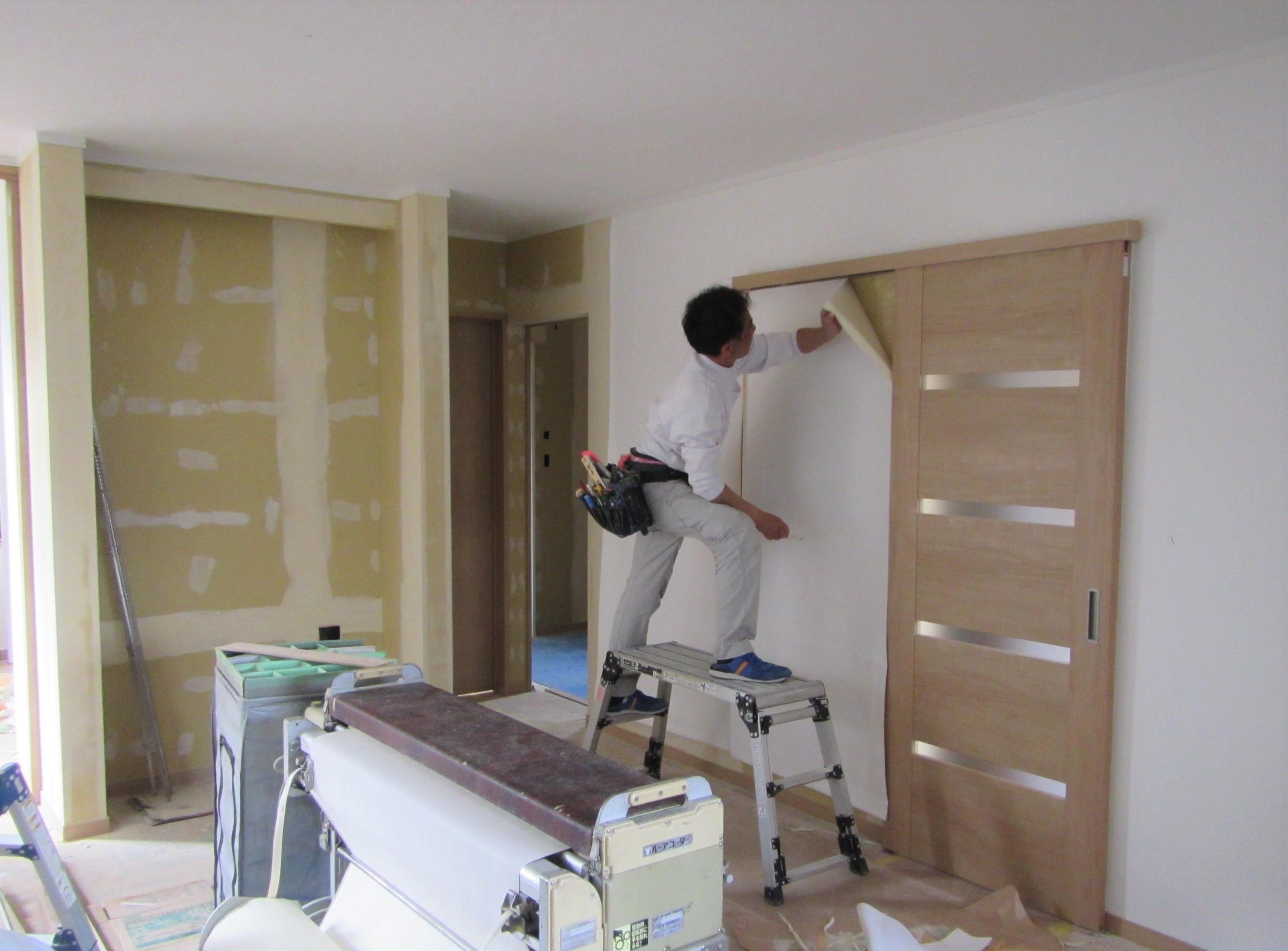 ↑中ではダイニングキッチン(DK)のクロスを貼っている作業中でした。