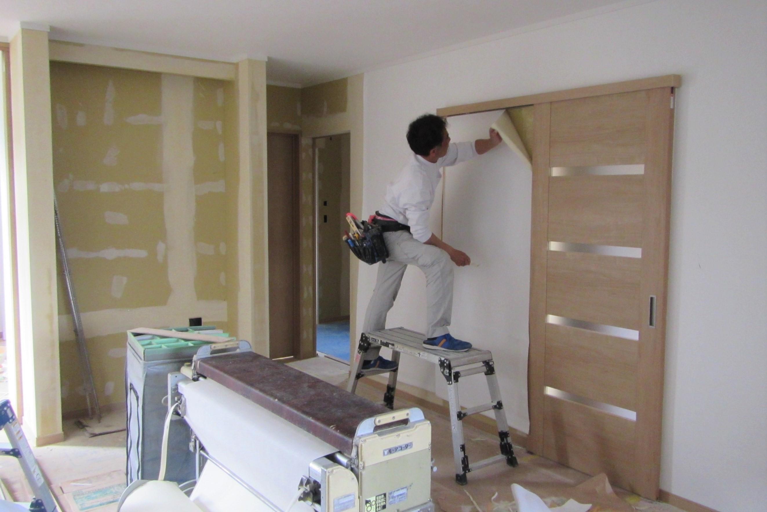 ↑DKの奥は和室から洋室になり、新しくできた収納の中をクロスで仕上げているところです。