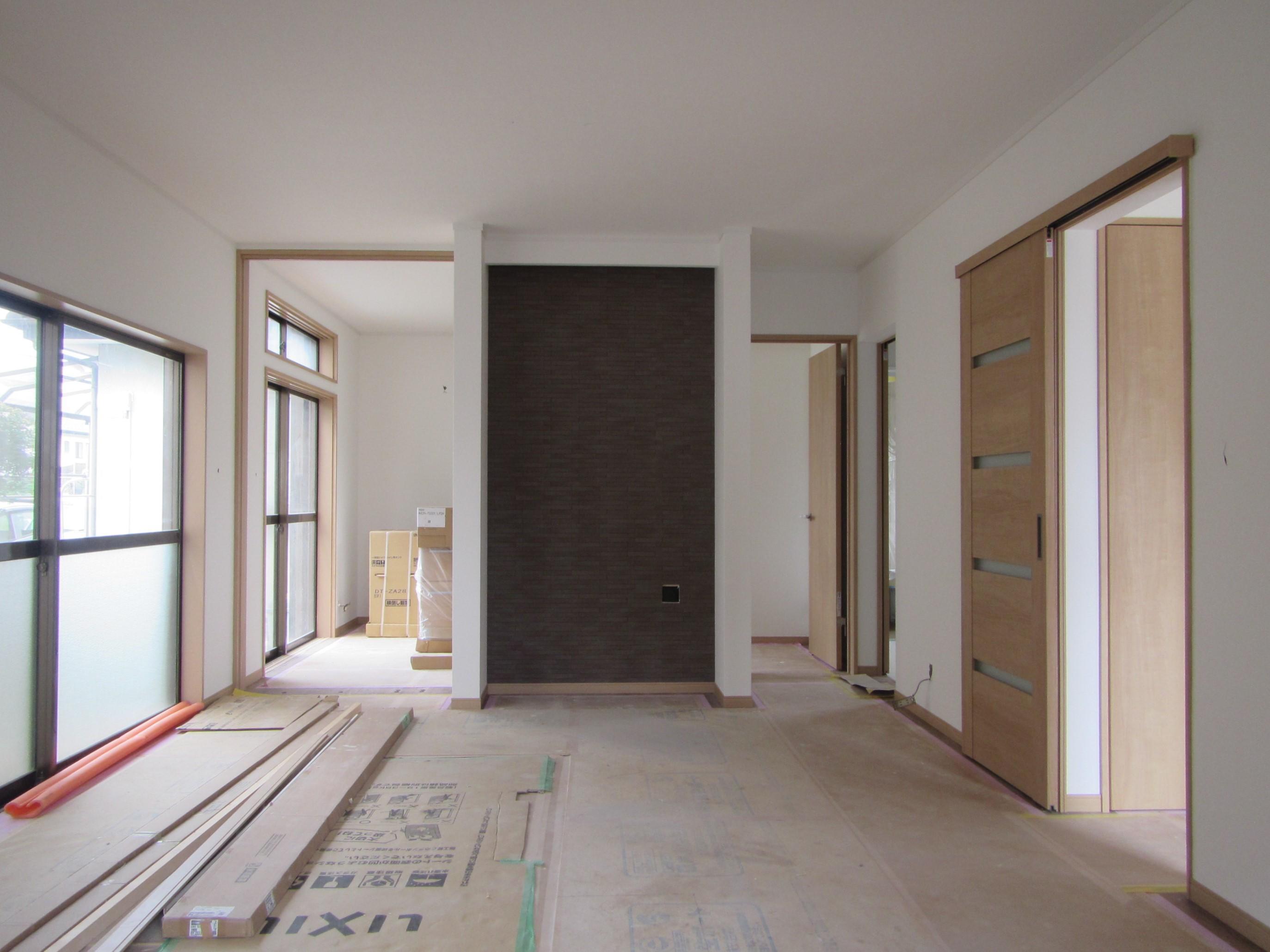 家の中は内装が終わった後だったのですが、玄関の作業中だったのでキッチンの窓からパチリ。