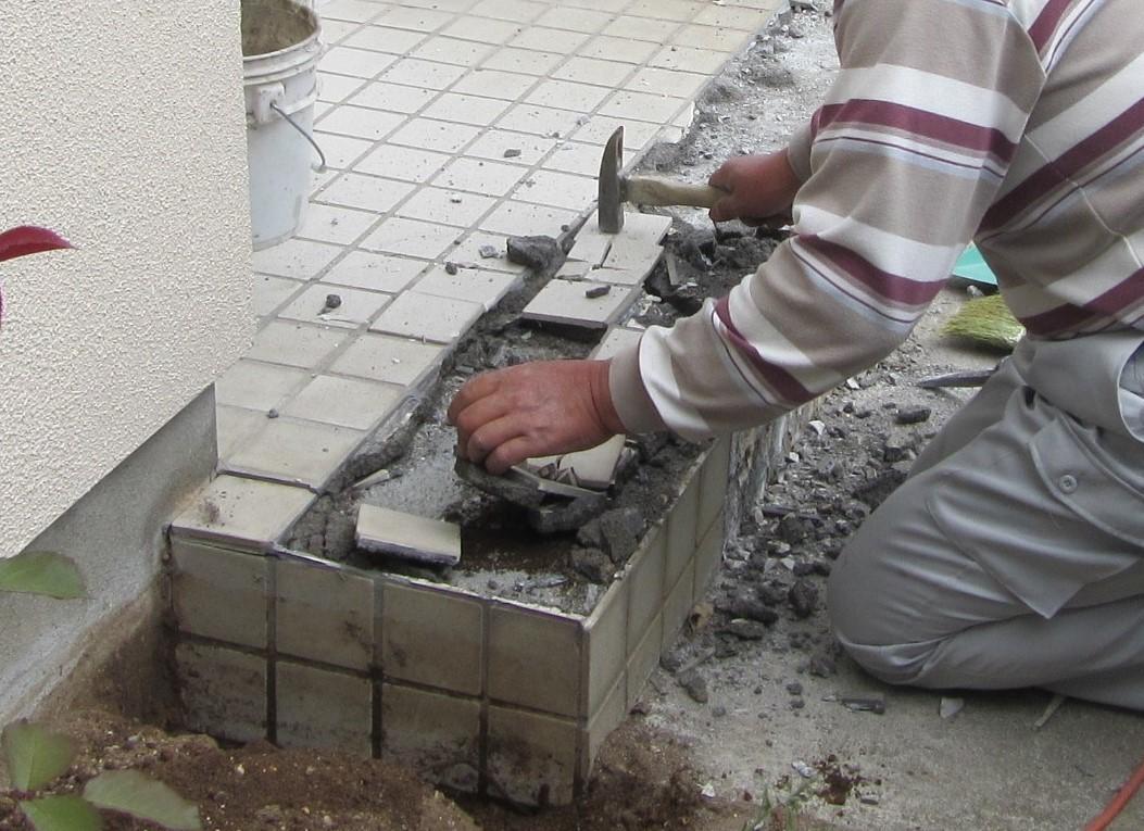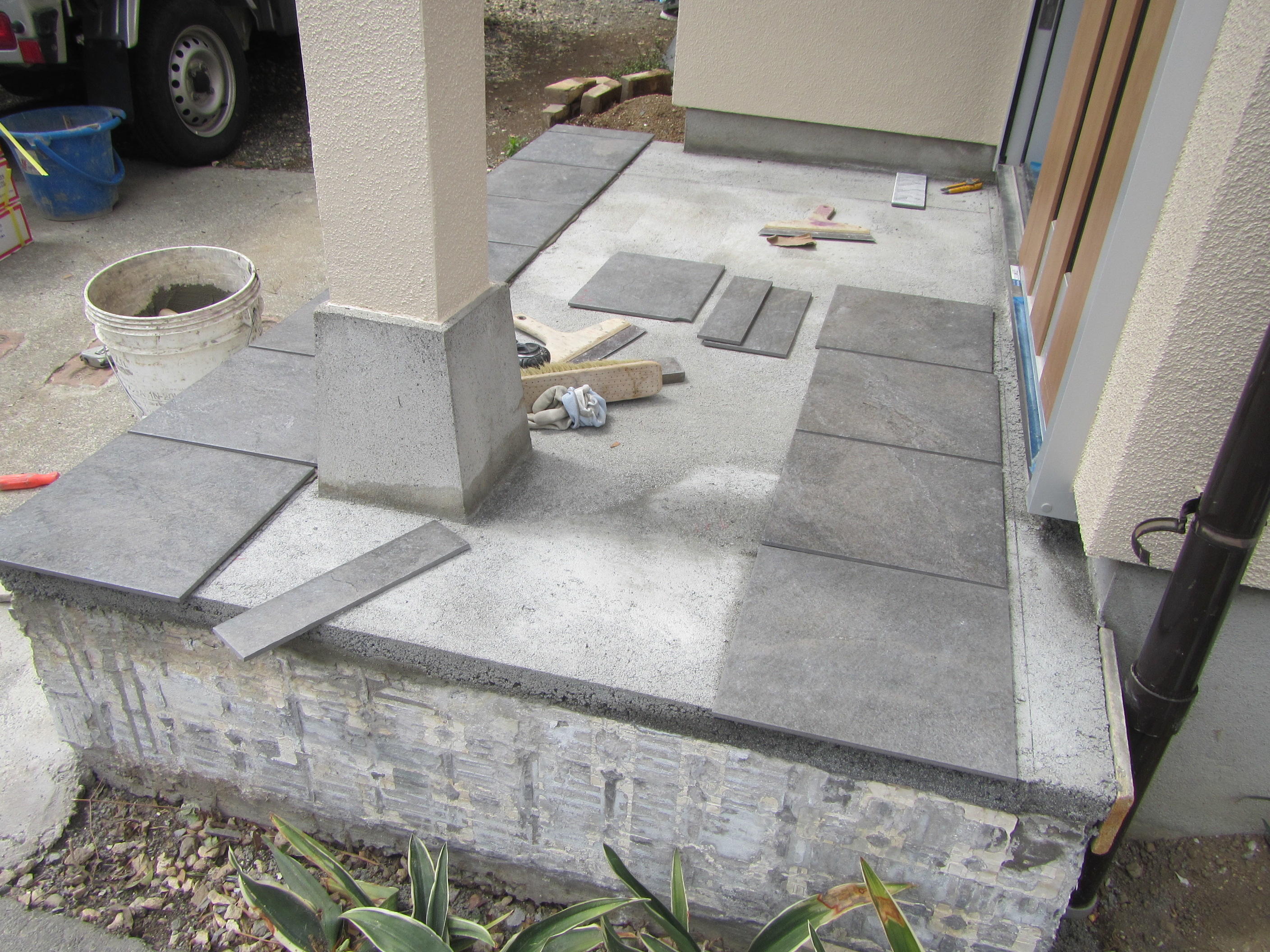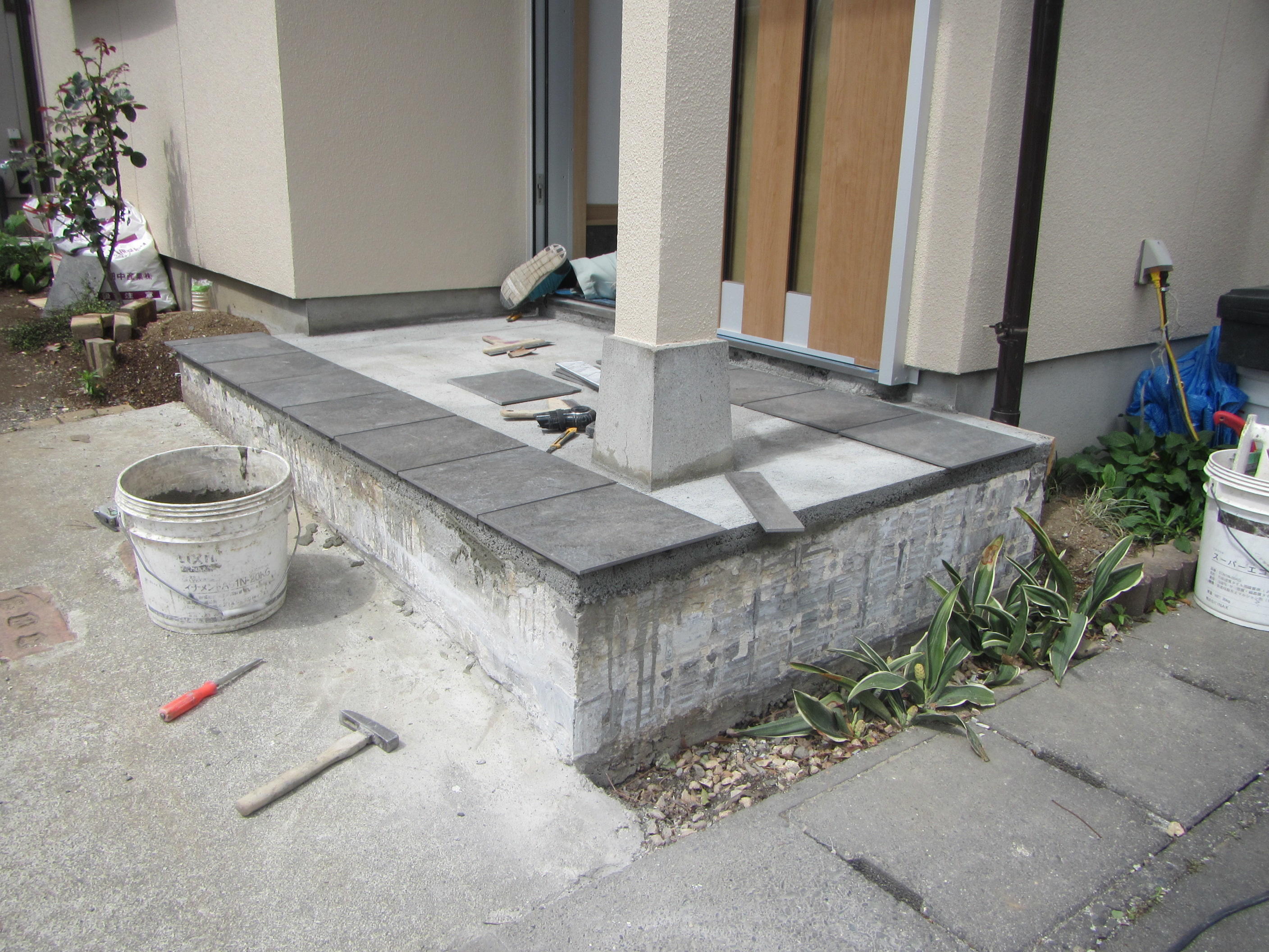 ↑既存タイルをハツった後は土台の水平を取り直してきれいに仕上げ、新しいタイルを貼ってるところでした。