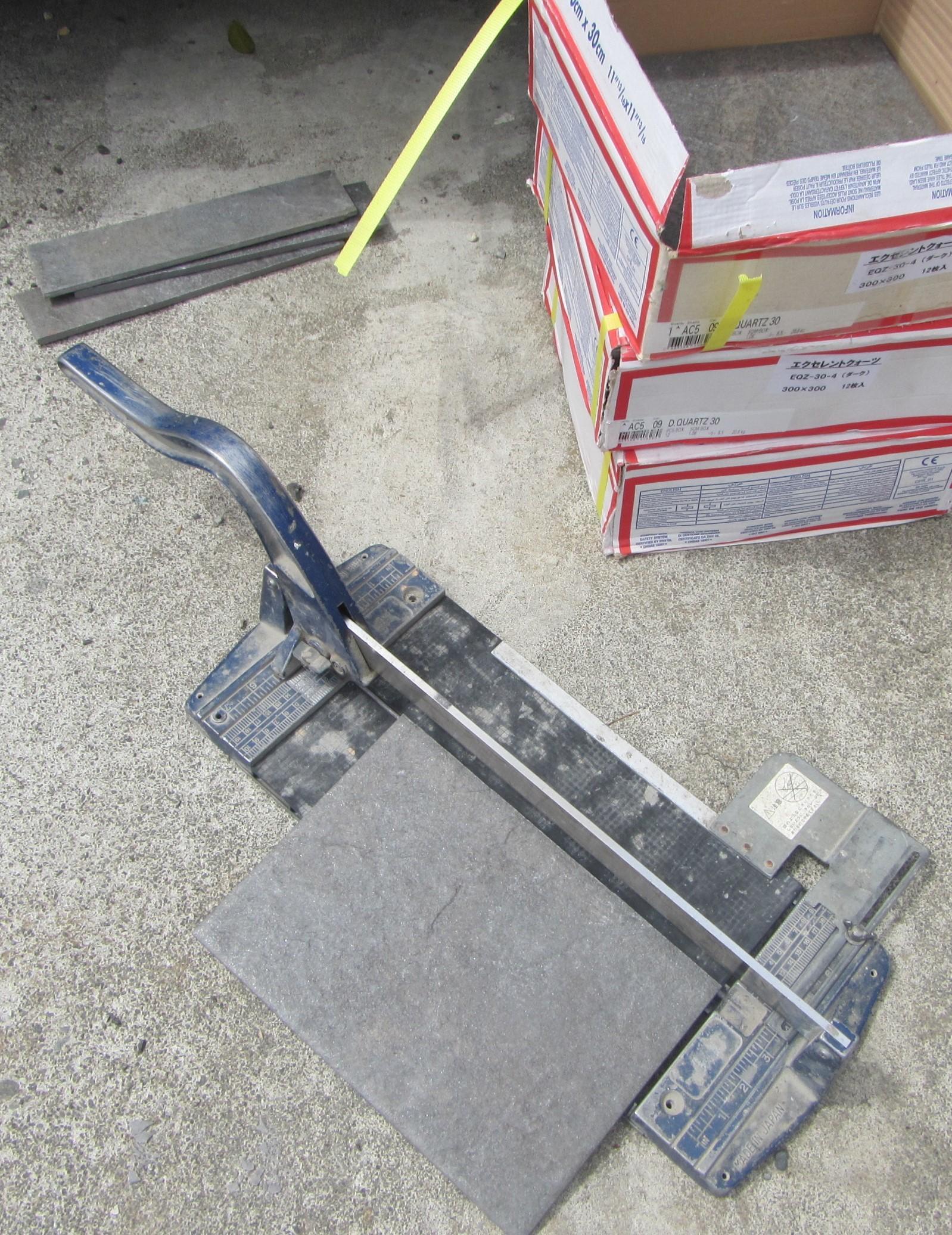 ↑切断機です。タイルをセットして割筋となる傷を表面つけ、ハンドルで上から力をかけて割ります。