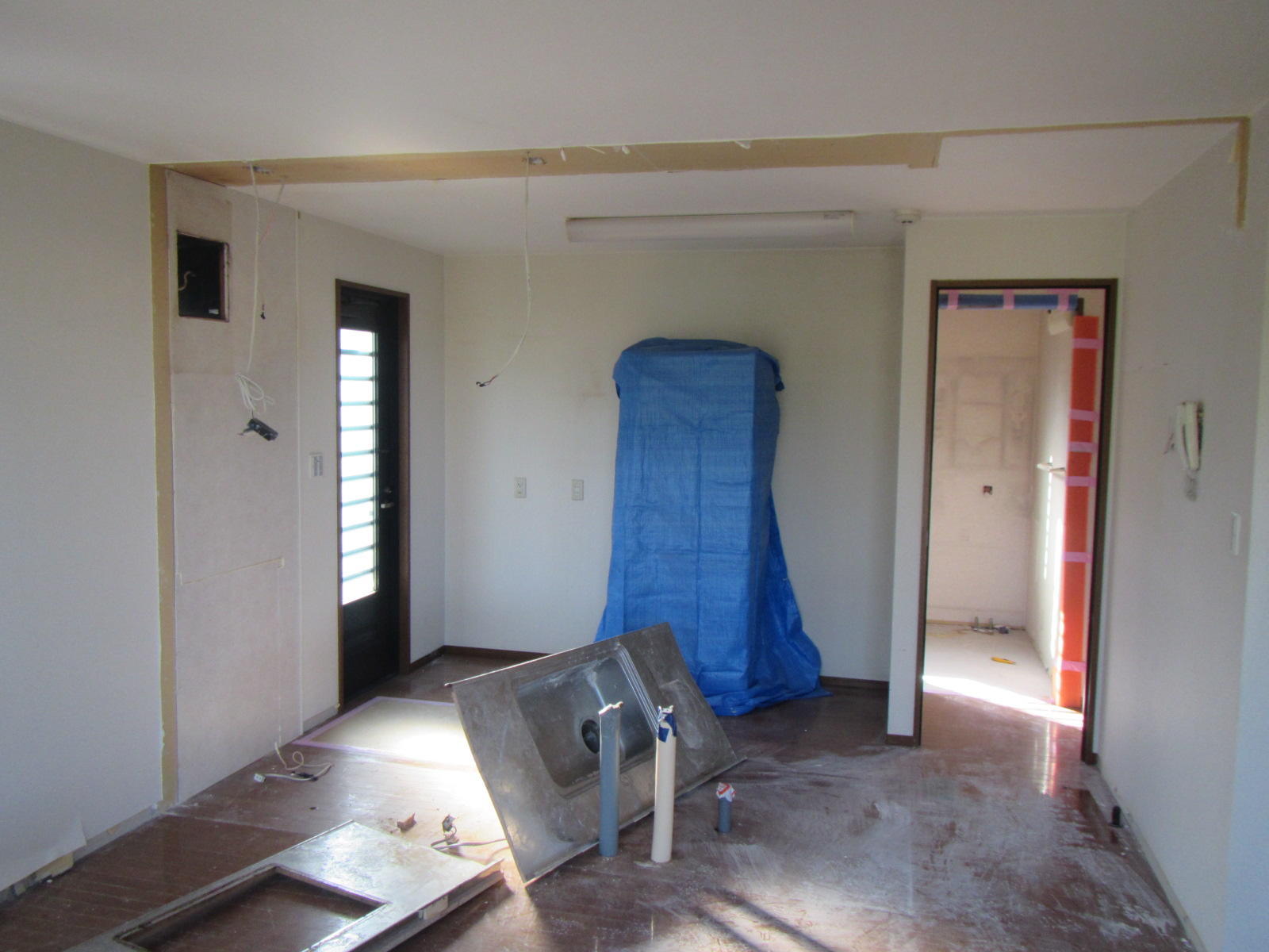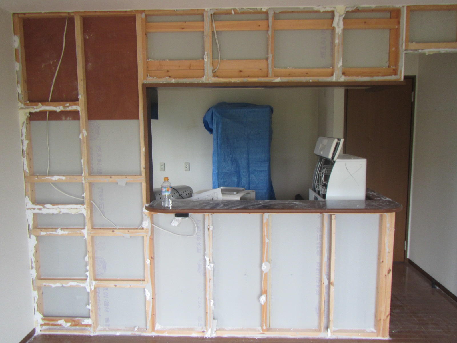 キッチン前の壁も解体されて今回新しく設置するのは『ペニンシュラタイプ』と言って対面キッチンの対面部分に壁が一切ないタイプになっています。