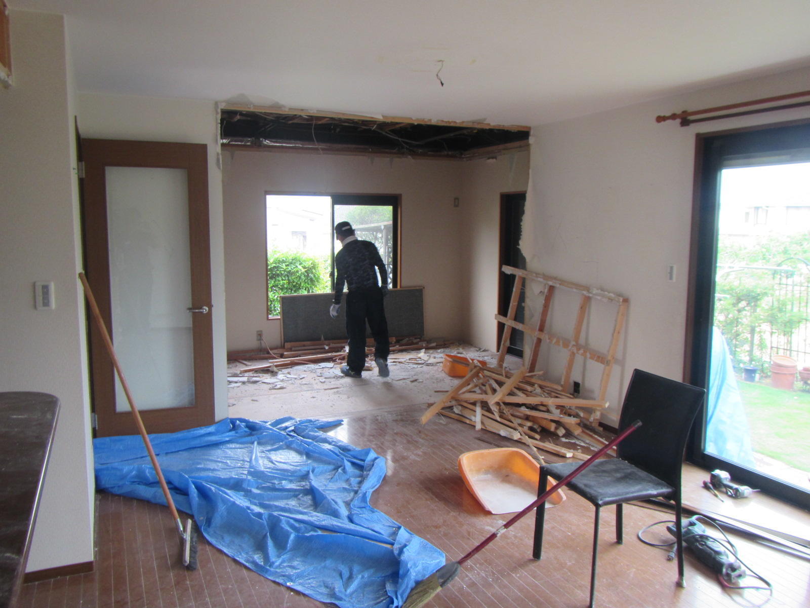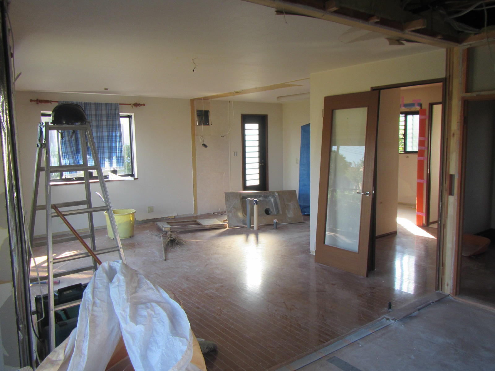 内部の解体工事が完了しました!!間仕切りの壁などが取り払われて、スッキリしました。これから広々リビングの大工工事が進んでいきますよ!