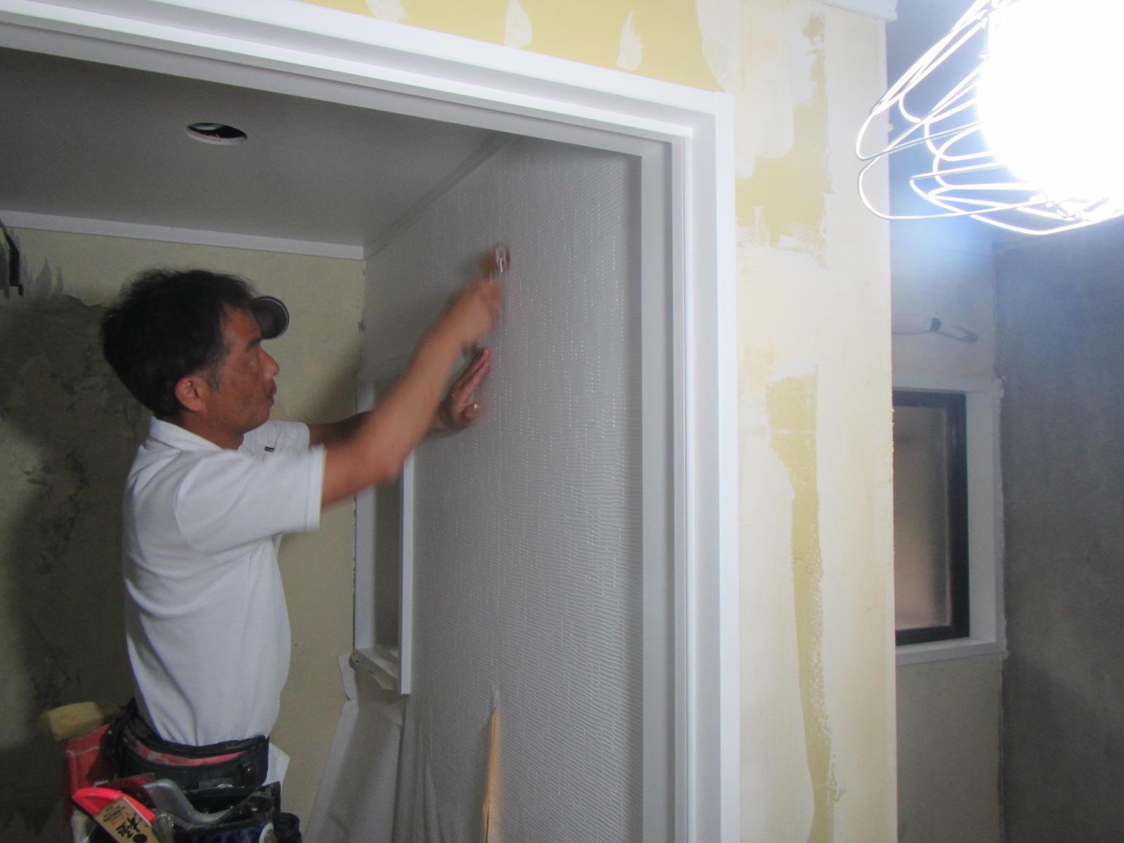 仕上げ工事の方は天井のケイカル板に塗装がされて、今日は内装の職人さんがクロスを貼っていました!