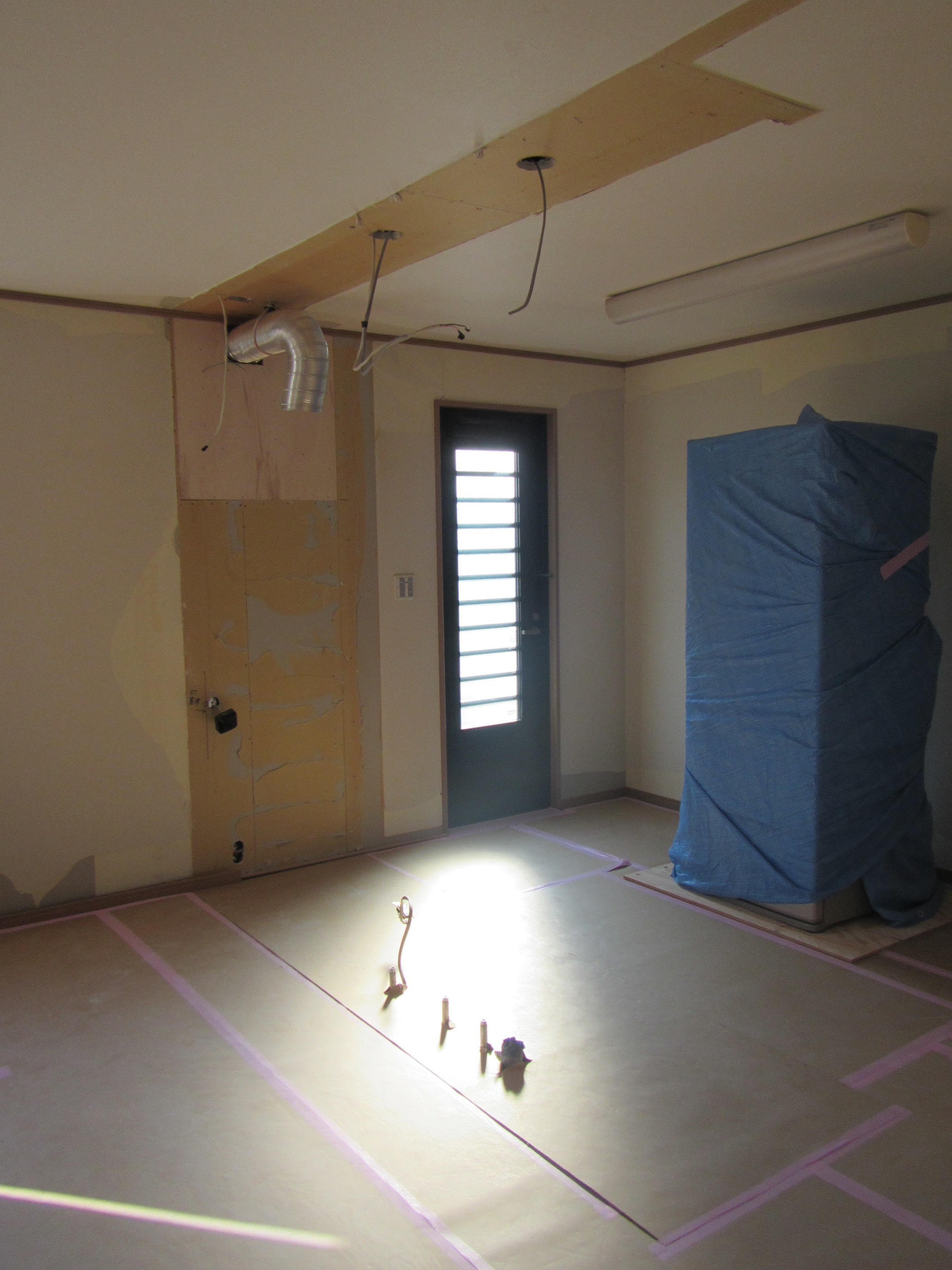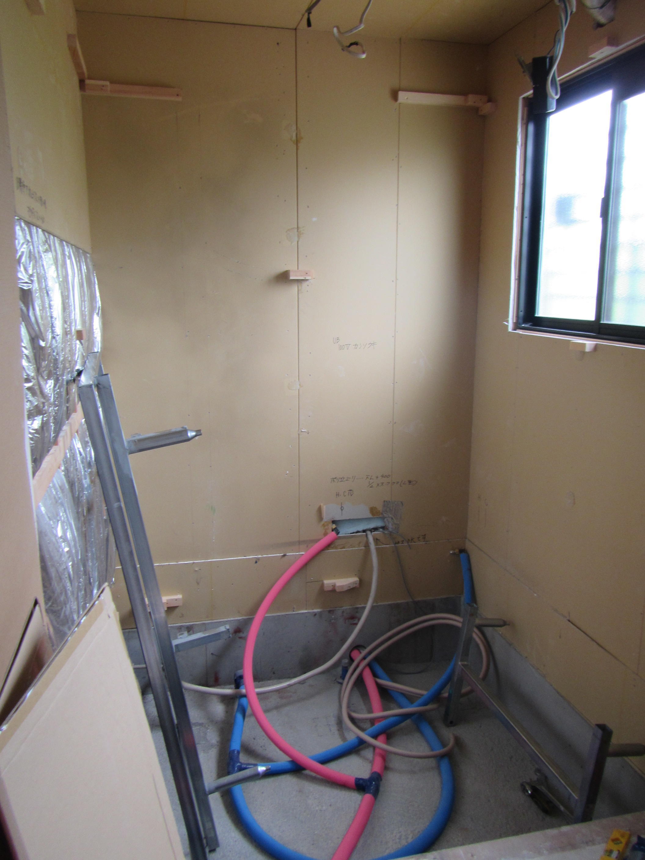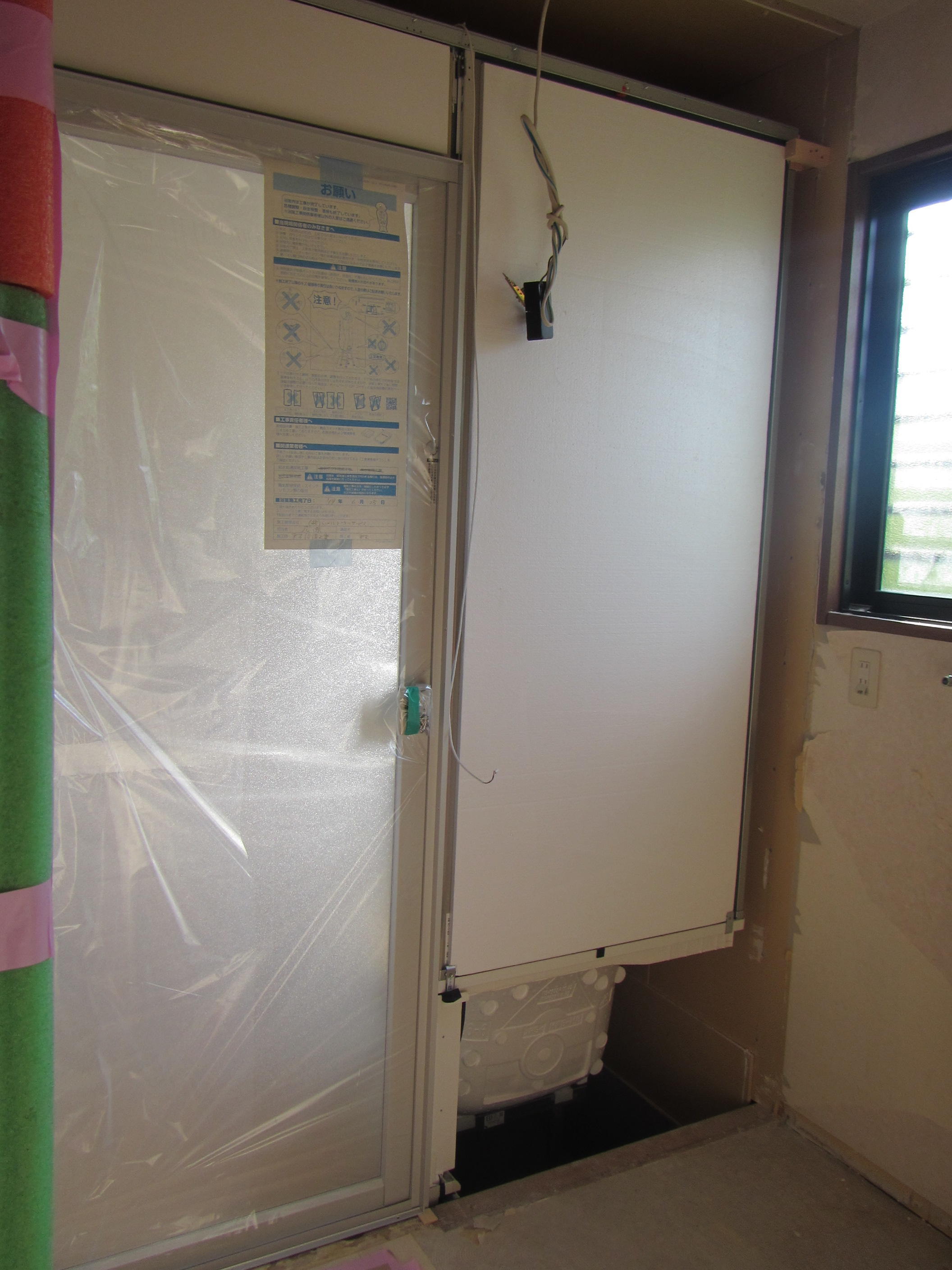 ↑もとのキッチンがあったところです。給排水管、電気配線、換気扇ダクトと準備は万端です。