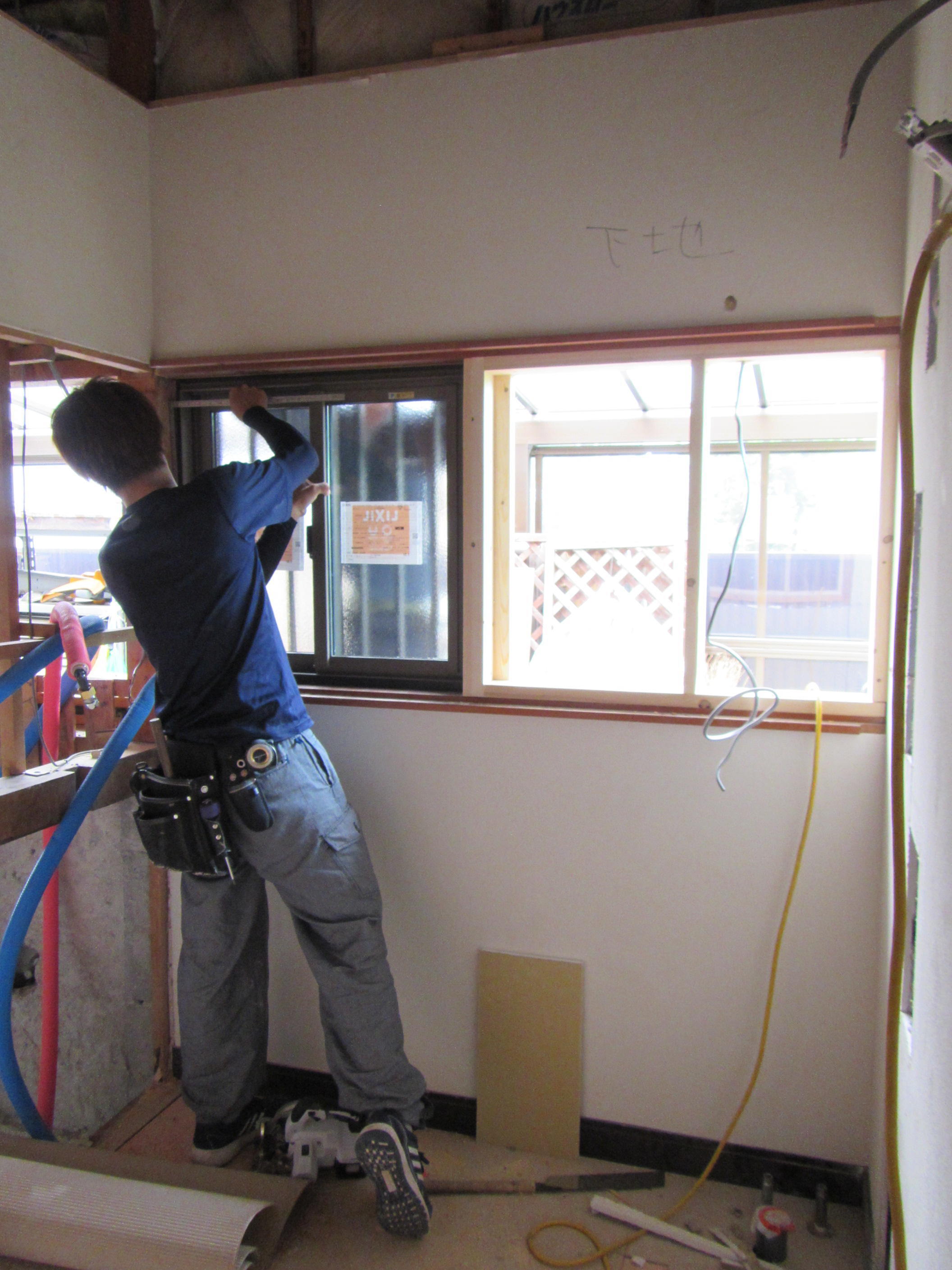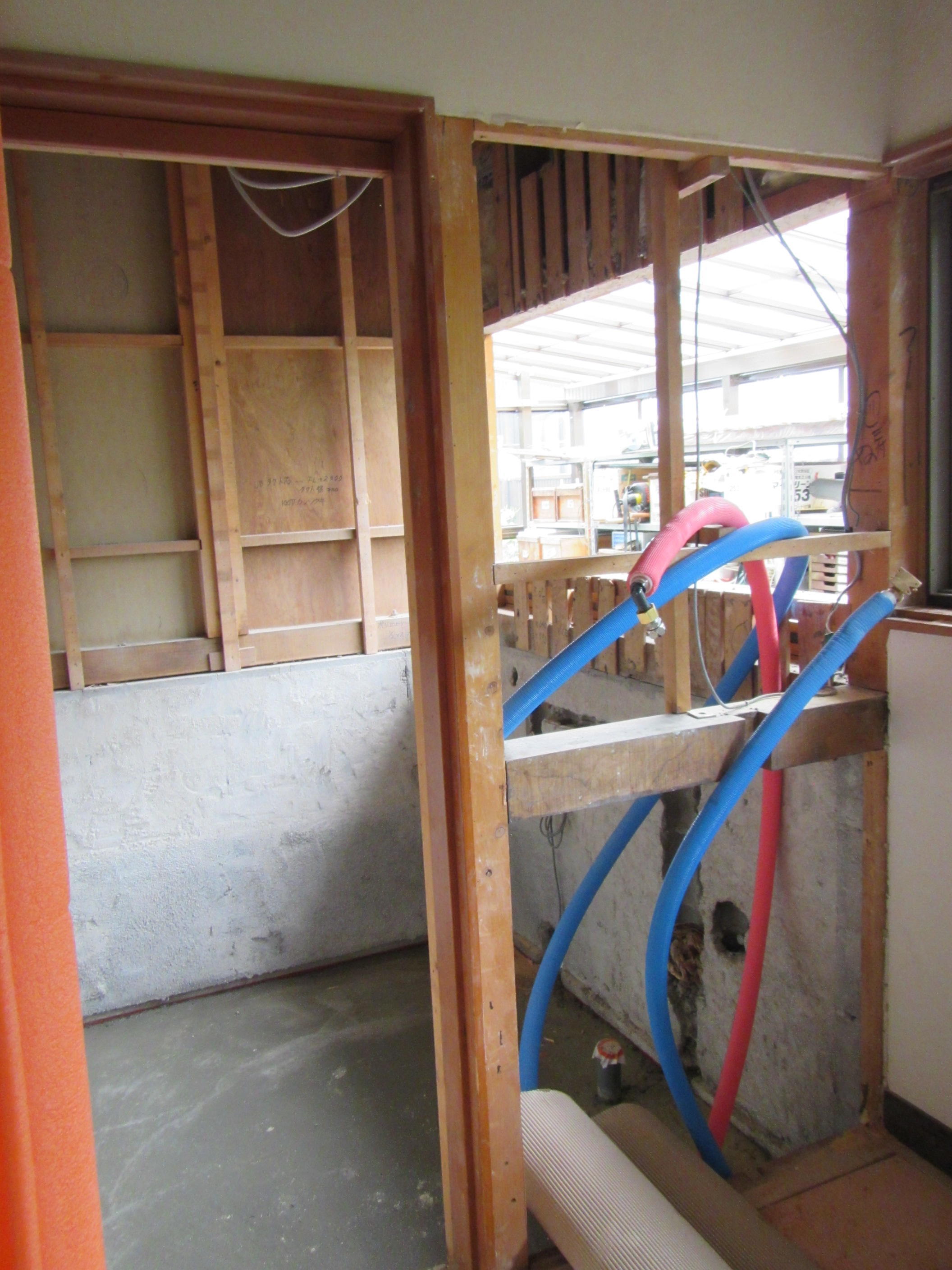 ↑解体が終わると浴室部分には新しく土間が打たれて配管も準備され、手前の洗面室では大工さんが新しい窓を取り付けていました。
