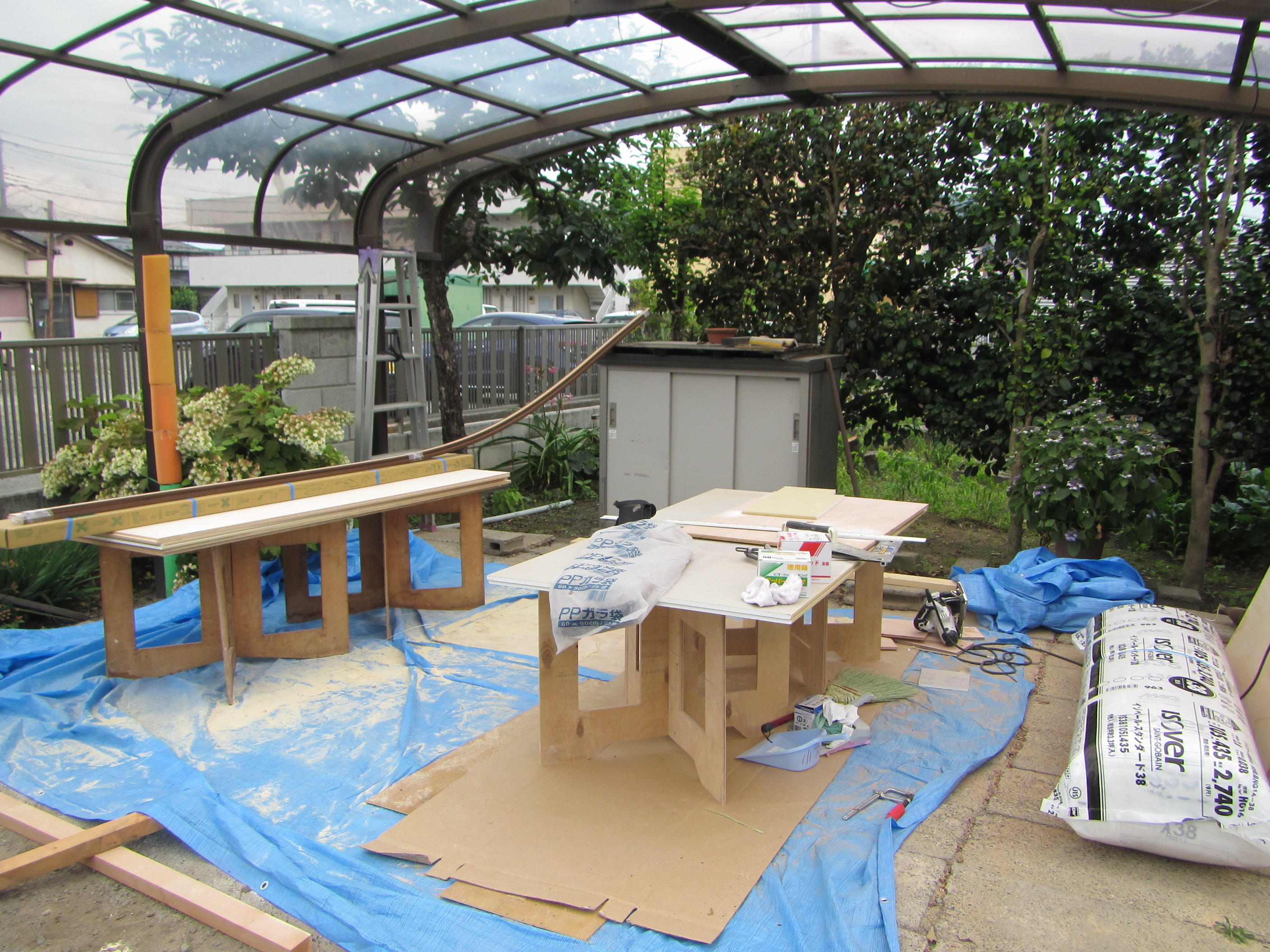 大工さんの作業台は、お施主様のカーポートをお借りしています!