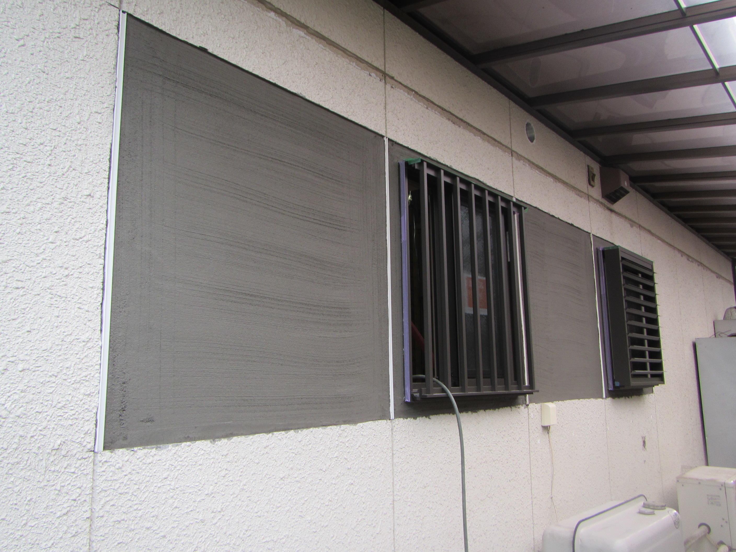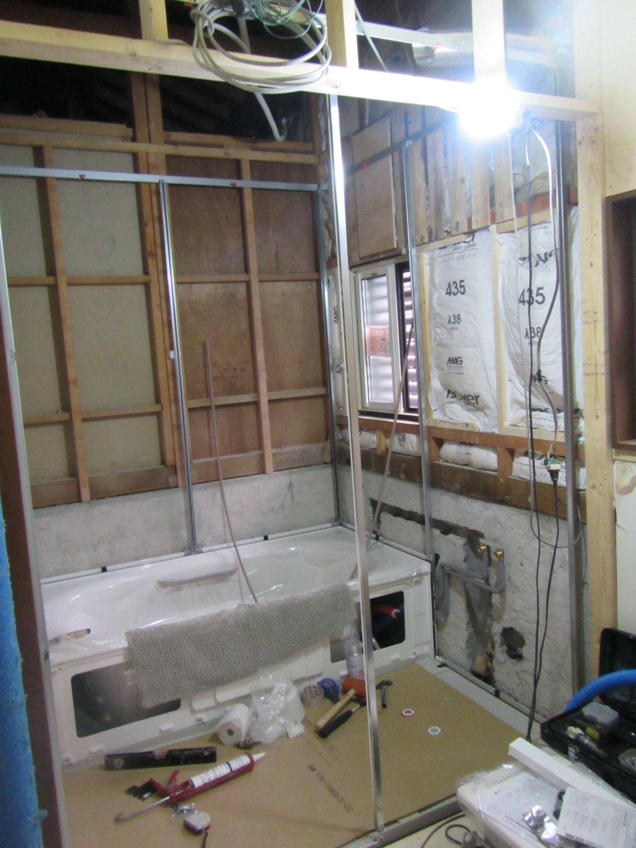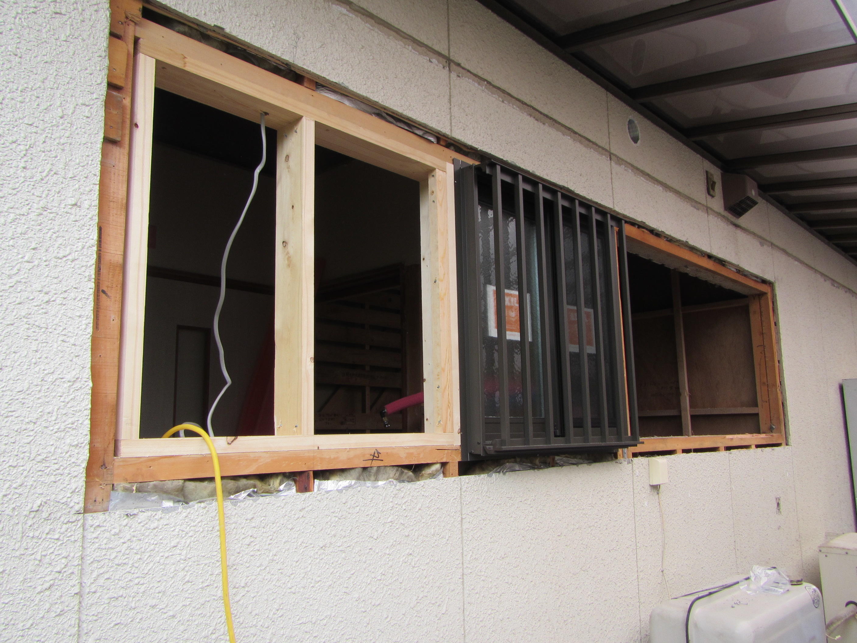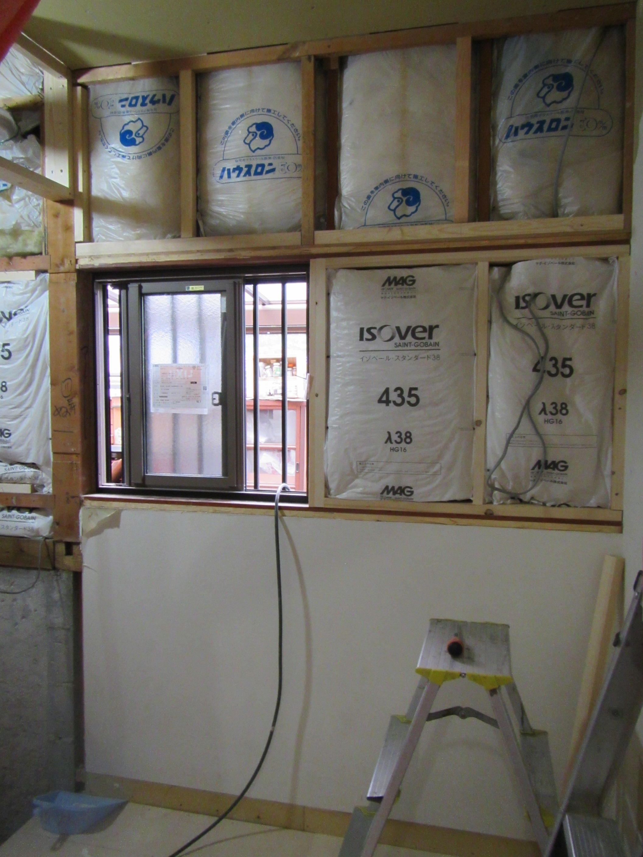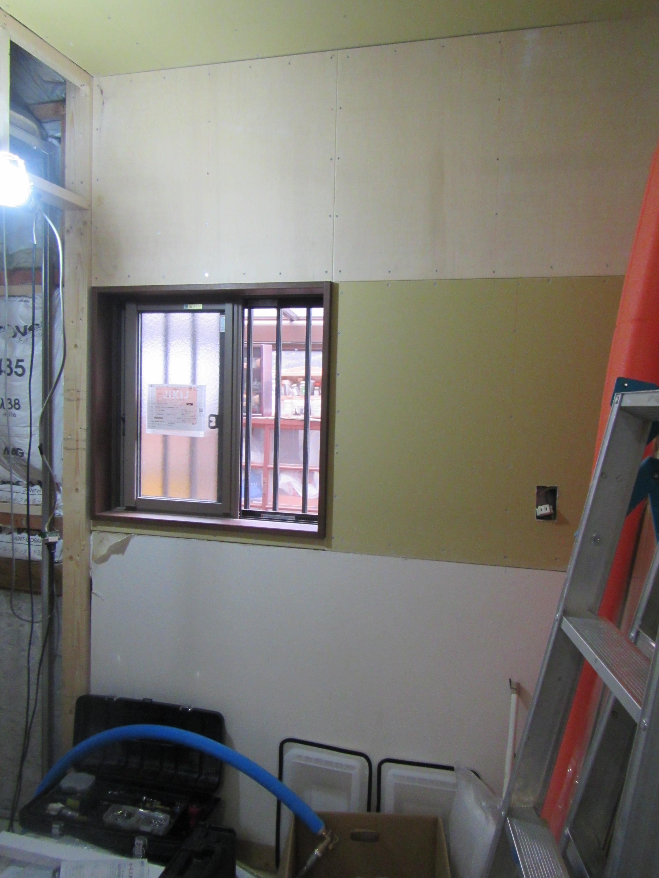 ↑洗面所の室内側です。断熱材が入り、新しい窓枠とボードが貼られました。次は内装ですね。