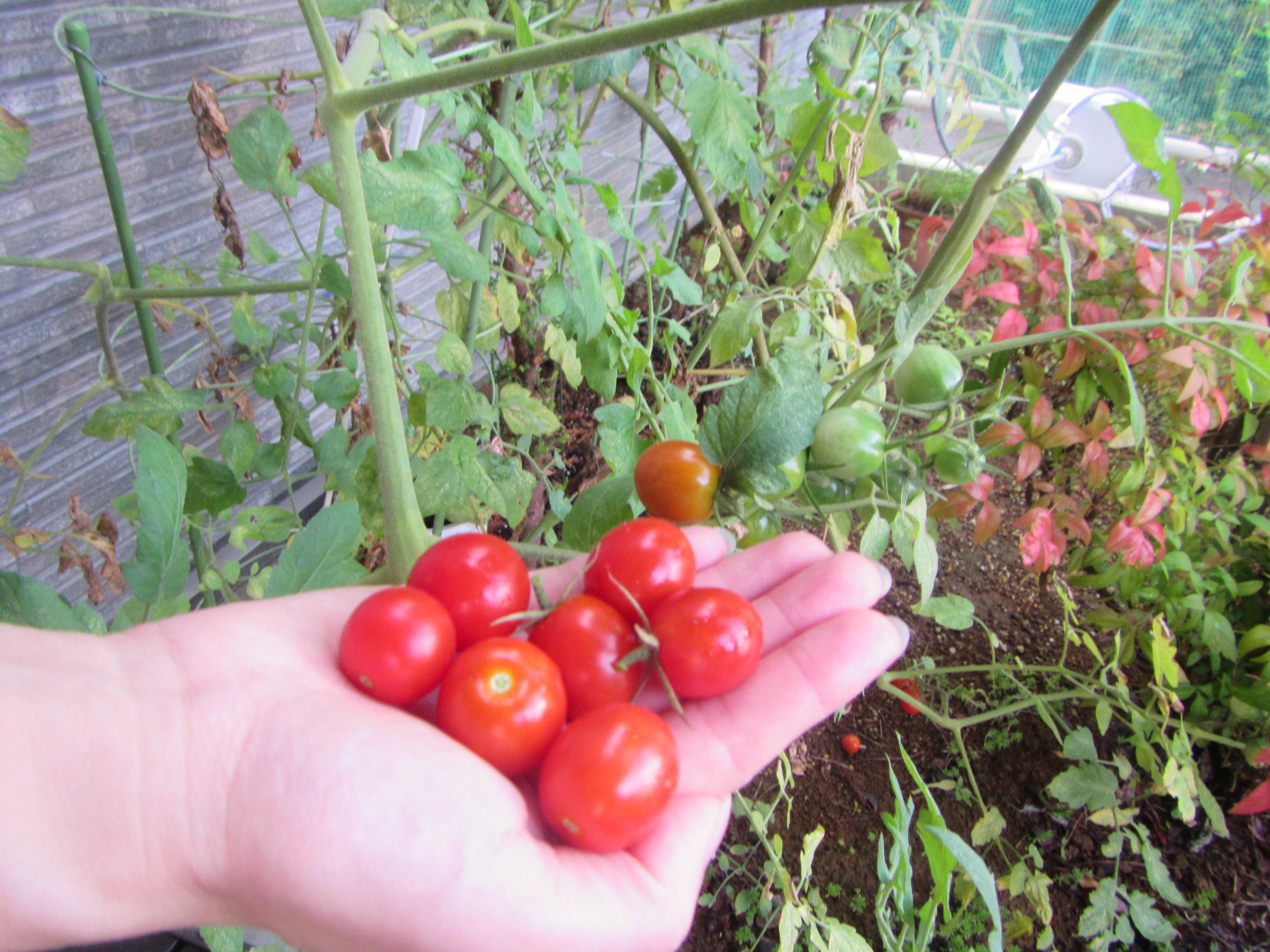 ↑店舗脇にある植え込みでひっそりと育ってきたミニトマト、ついに収穫できました!