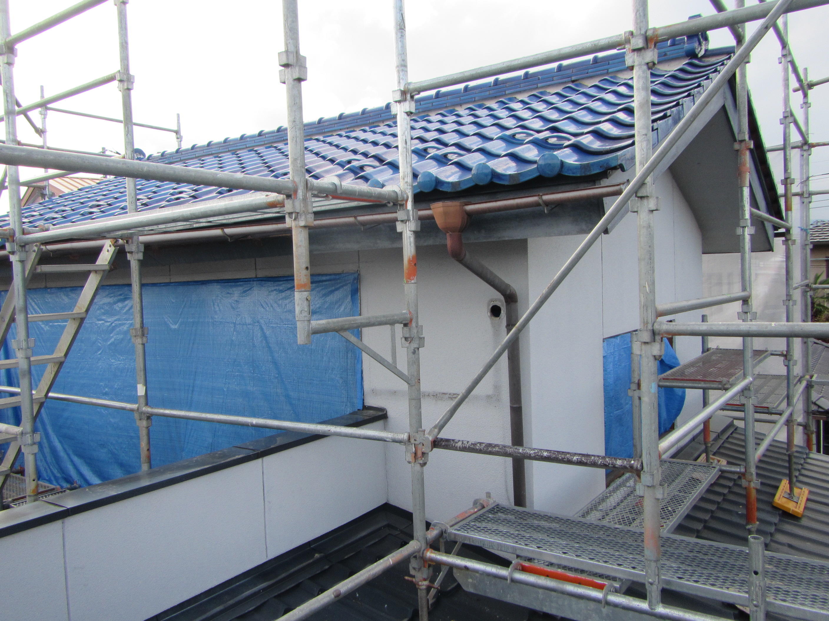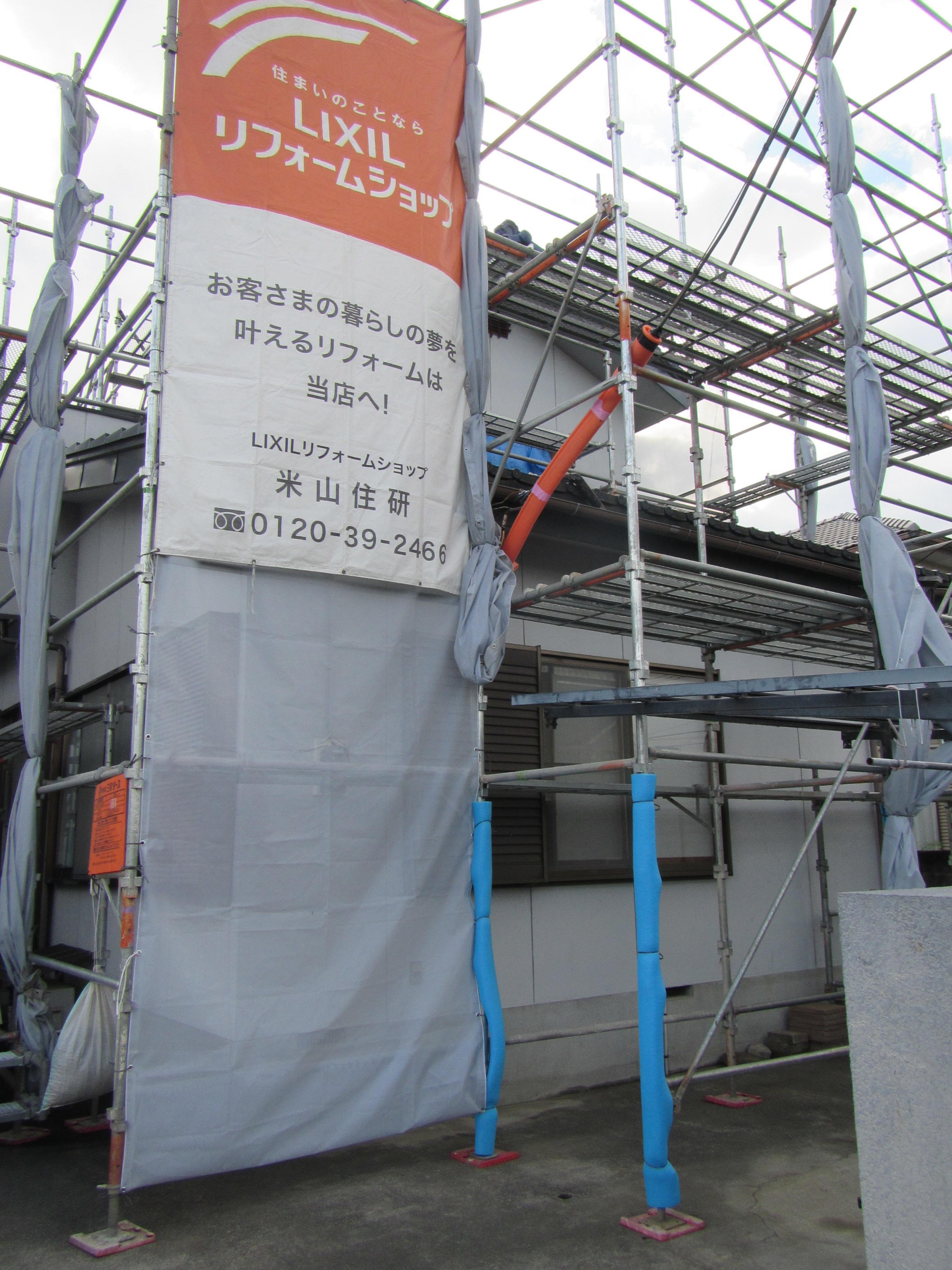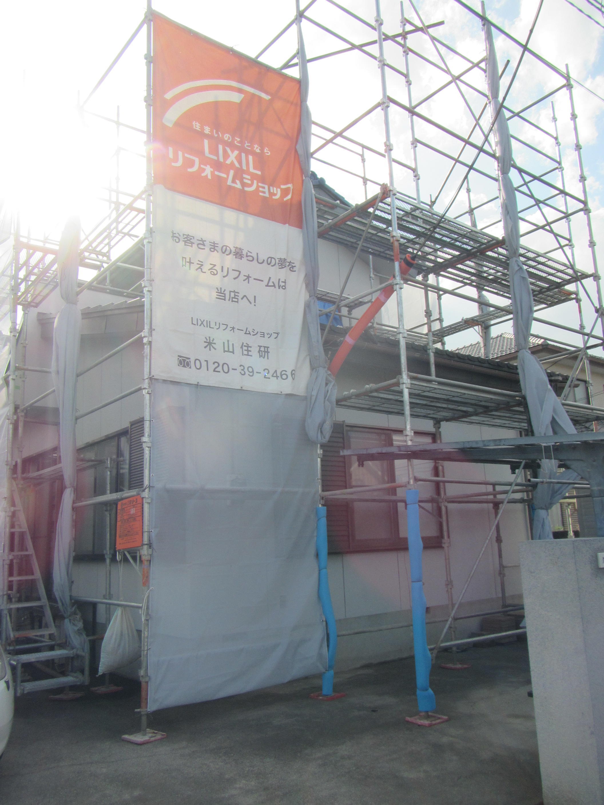 ↑2階を増改築し、屋根や樋も直すのでぐるっと足場が組まれています。