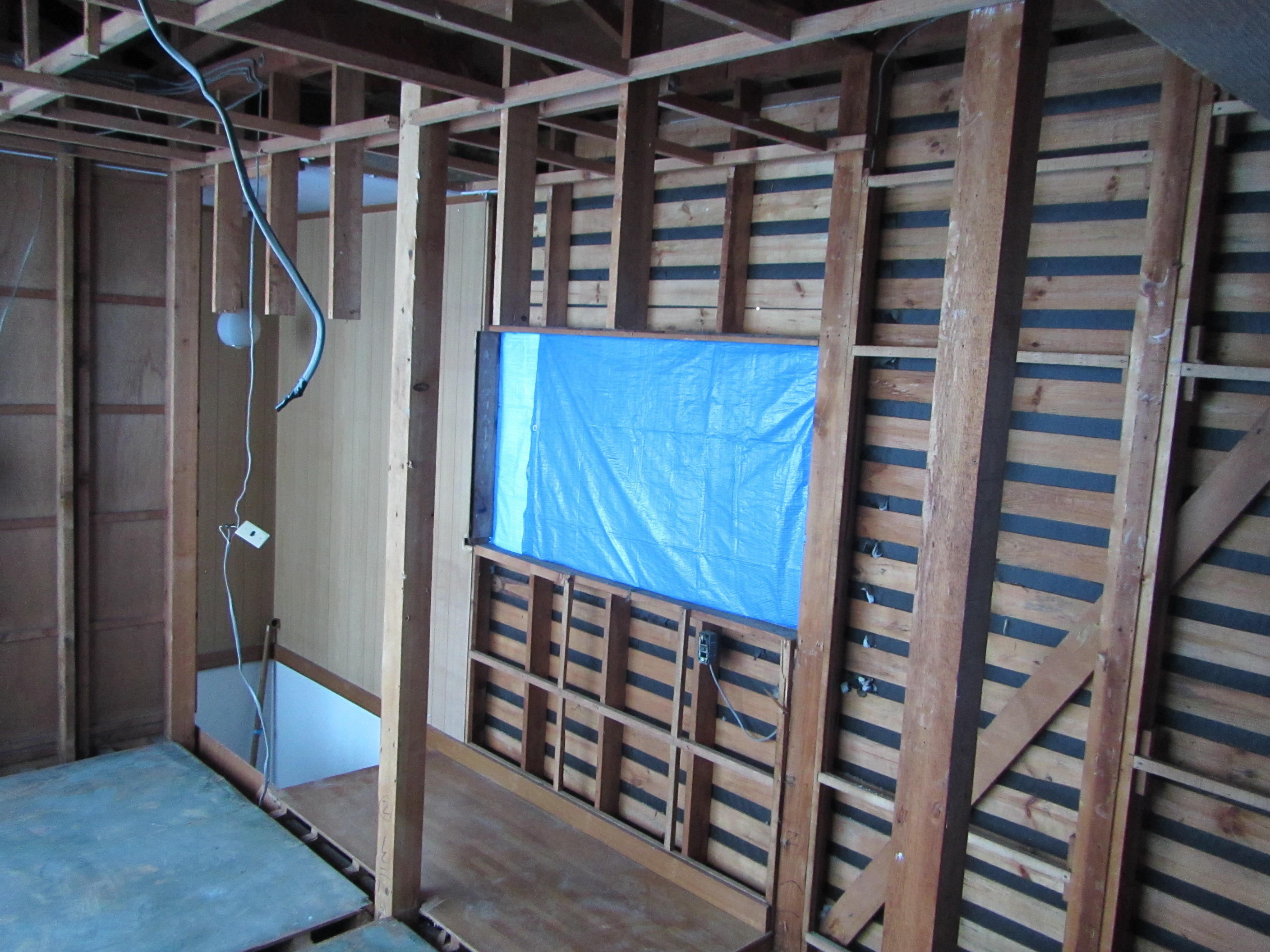 窓は撤去され、雨水の侵入を防ぐブルーシートで覆われています。