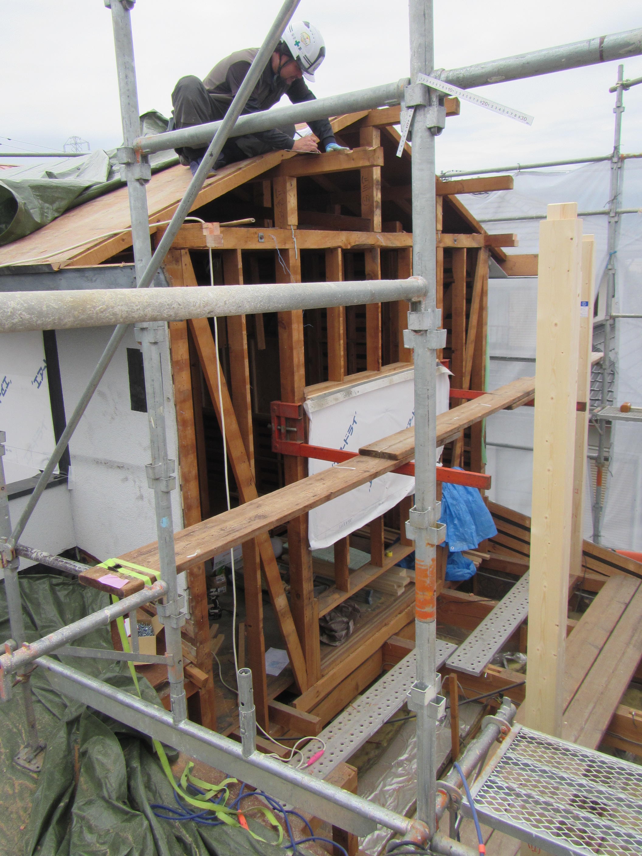 ↑既存の二階屋根とつなげるため、木材の継手部分(ほぞ)を加工する大工さん。
