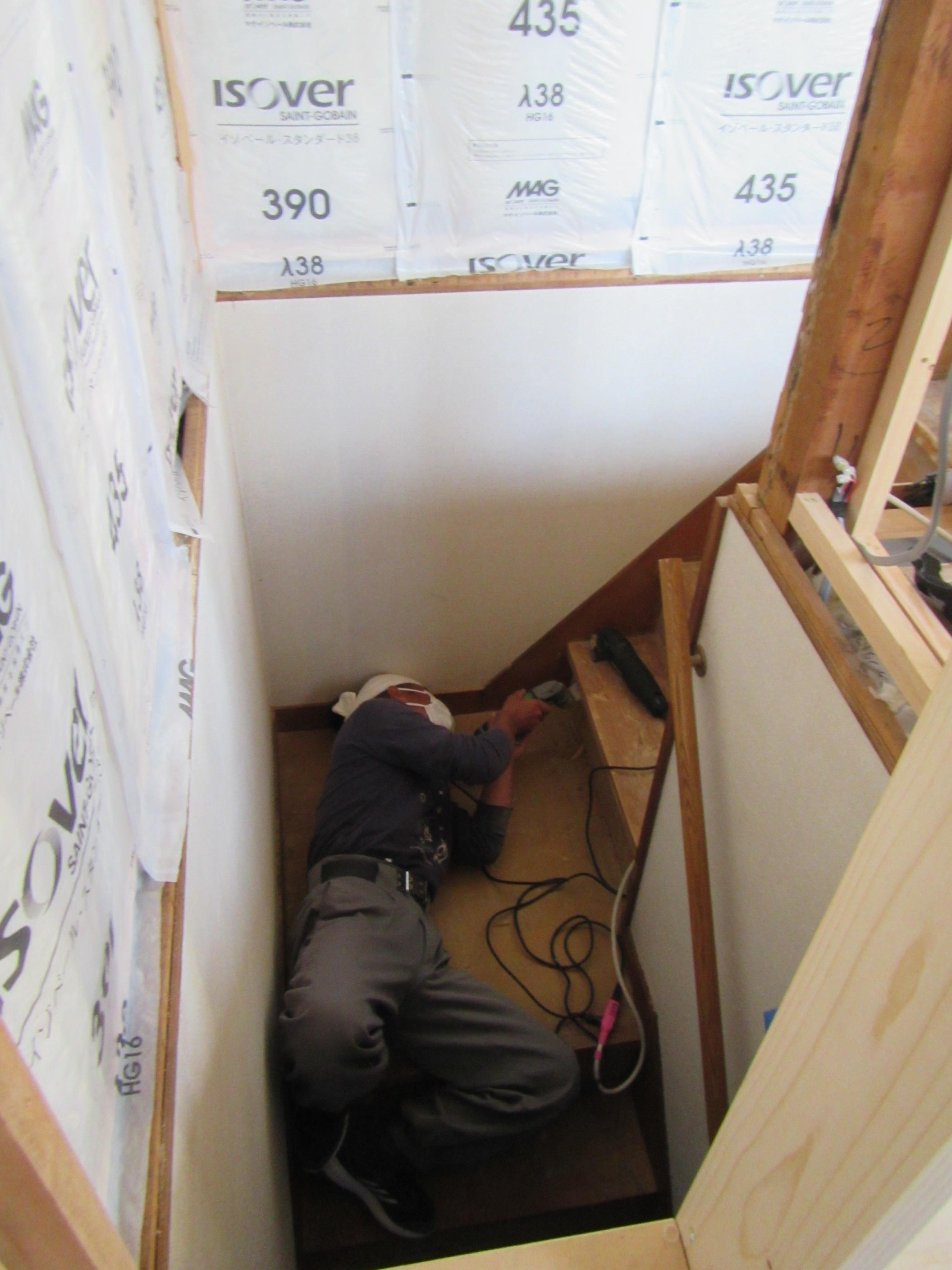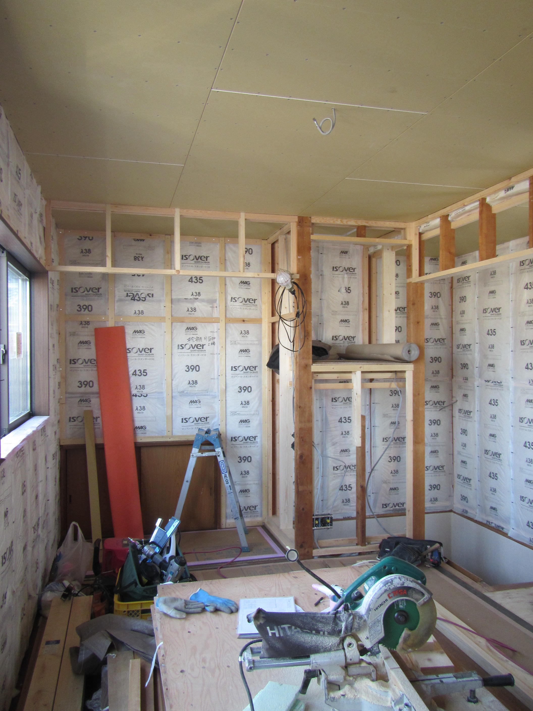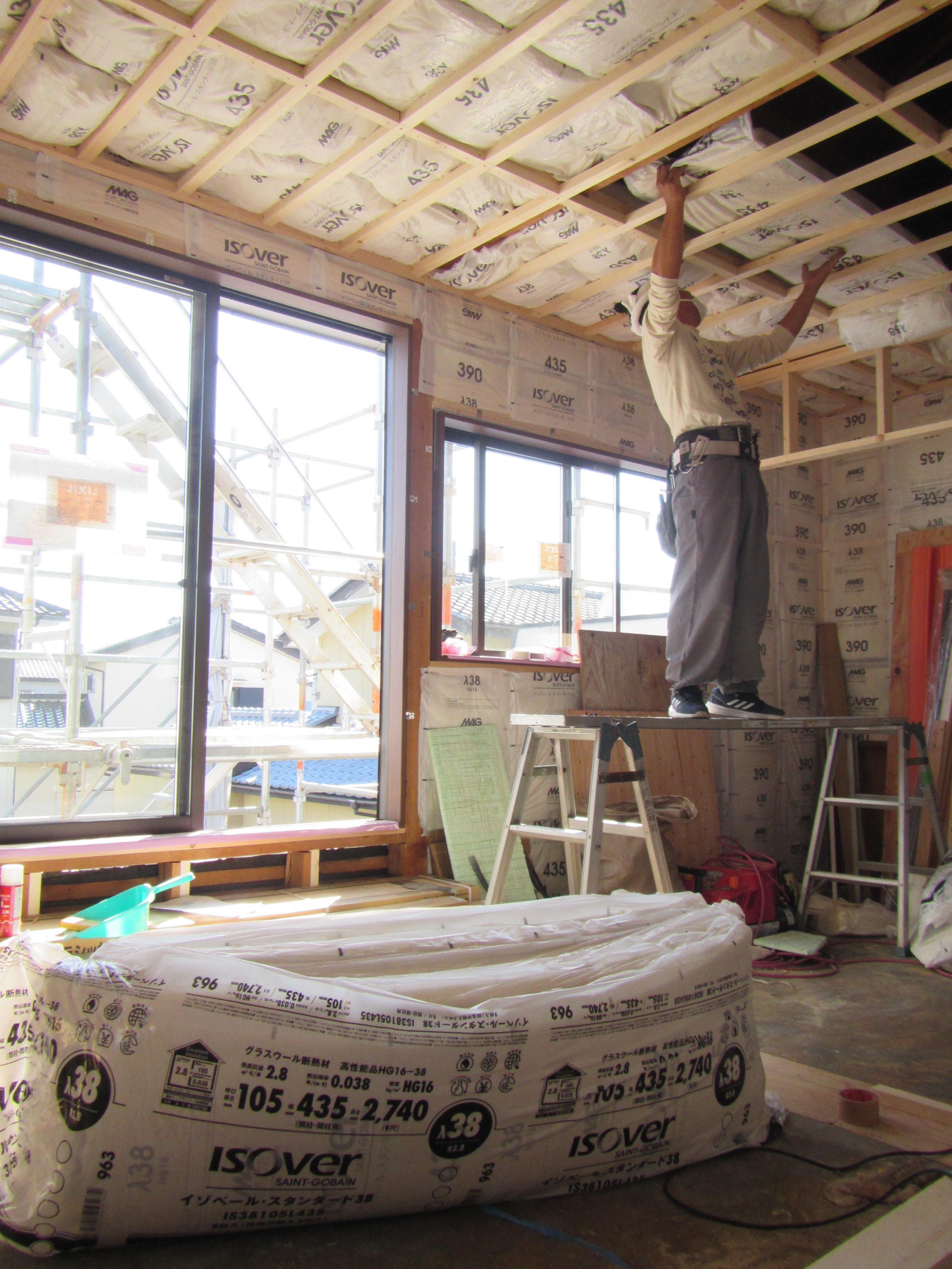 ↑ボードを貼る前には下地の間に断熱材を入れていきます。