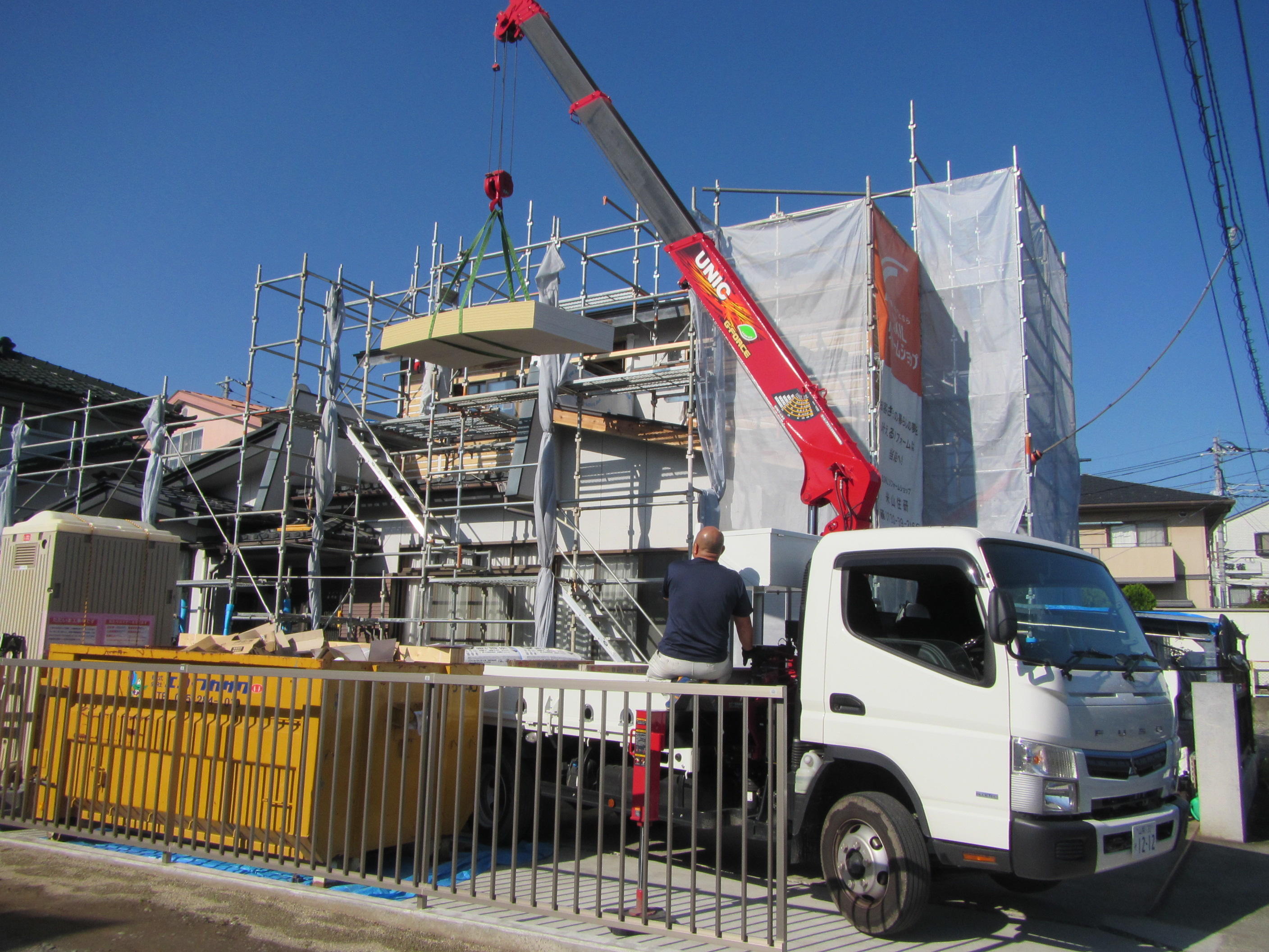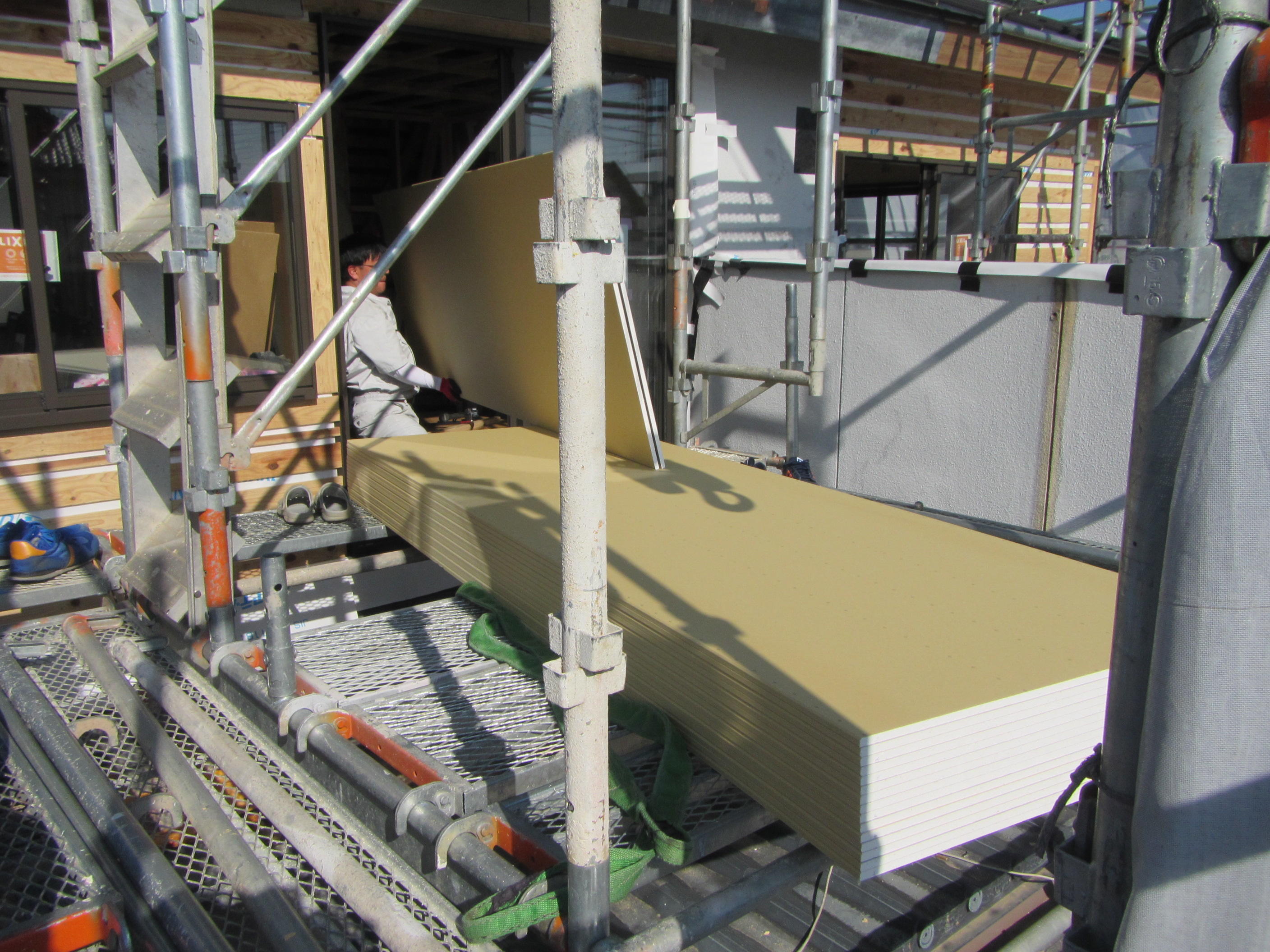 ↑お天気がいいと材料の搬入も安心です!この日は室内に貼る石膏ボードの搬入でした。