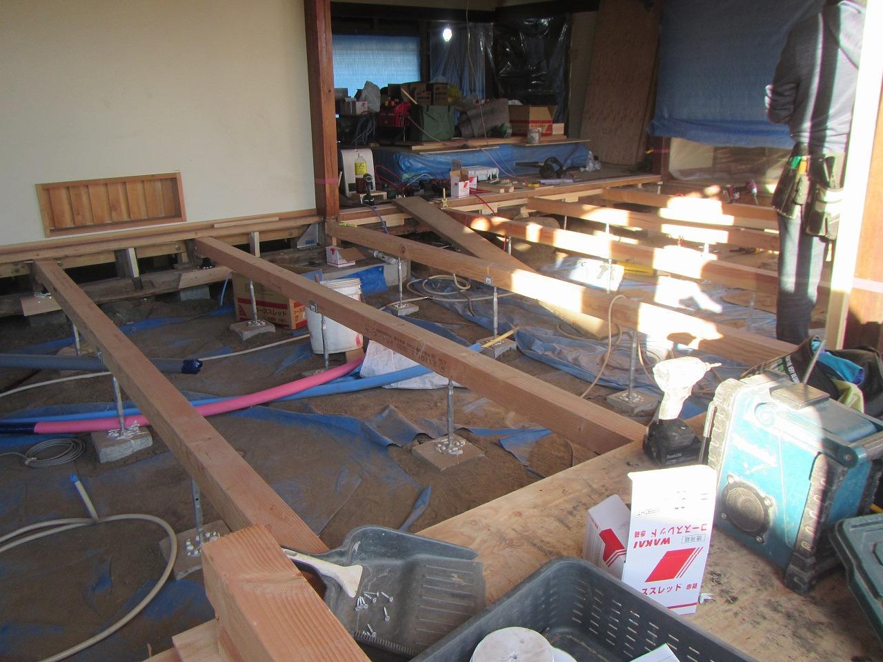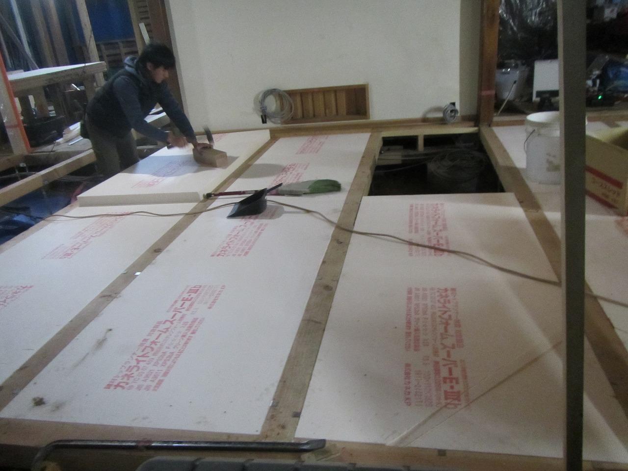 床の下地木材を施工して、100mmのスタイロ断熱材を敷設しました!