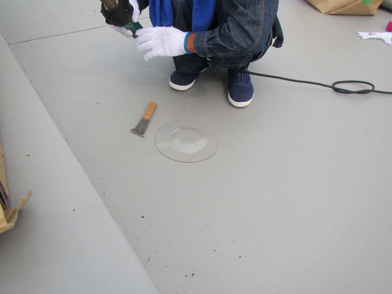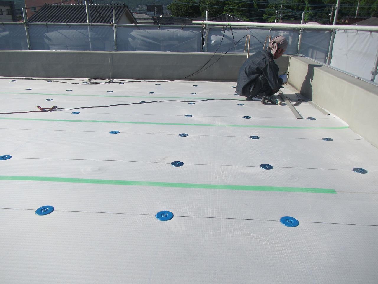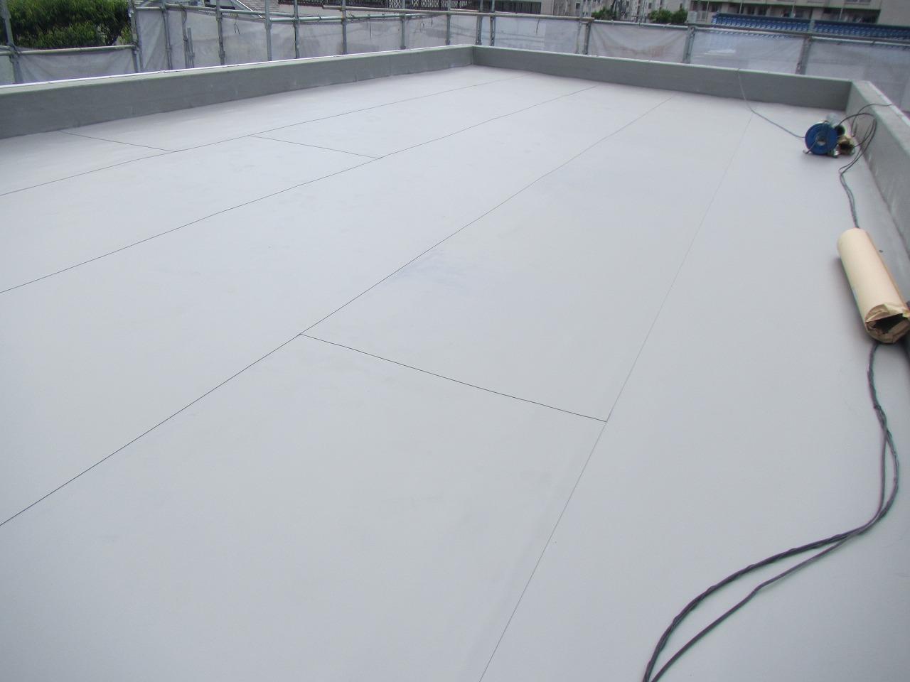 内部工事と並行して、外部工事の方は防水工事を行っています!塩ビシートを使ったシート防水です!