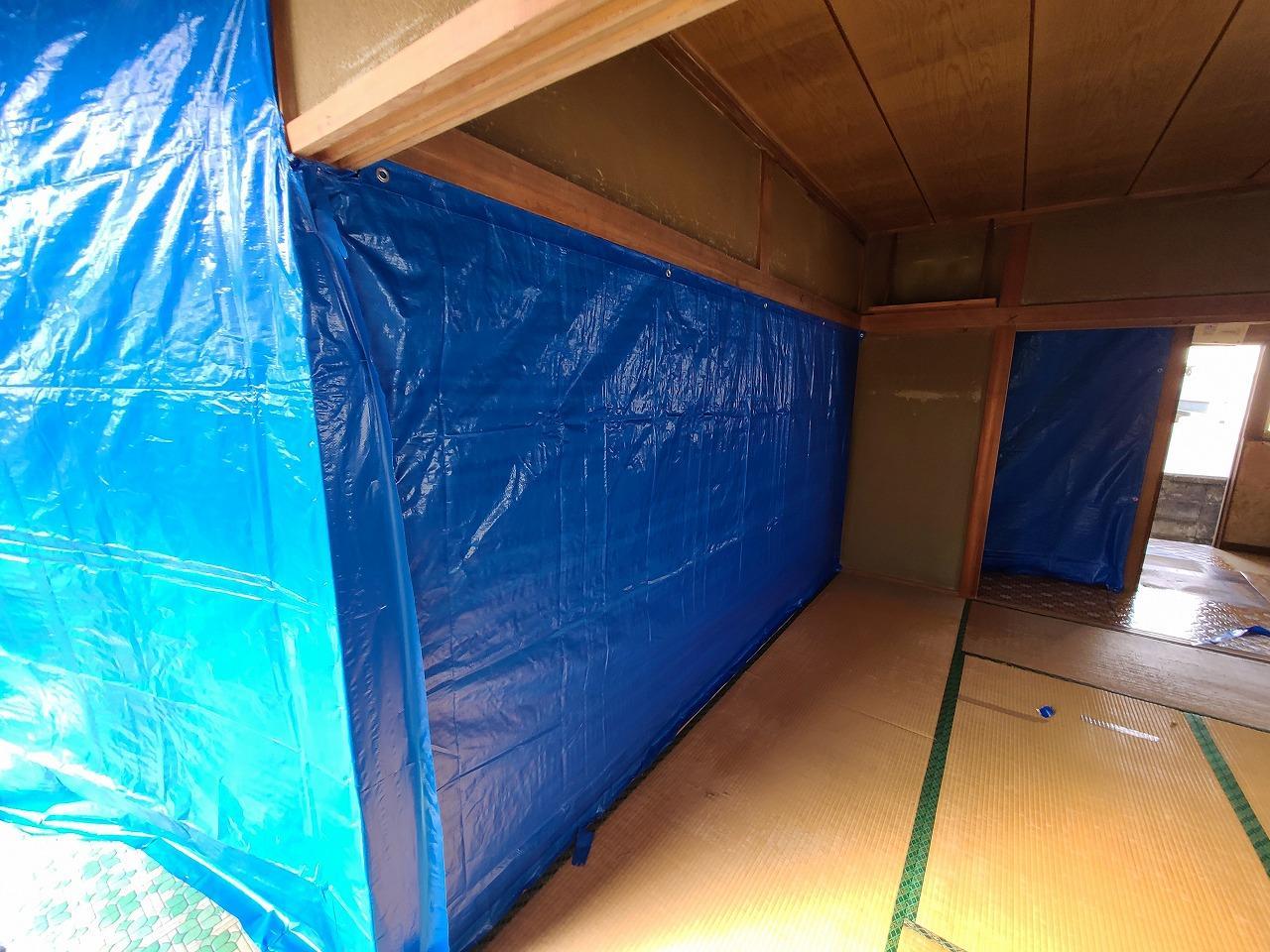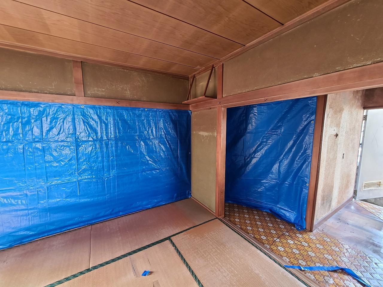 今回はお客様が住みながらの施工になるので、職人さんが入る前にお客様の生活スペースの確保の為と危険防止の為にシート養生を先行して行いました!