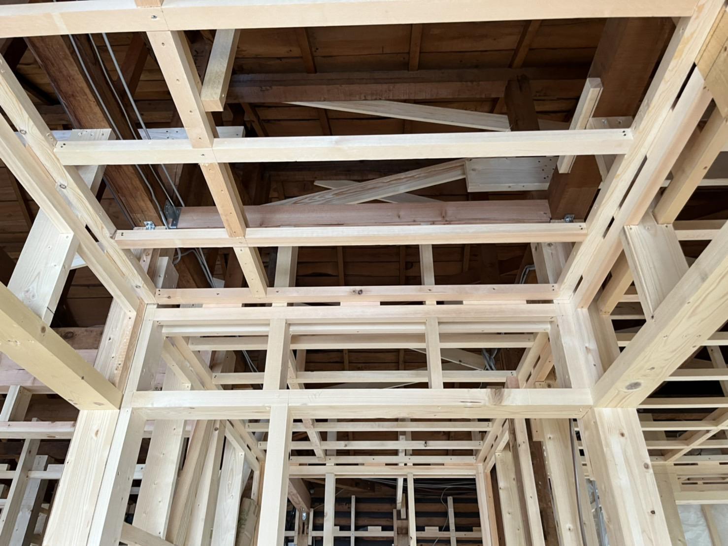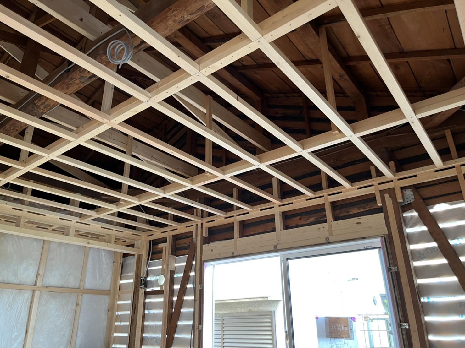 壁や屋根の補強が終わり、天井の下地を組み始めました。