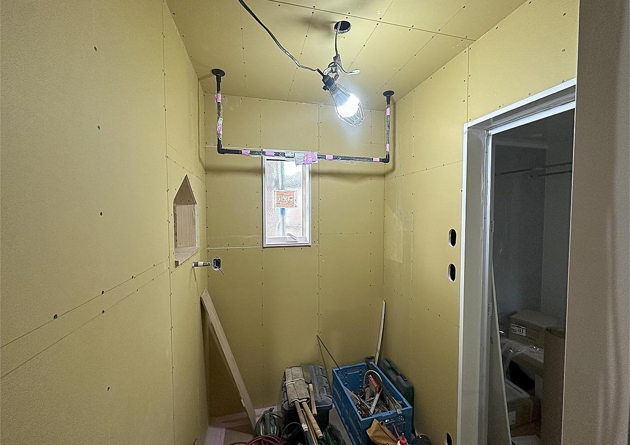 建具の枠が取り付けられ、壁と天井のプラスターボードが貼られて来ました。