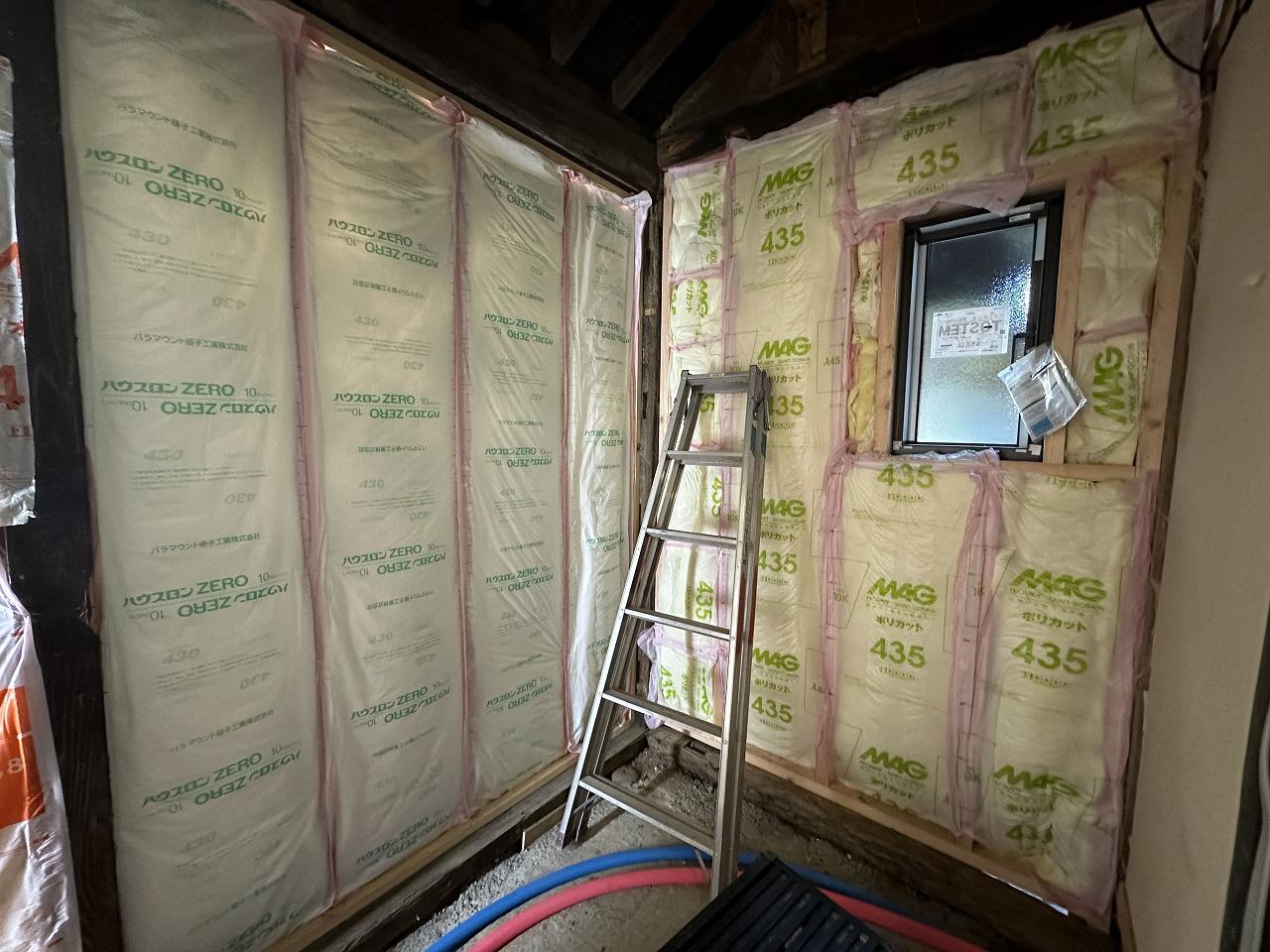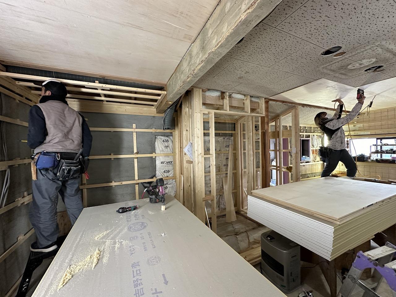 平行して一階は内装工事や設備機器取付の段取りをしています。