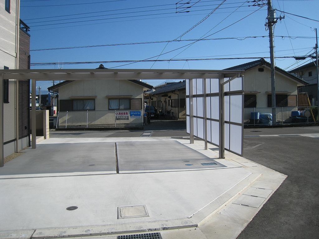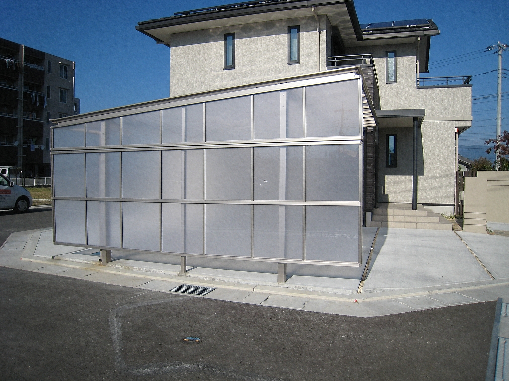 強い風の日や横なぐりの雨の日に威力を発揮するサイドパネルを既設のカーポートへ設置。愛車を風雨から守り、人の乗り降りの際も役立つスクリーンです。