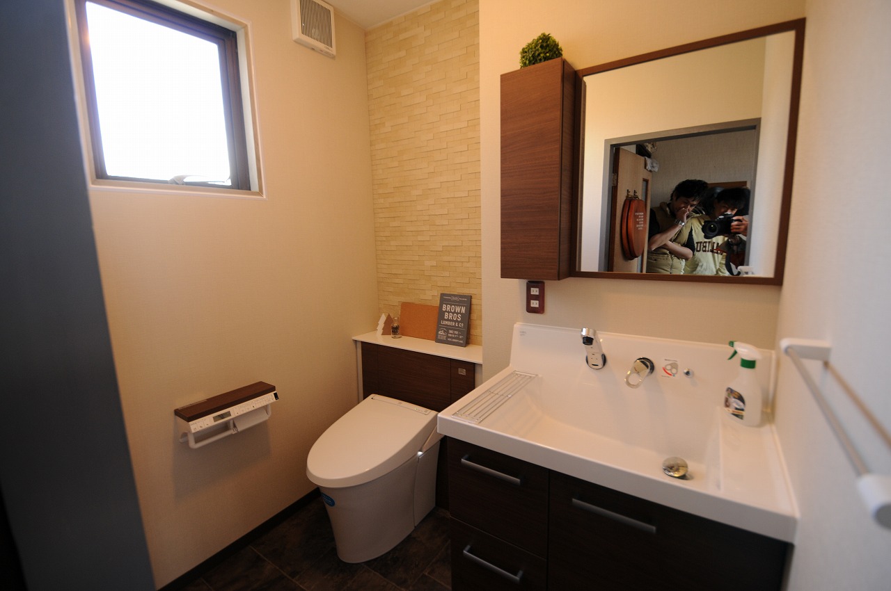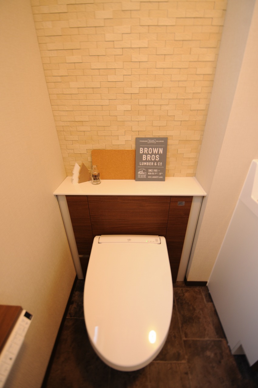 甲斐市のトイレ、洗面リフォームが完成しました! 床・壁共タイル仕上げだった空間を、木の質感漂うワンランクアップした空間に生まれ変わりました。