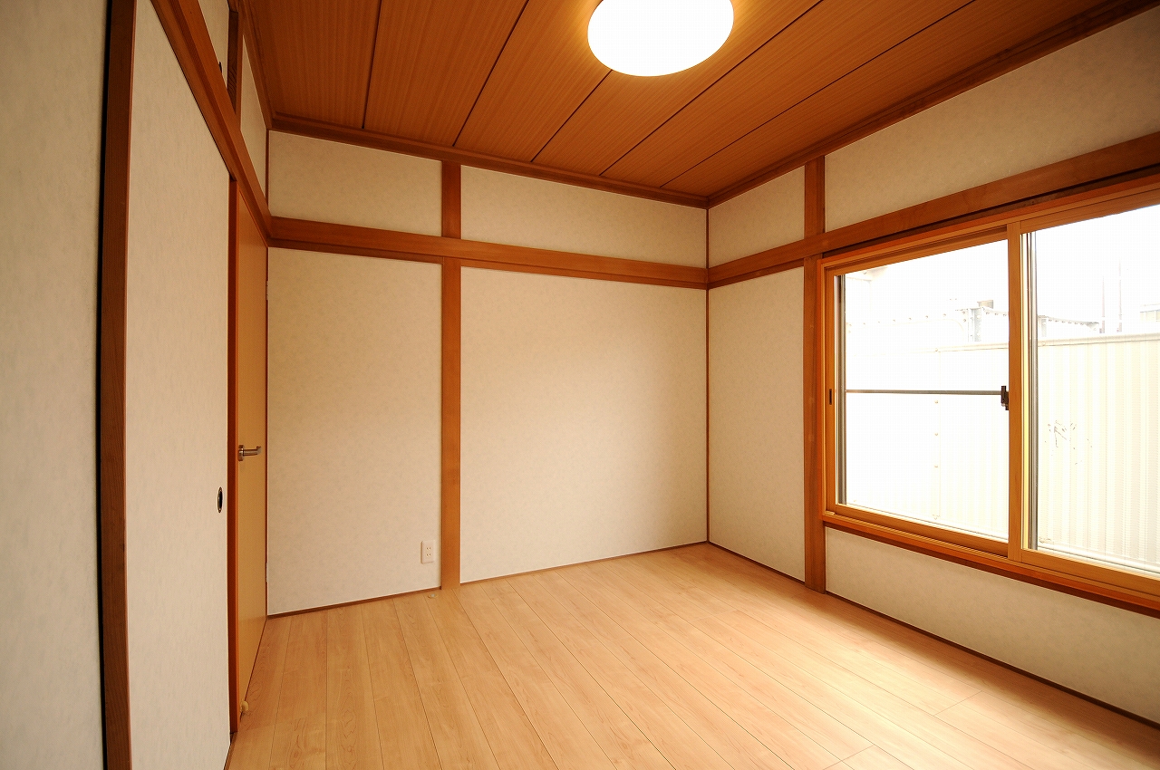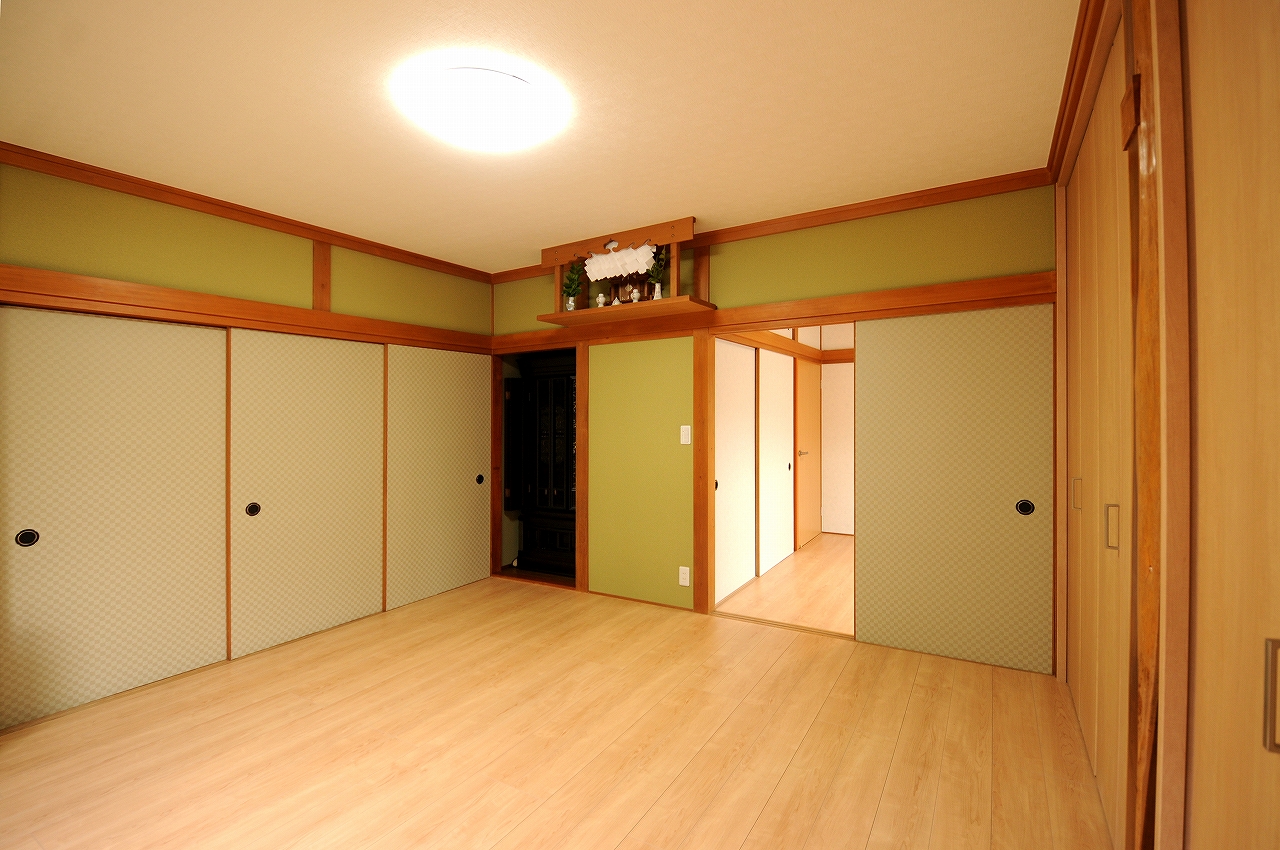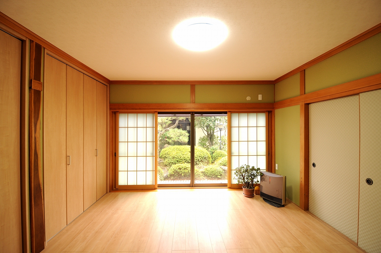 娘様家族との同居をきっかけにお母様のプライベート空間をリフォーム。もともと日当たり良かった8帖の客間はお母様専用のリビング空間へ。その北側にある4帖半の収納部屋は寝室へと生まれ変わりました。いずれもたたみ敷きだった和室からモダンな洋室へコンバージョン。内装だけでなくペアガラス仕様の内窓も設置したため断熱性能は大きく向上し、押入2つ分のクローゼットも備え付けたので収納量も抜群です。さらに、お孫さんからの要望もあったので浴室空間も安全でひろびろ快適空間にリフォームしました。