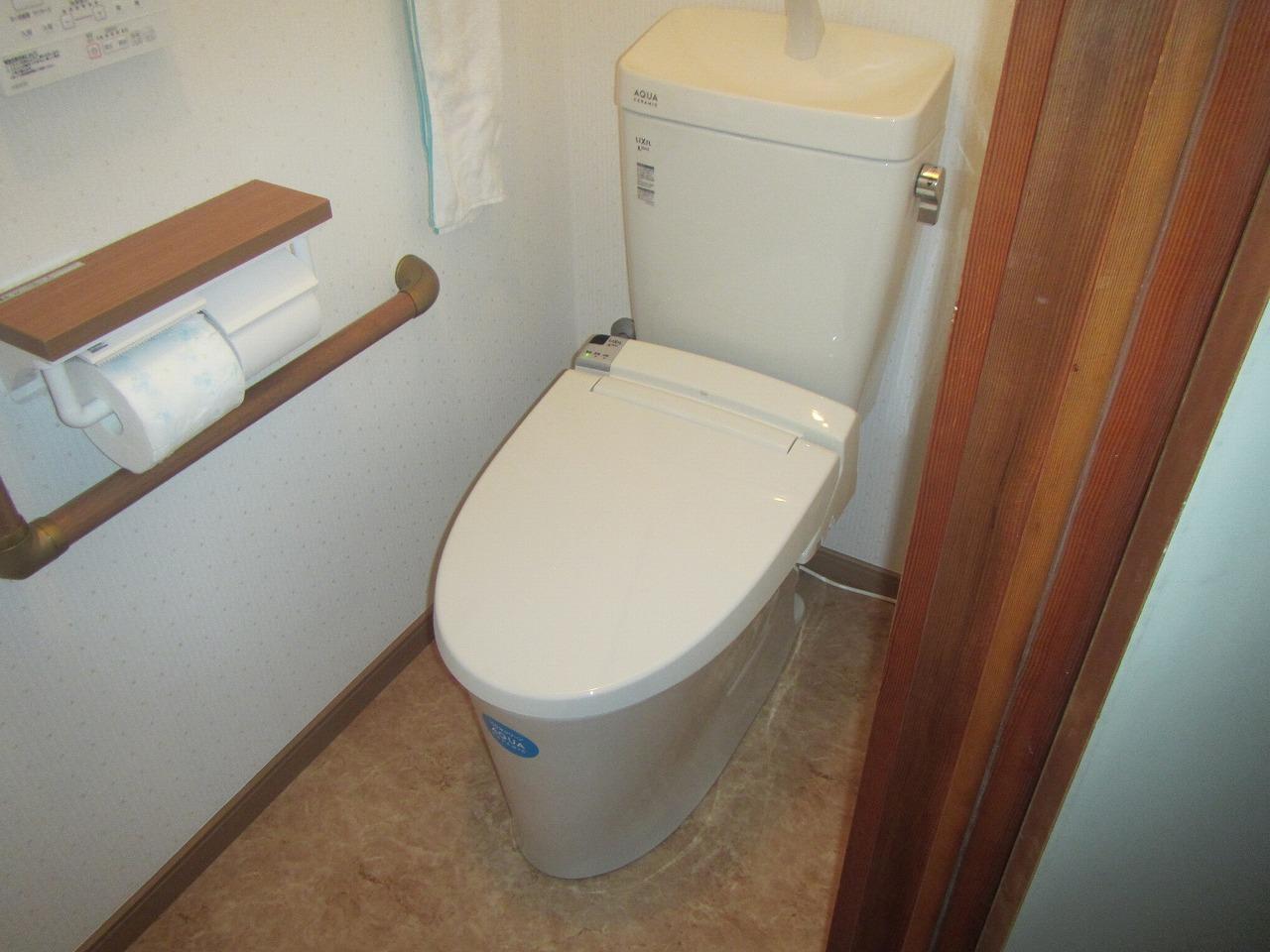 甲斐市でトイレ、階段のリフォームです 1階トイレの床もフラットにし、便器も交換。そして階段には手摺りを設置しました。